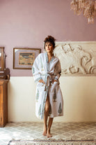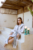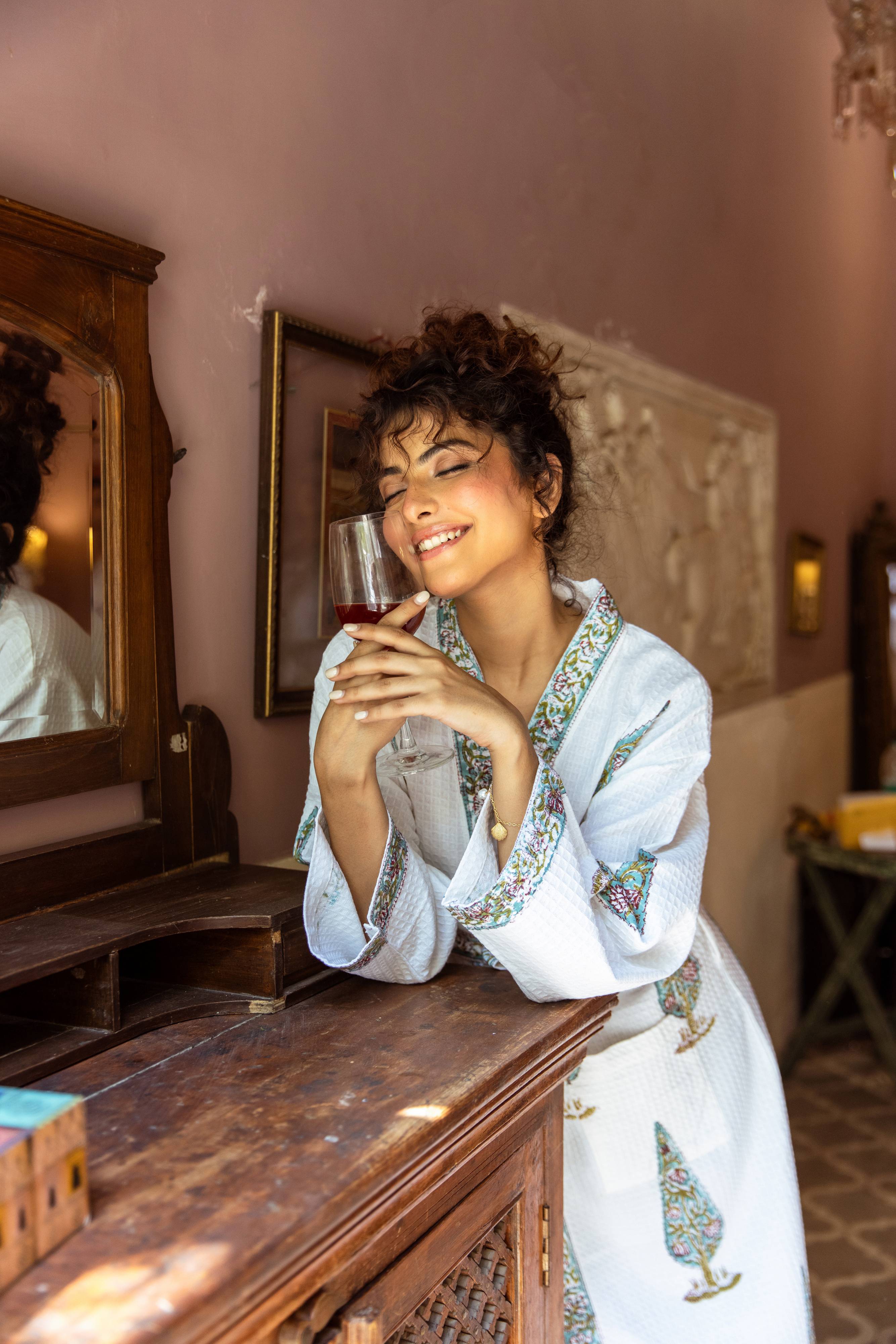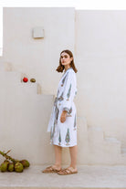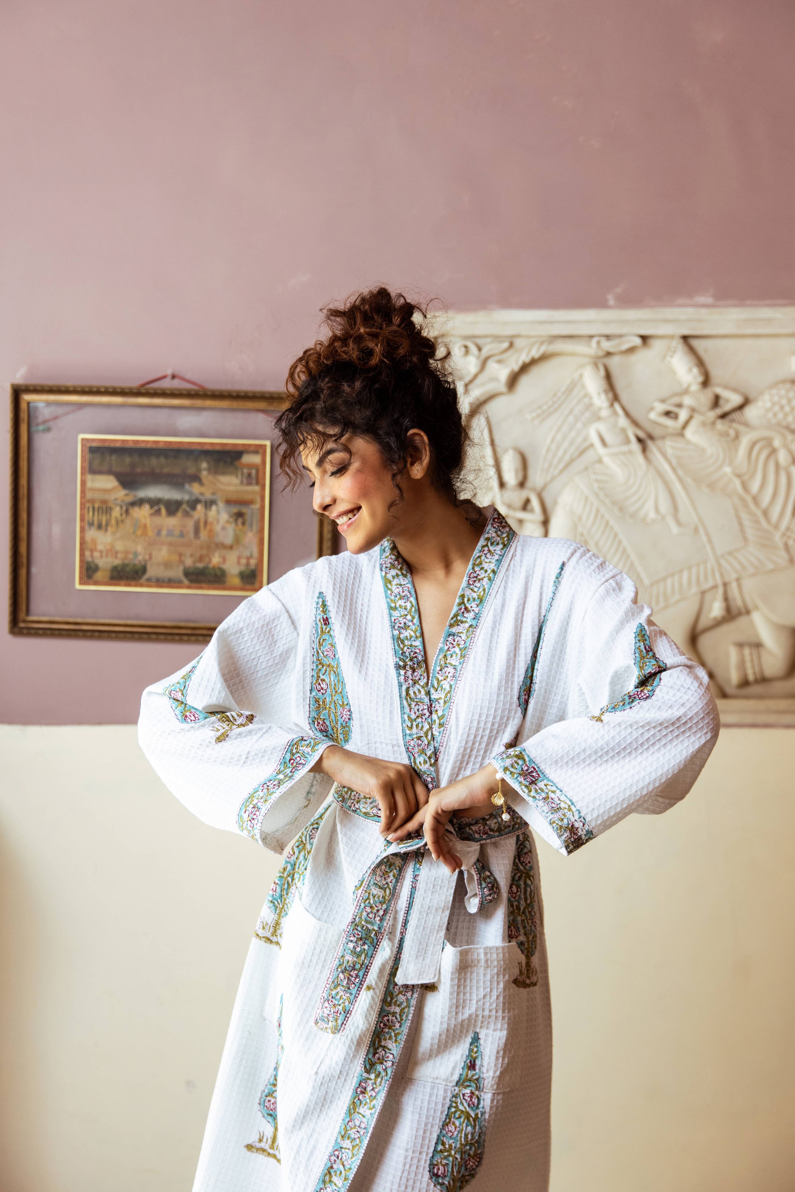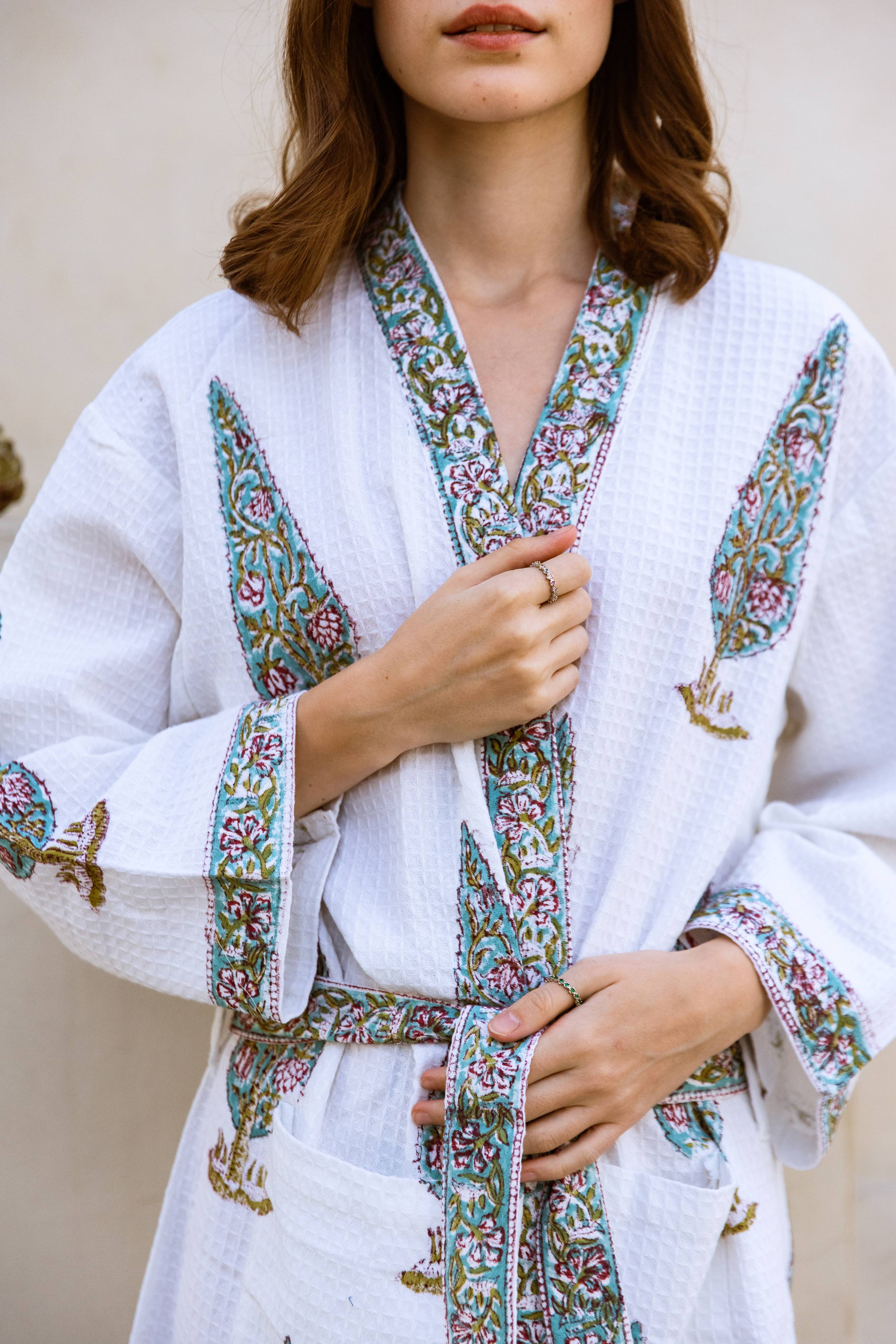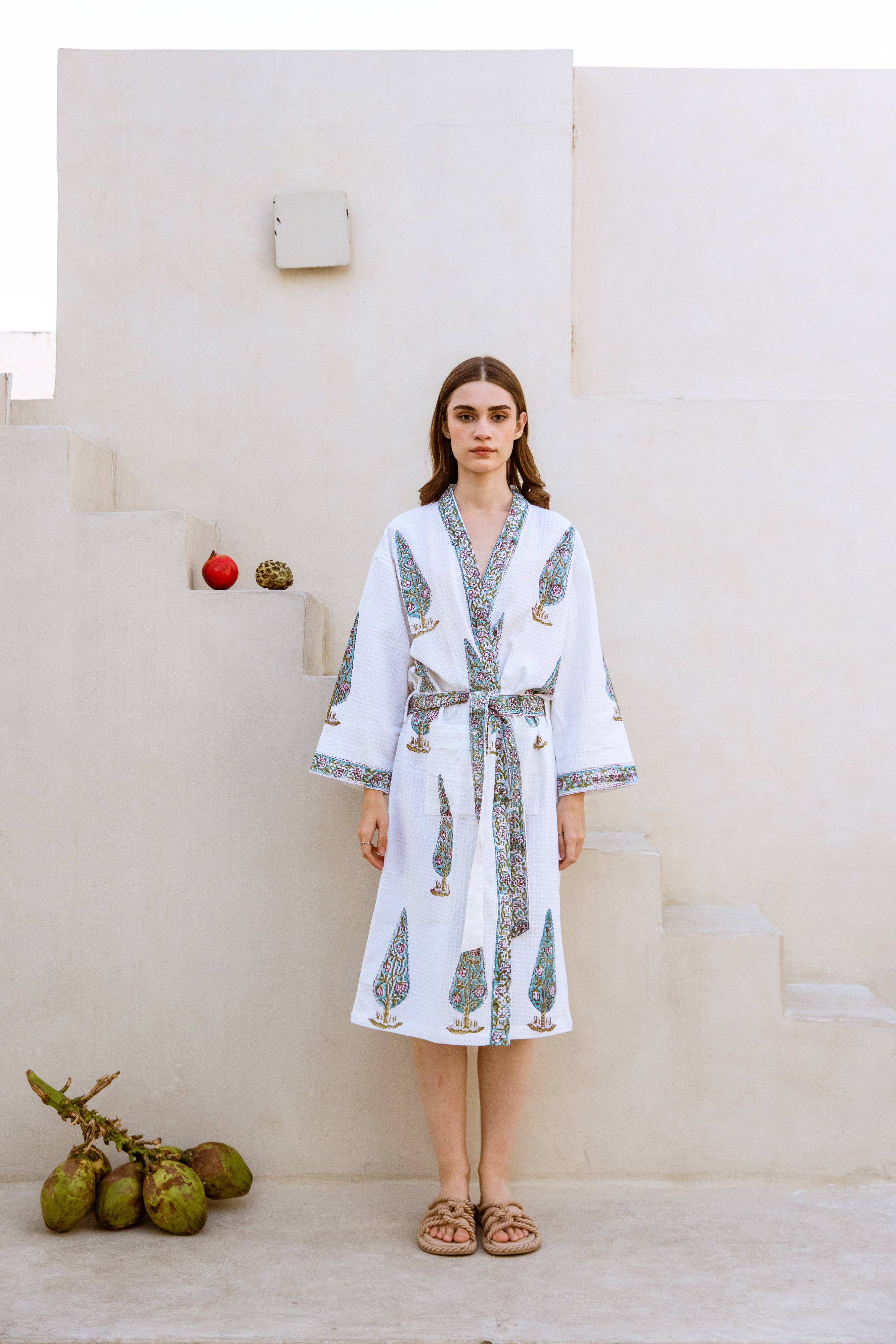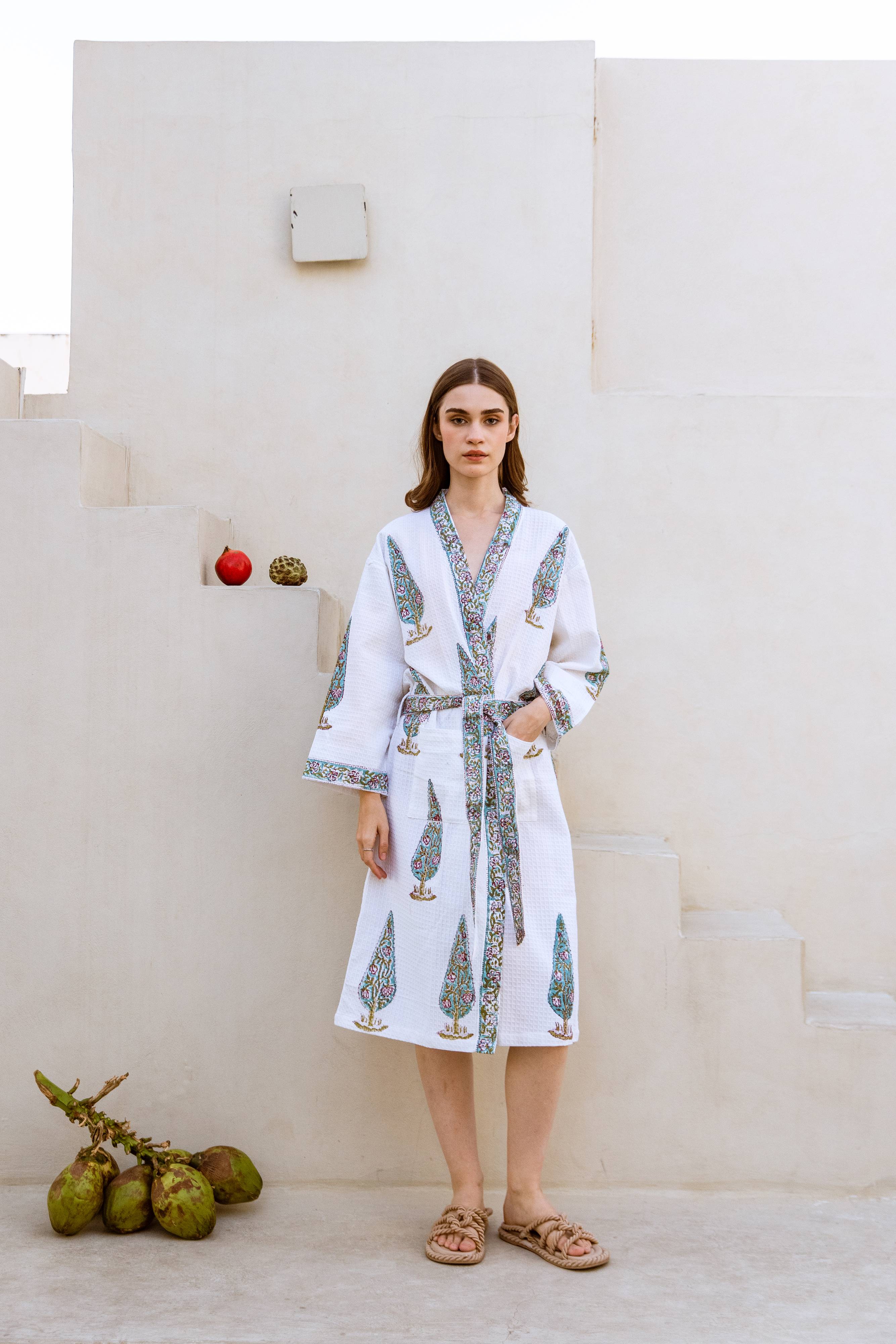 Picture yourself enveloped in the serene atmosphere of a cypress grove, in our luxurious 100% cotton waffle hand block printed bathrobe.