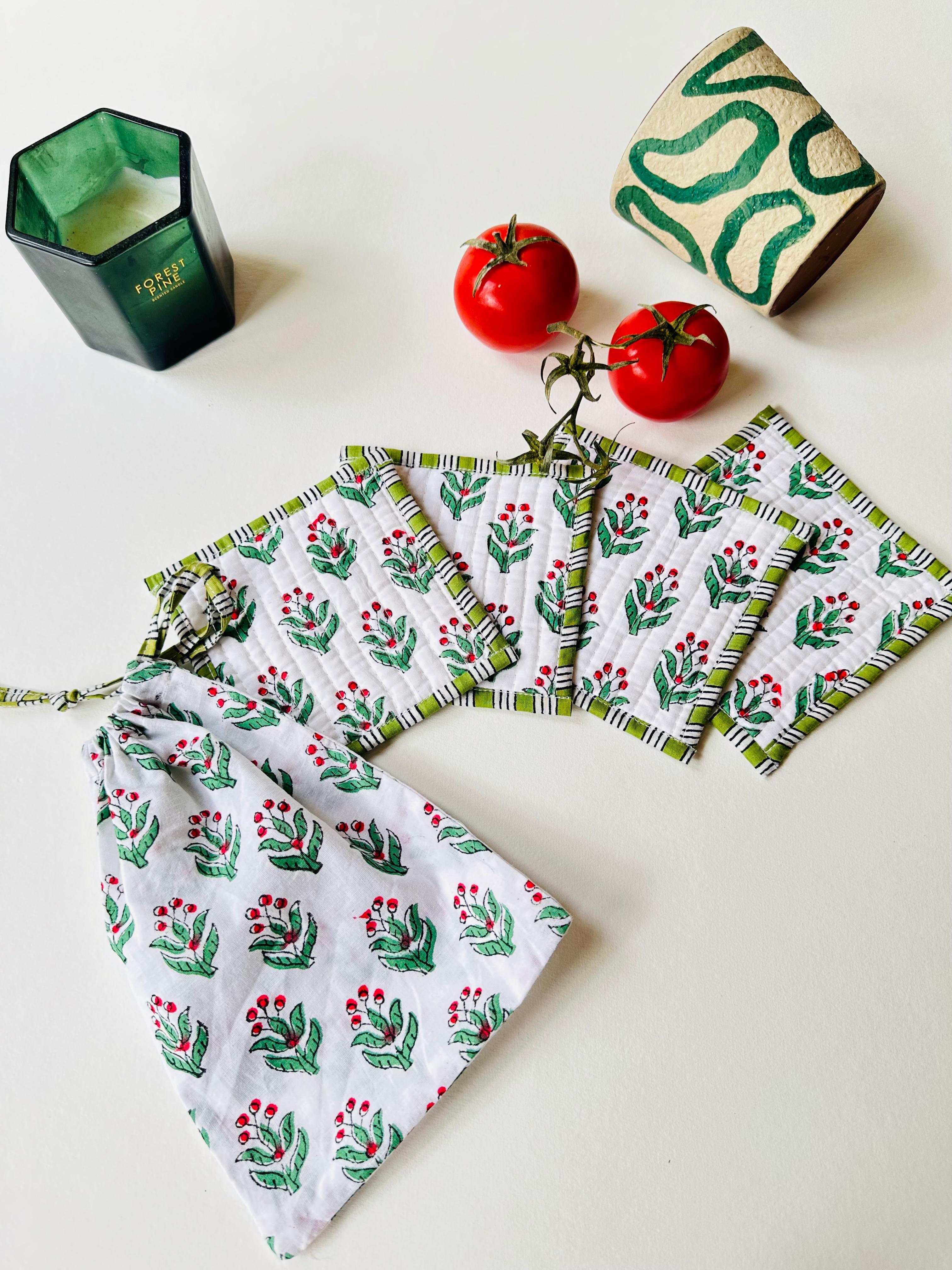 Introducing our exquisite set of 4 Floral Print Coasters, featuring a beautiful floral print, meticulously hand block printed by skilled artisans from India on 100% pure cotton.