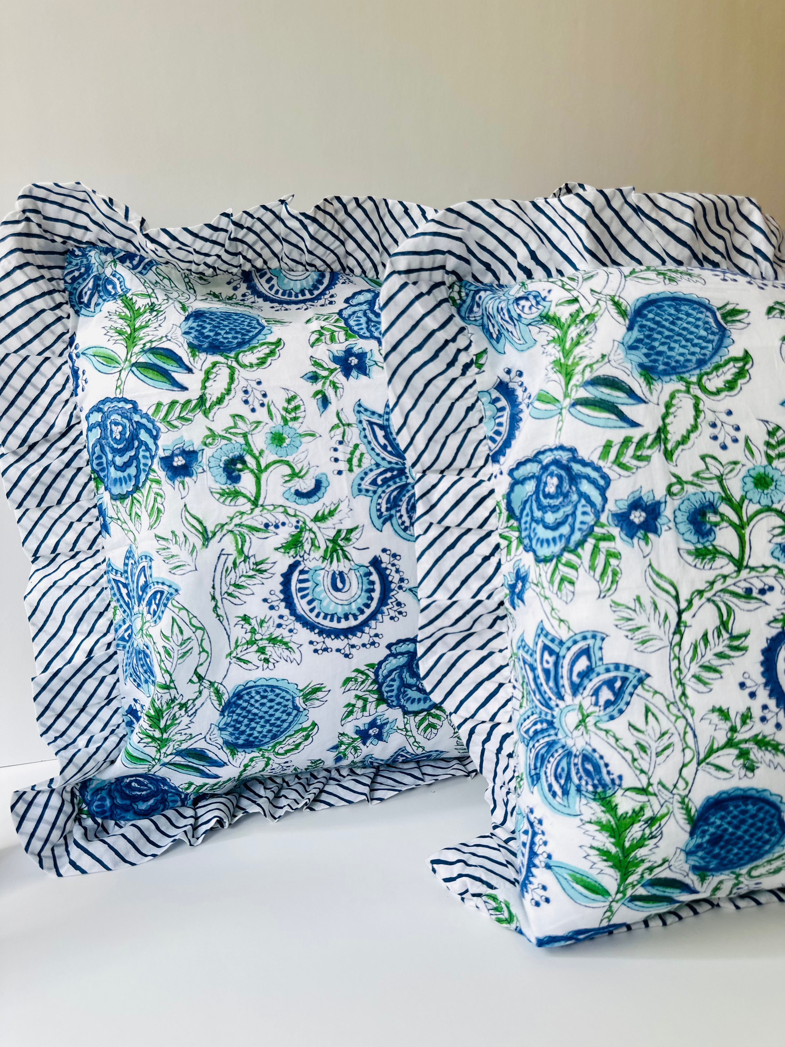 Elevate your interiors with the timeless beauty of our Tranquil Blue Blossom frilled cushion covers.