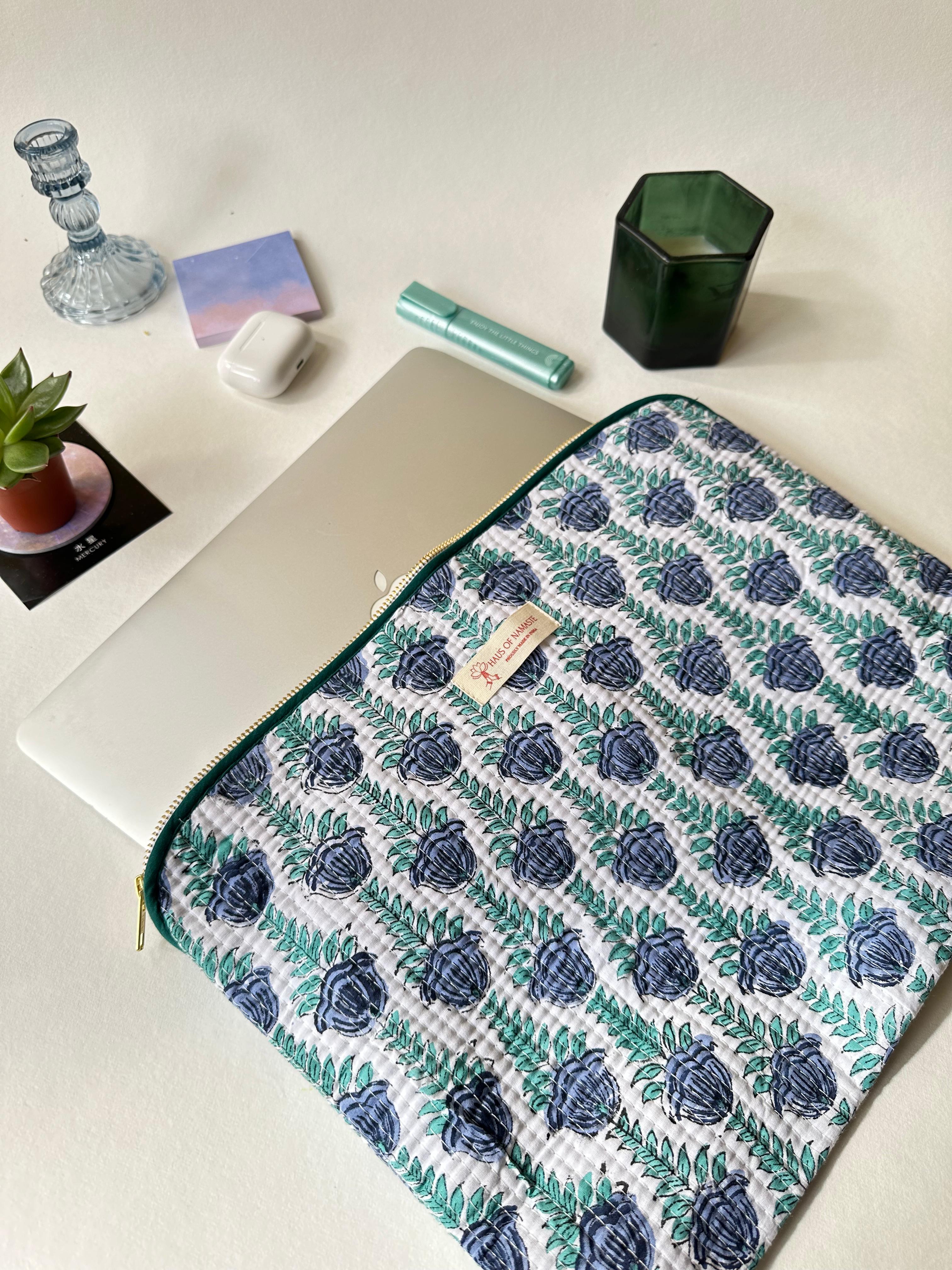 Ready to turn heads wherever you go? Get your hands on our Sapphire Vineyard Laptop Bag today. Adorned with a lush blue wildflower print intertwined with delicate green climbers, this laptop bag is a true masterpiece, reminiscent of a picturesque vineyard in full bloom.