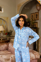 Elevate your lounge wear collection with our Blue Quail printed night suit, often seen as a symbol of peace, harmony, and tranquility.
