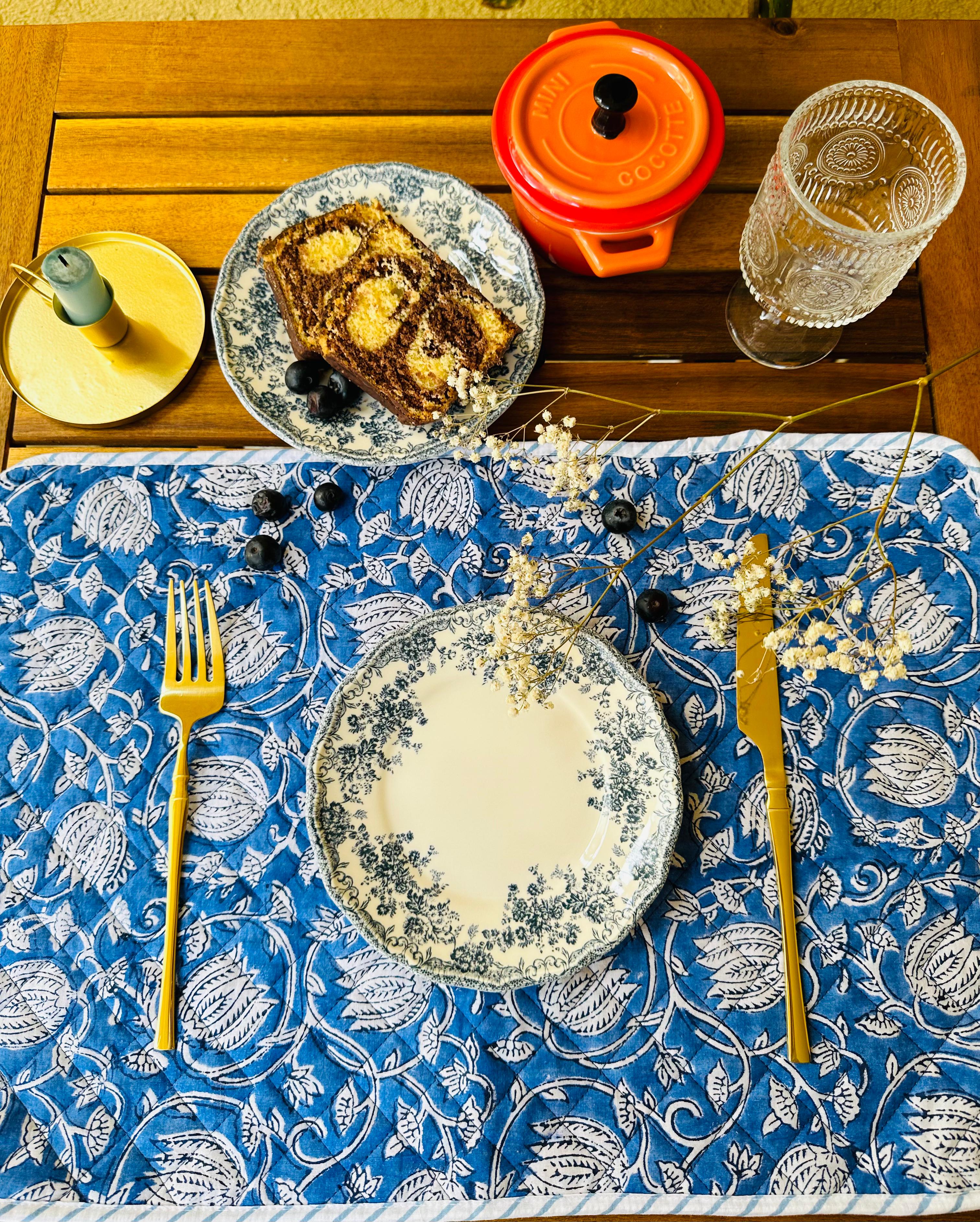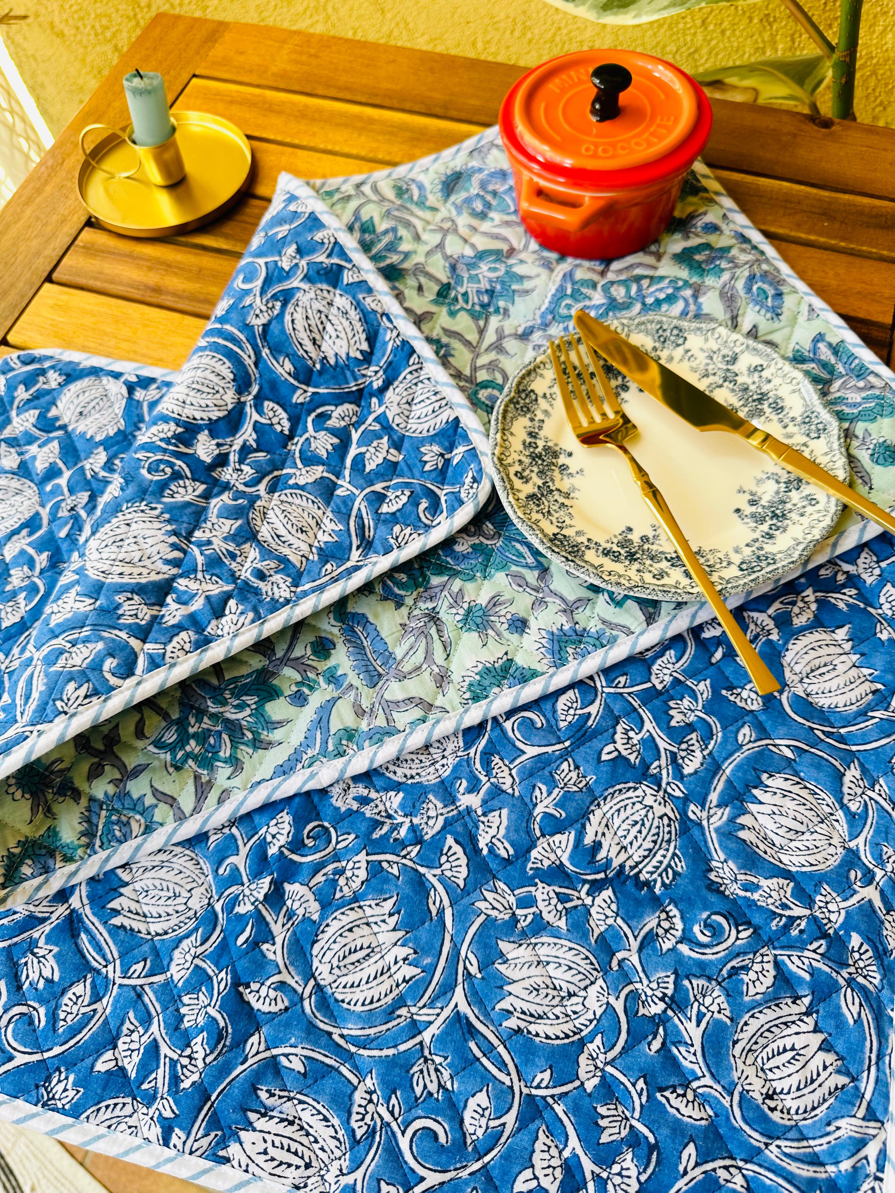 Our quilted placemats are crafted from 100% pure cotton and meticulously hand block printed by skilled artisans from India, ensuring every piece is made with love and care.