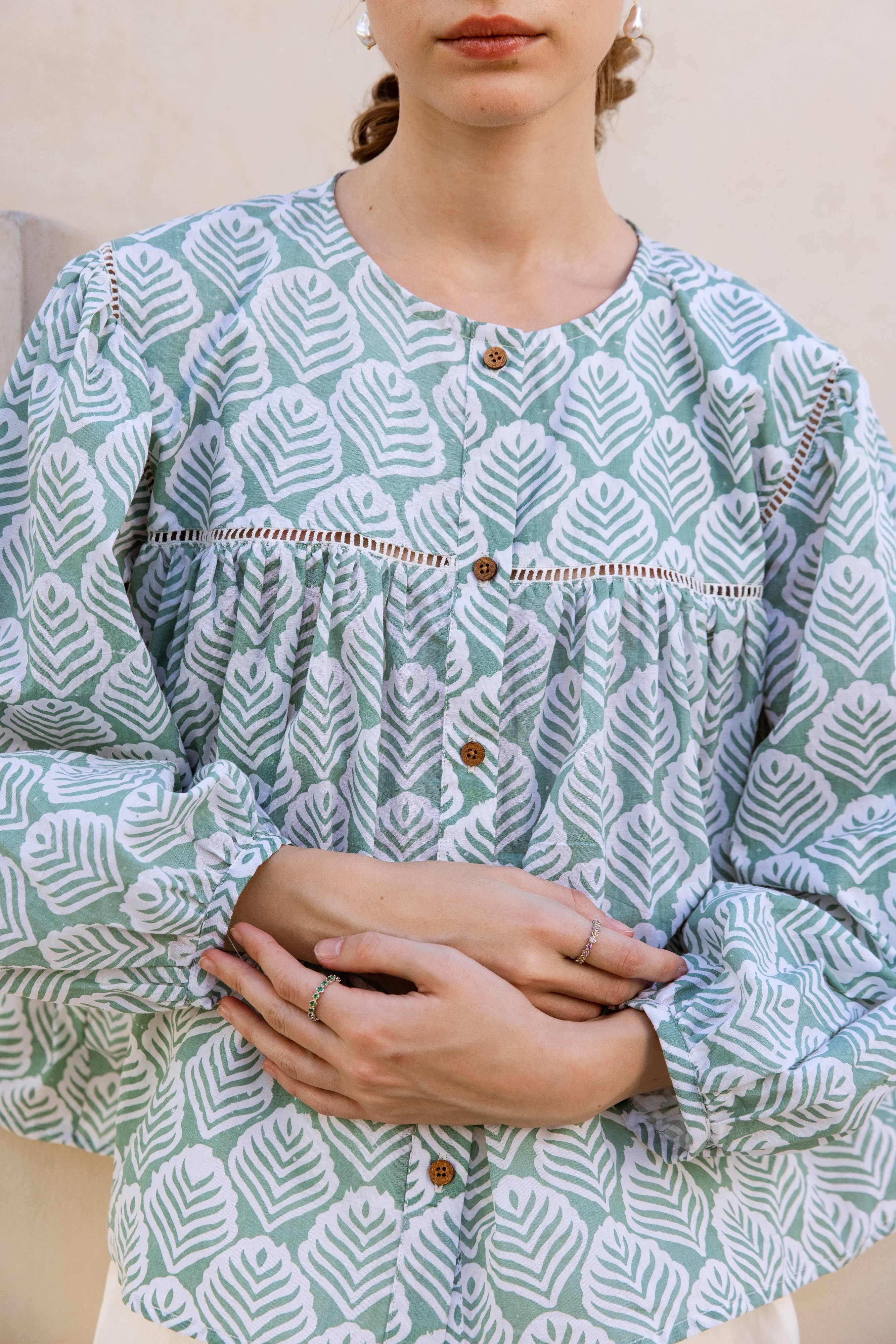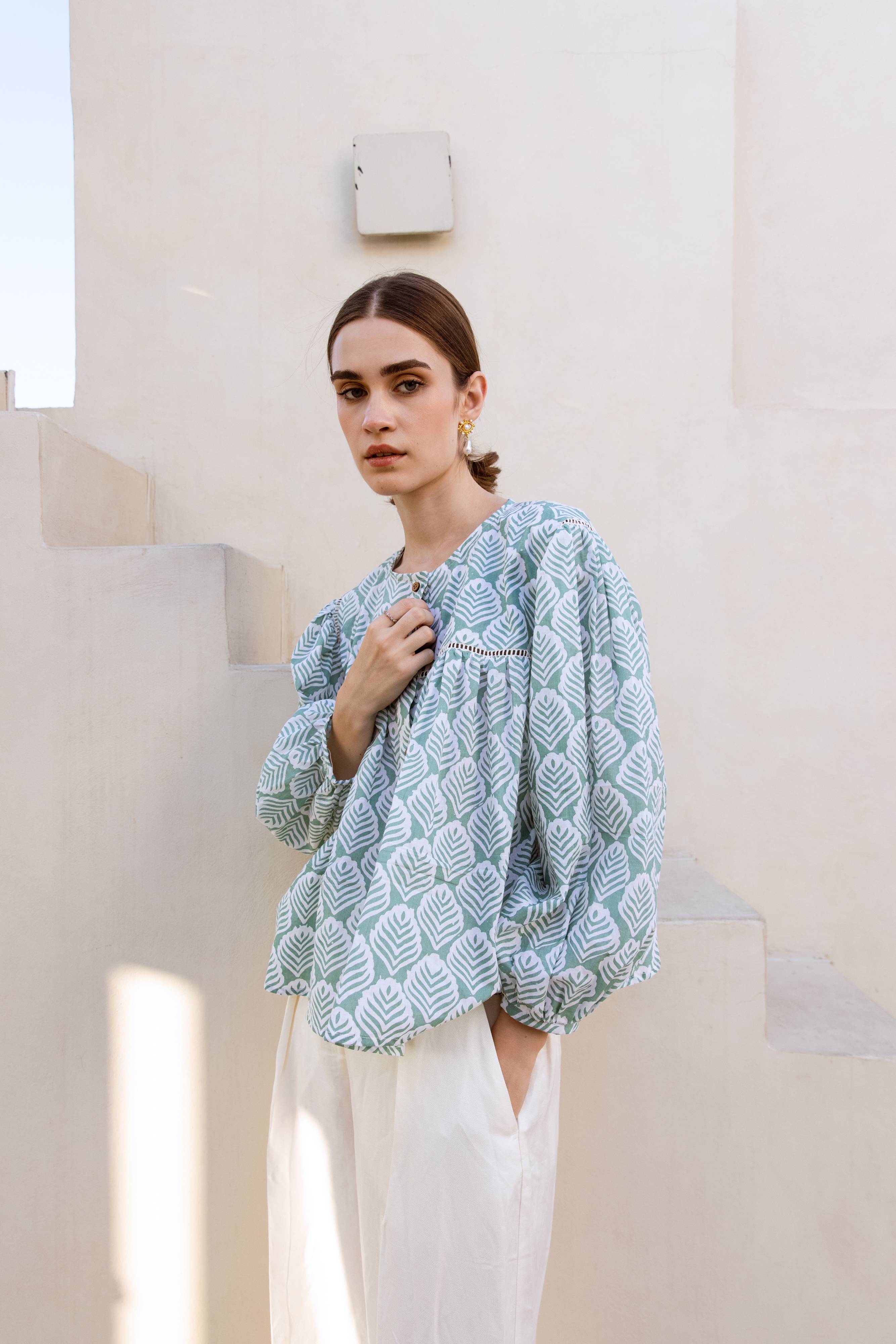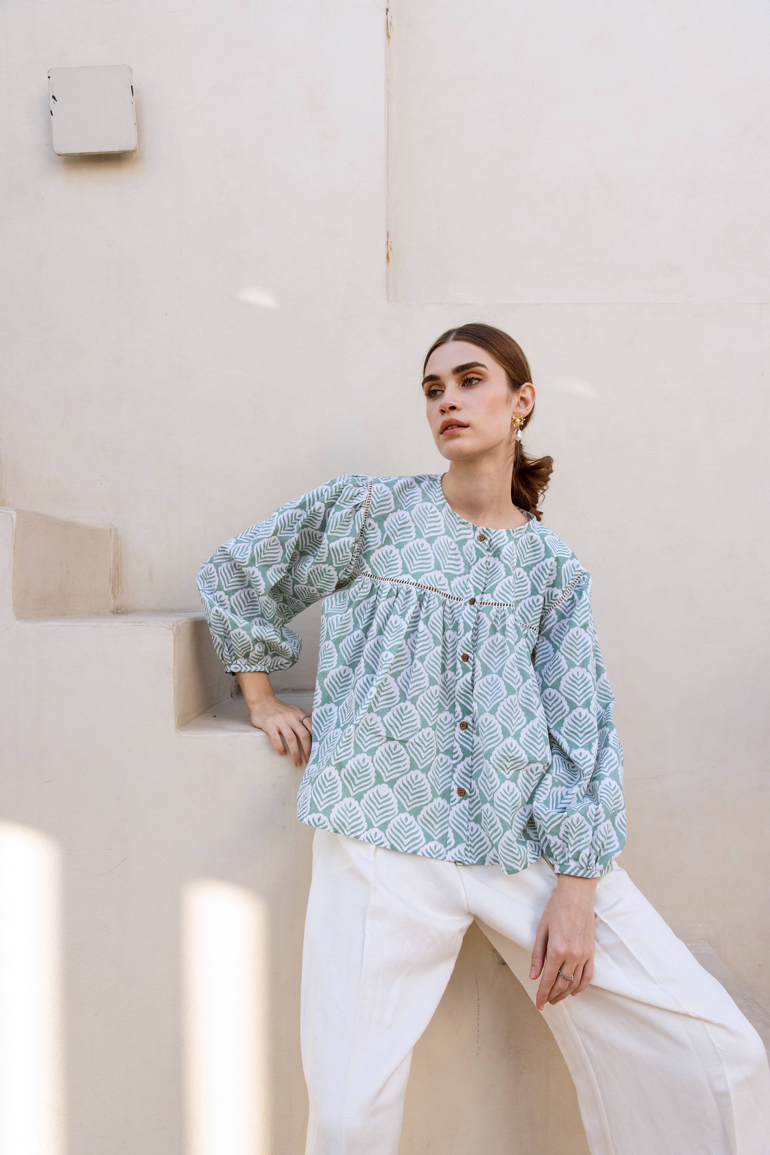 Introducing Isha — a graceful sage green balloon shirt crafted in 100% premium cotton and hand block printed with delicate leaf motifs that symbolize renewal and new beginnings, inspired by the first tender leaves of spring.