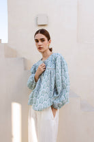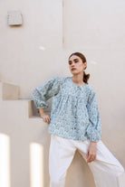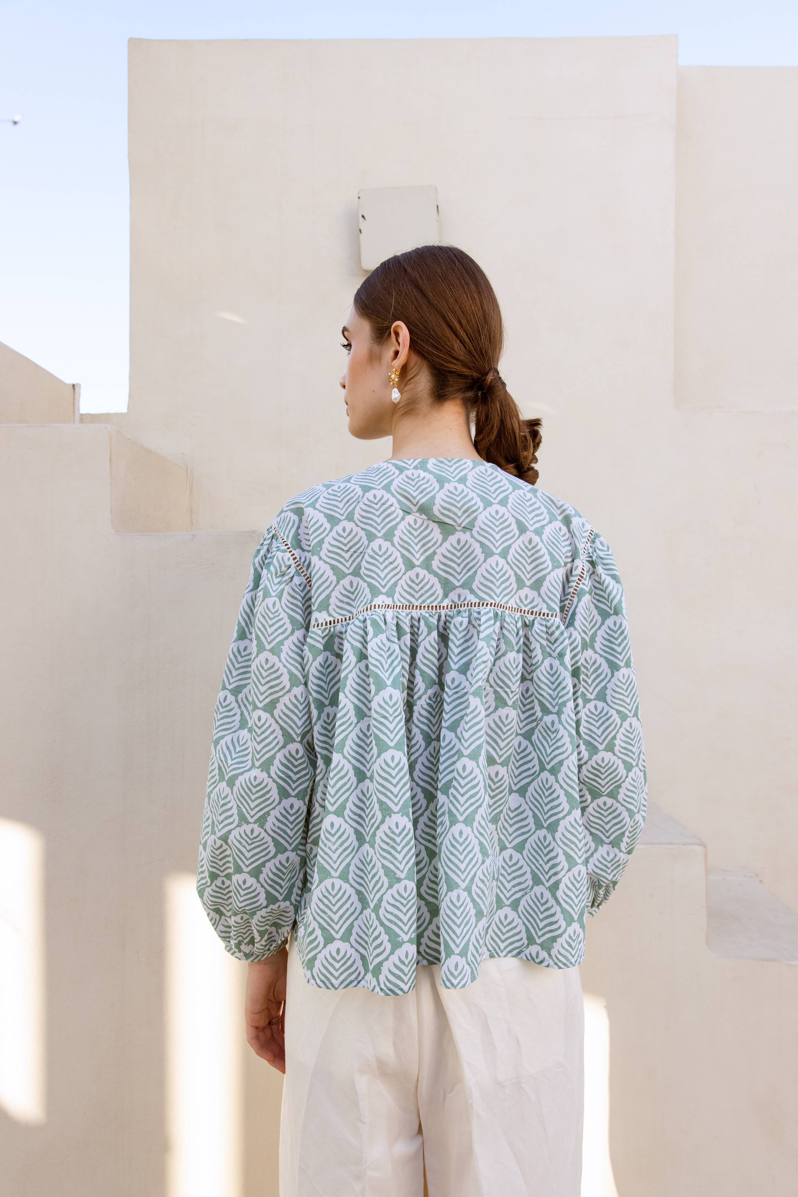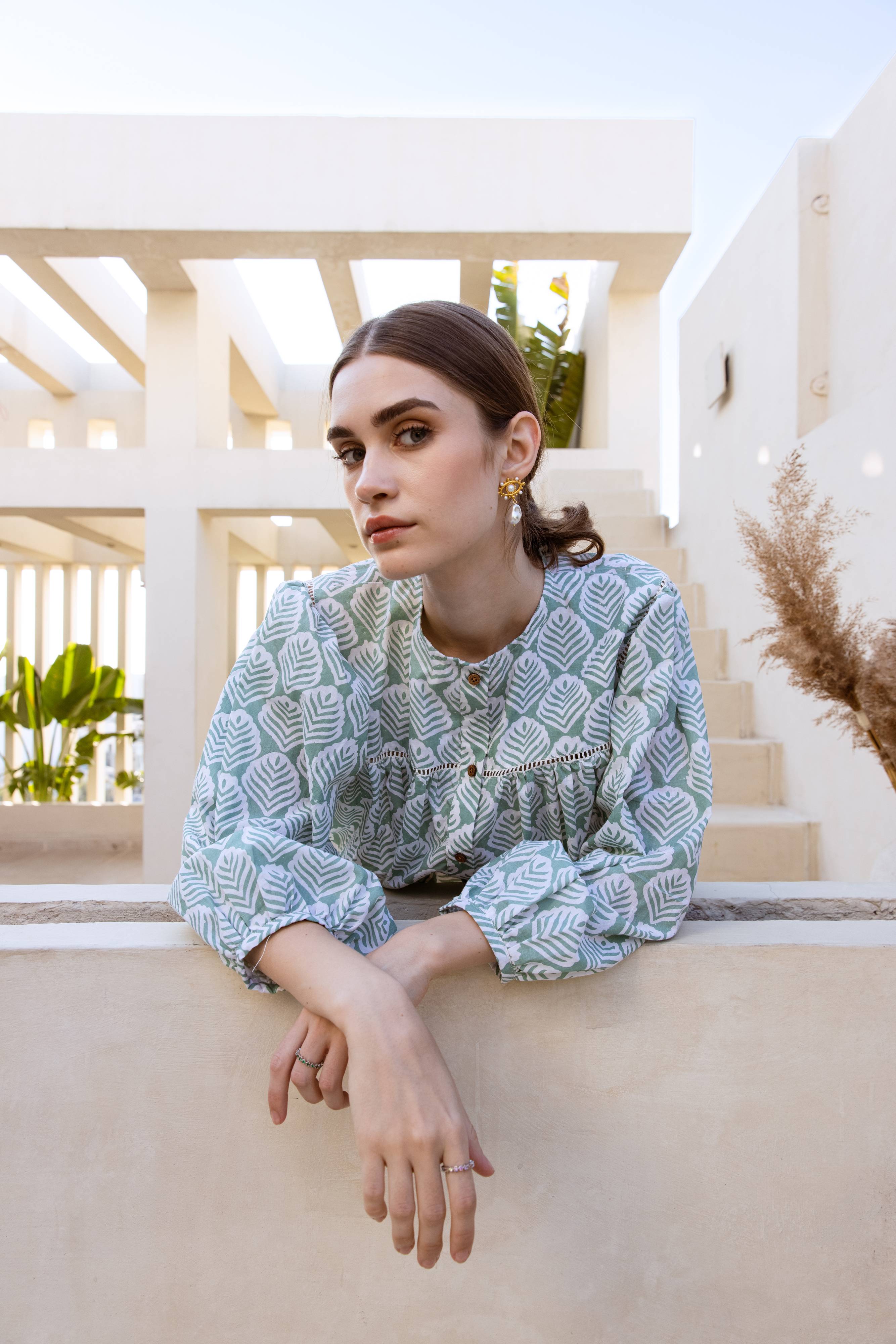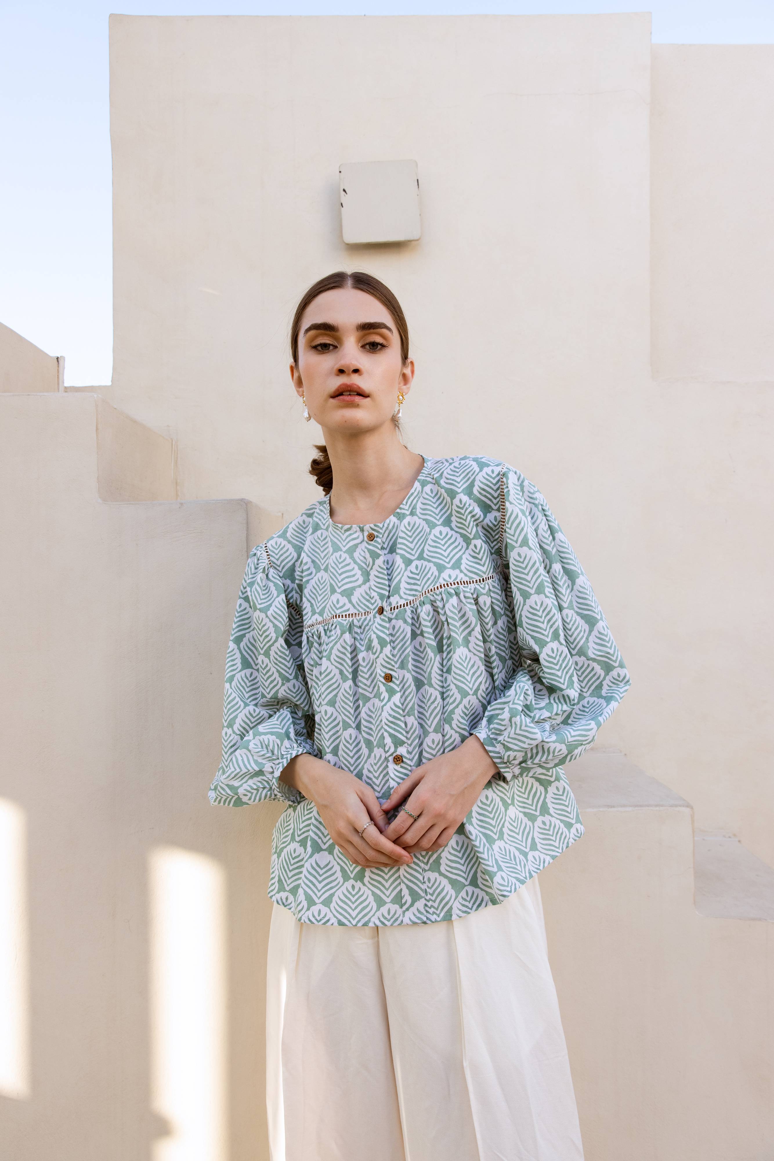 Introducing Isha — a graceful sage green balloon shirt crafted in 100% premium cotton and hand block printed with delicate leaf motifs that symbolize renewal and new beginnings, inspired by the first tender leaves of spring.