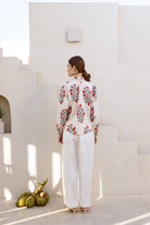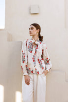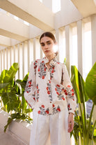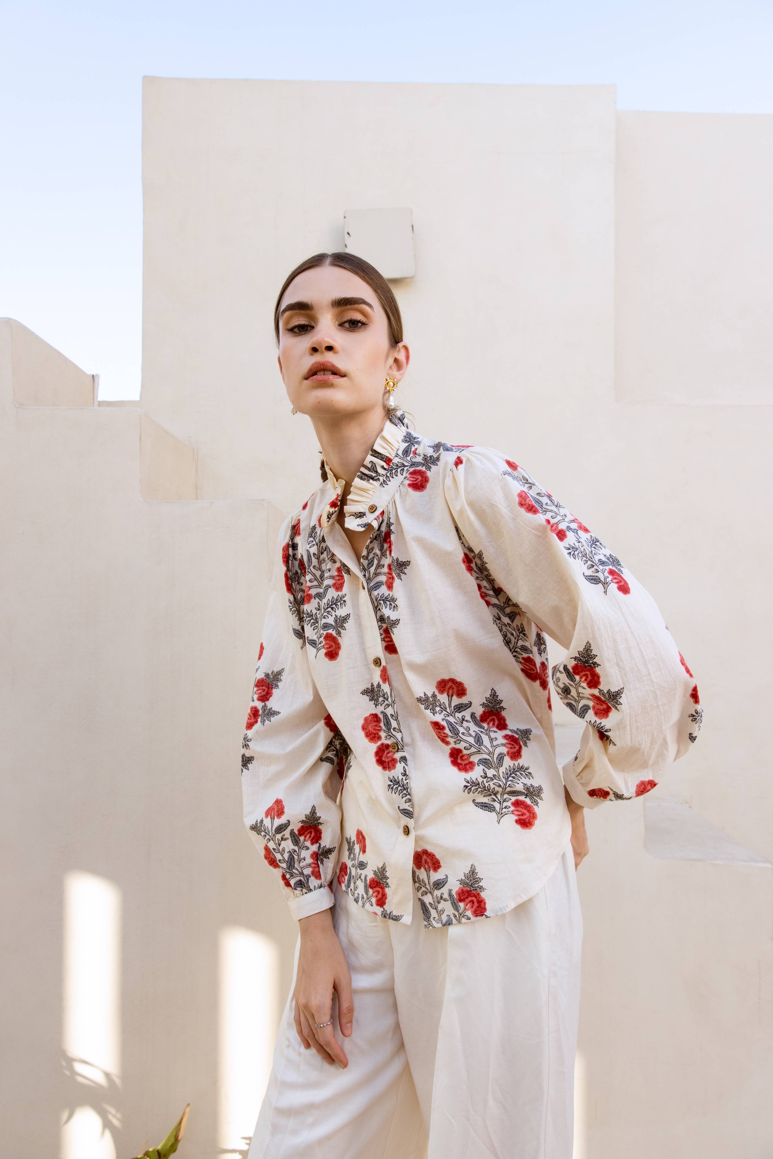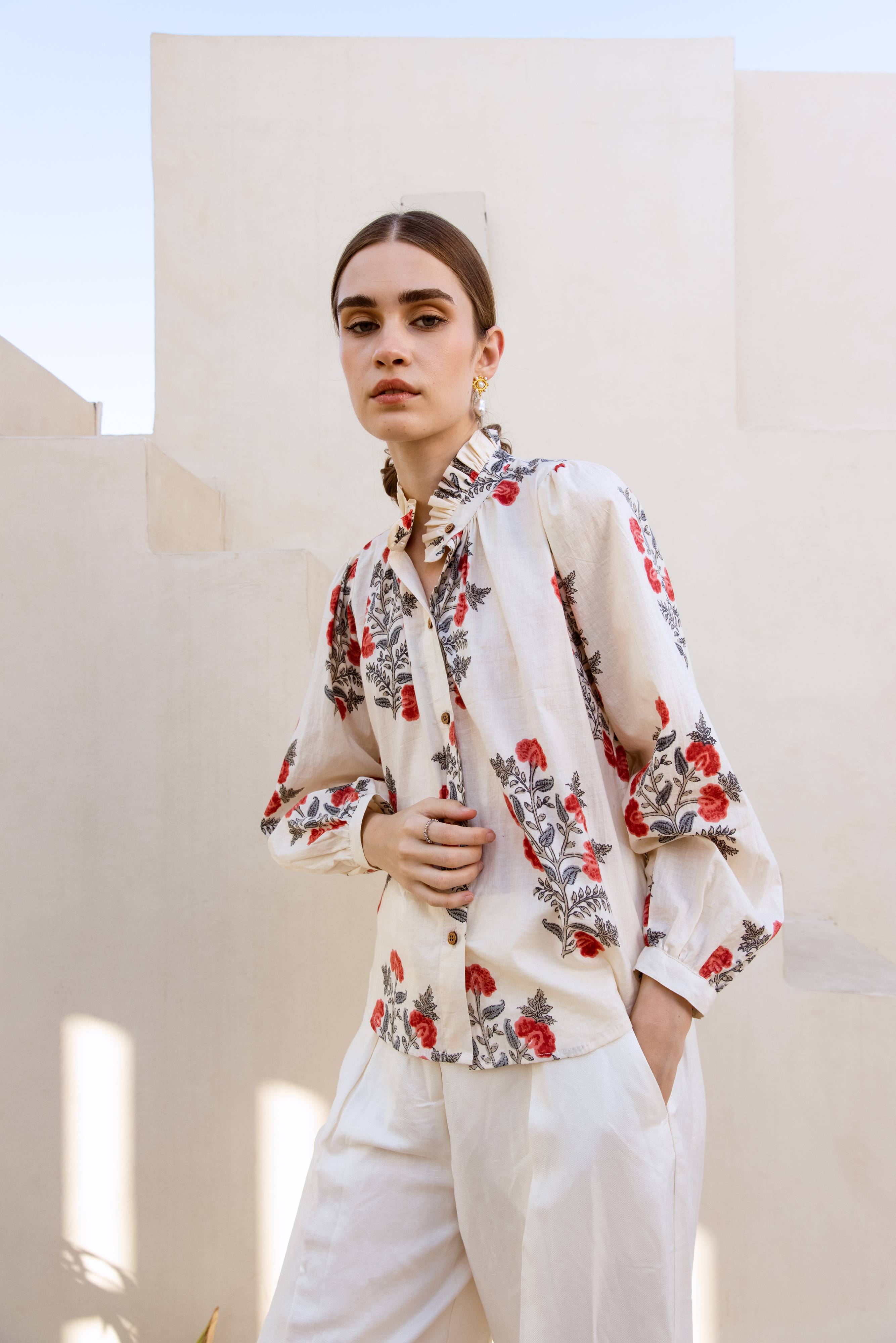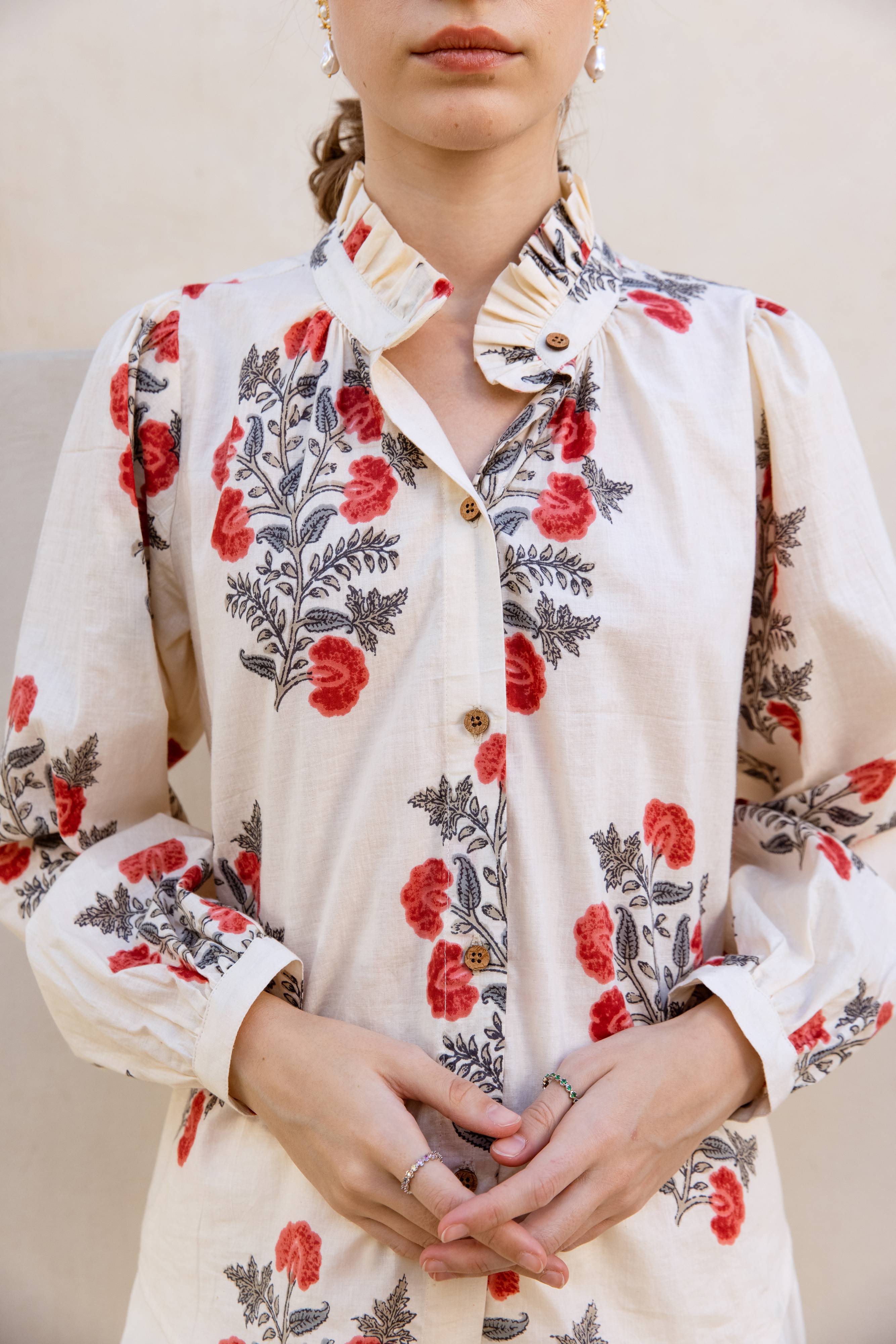 Introducing Meera — a beautifully hand printed shirt in a soft ivory-cream hue, adorned with delicate red floral motifs that radiate charm and calm.