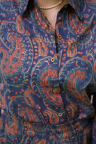 Bring timeless elegance to your wardrobe with our Tarini Blouse, featuring an intricate burnt orange and blue paisley hand-block print on soft, breathable 100% organic cotton.