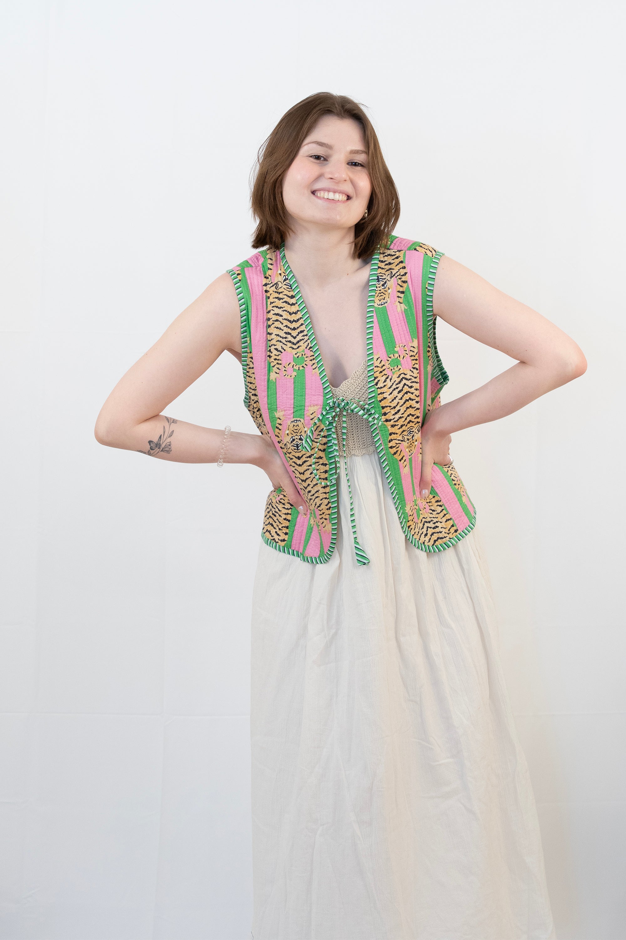 Turn heads with this vibrant reversible tiger-print vest, handcrafted in bold summer colors.