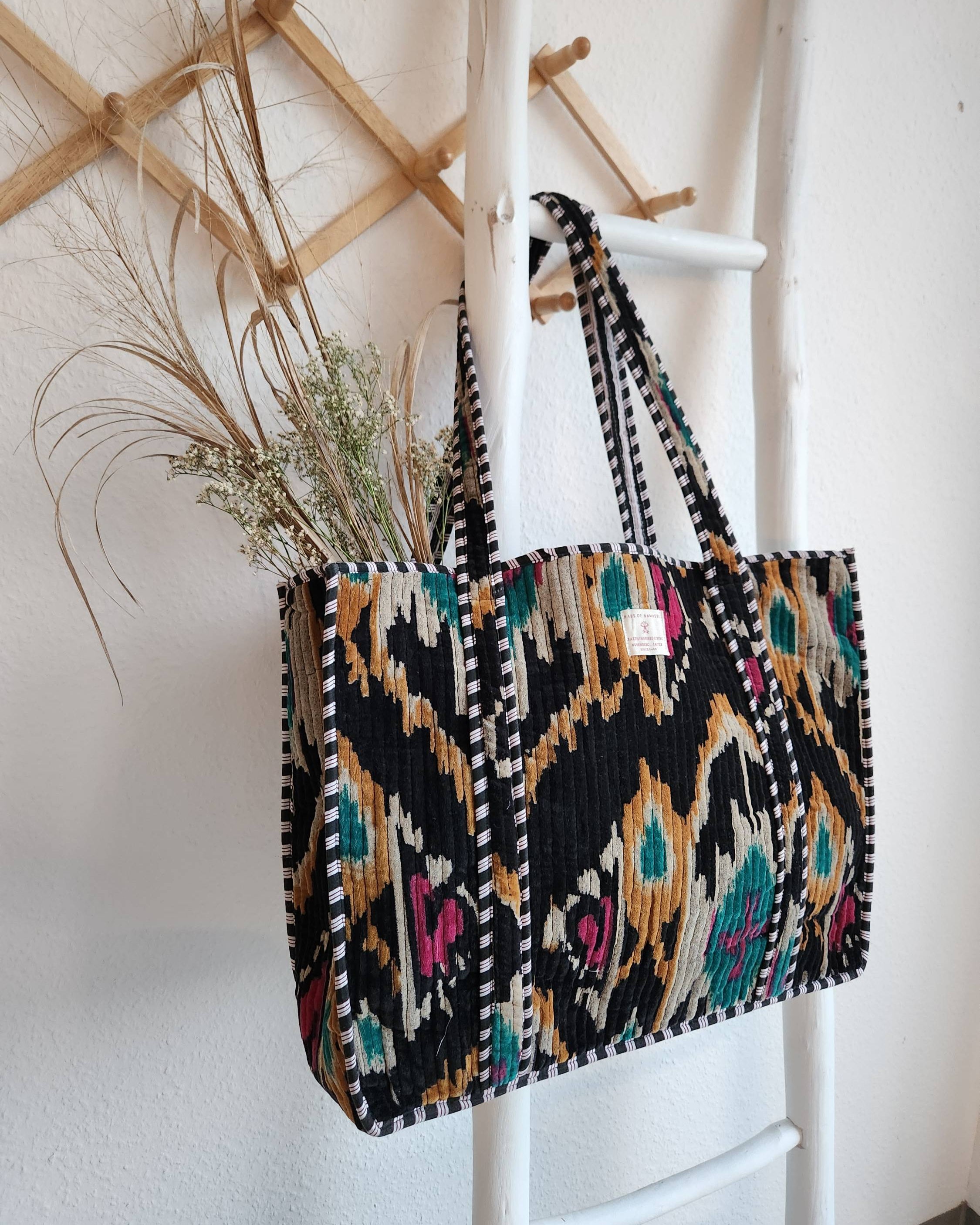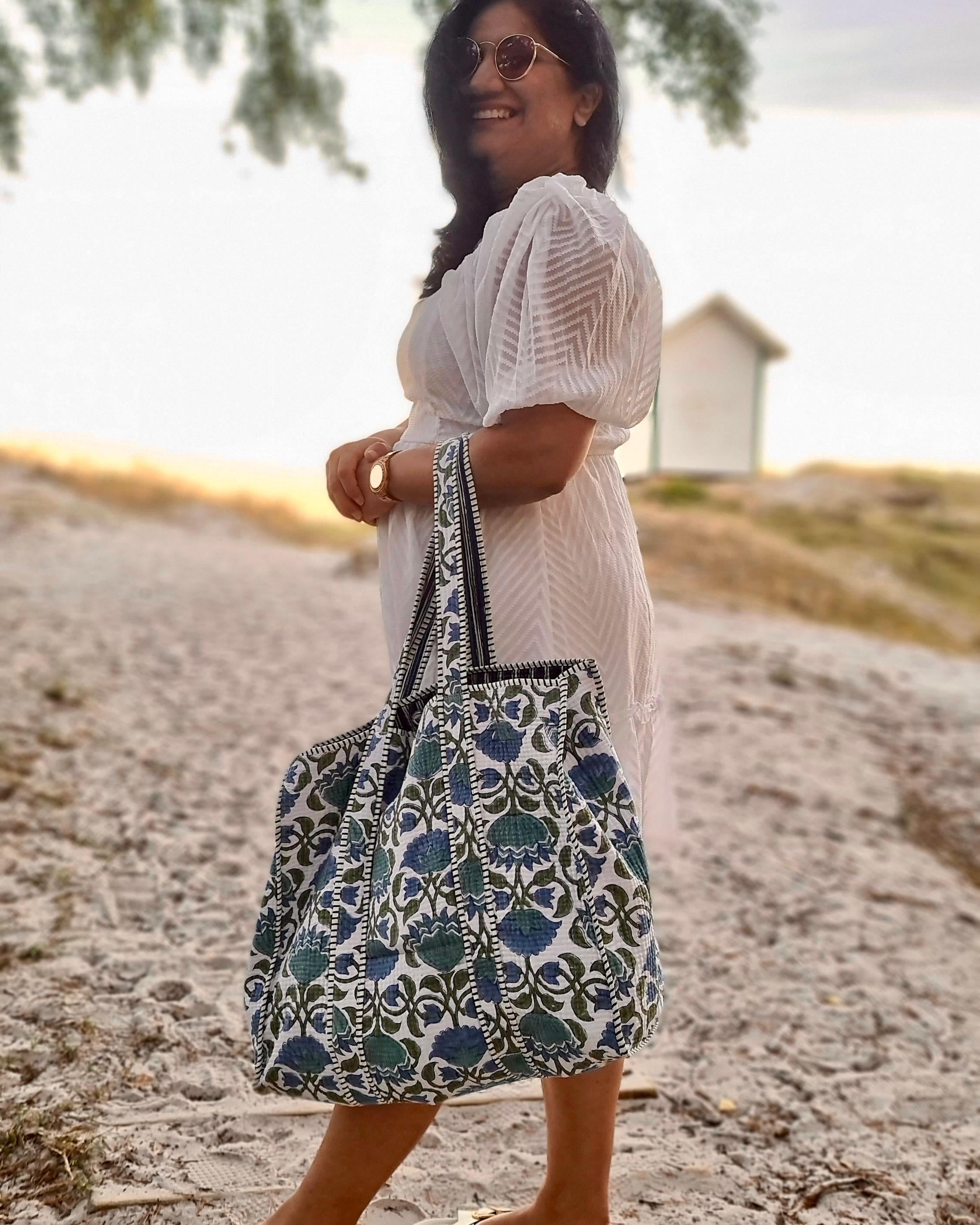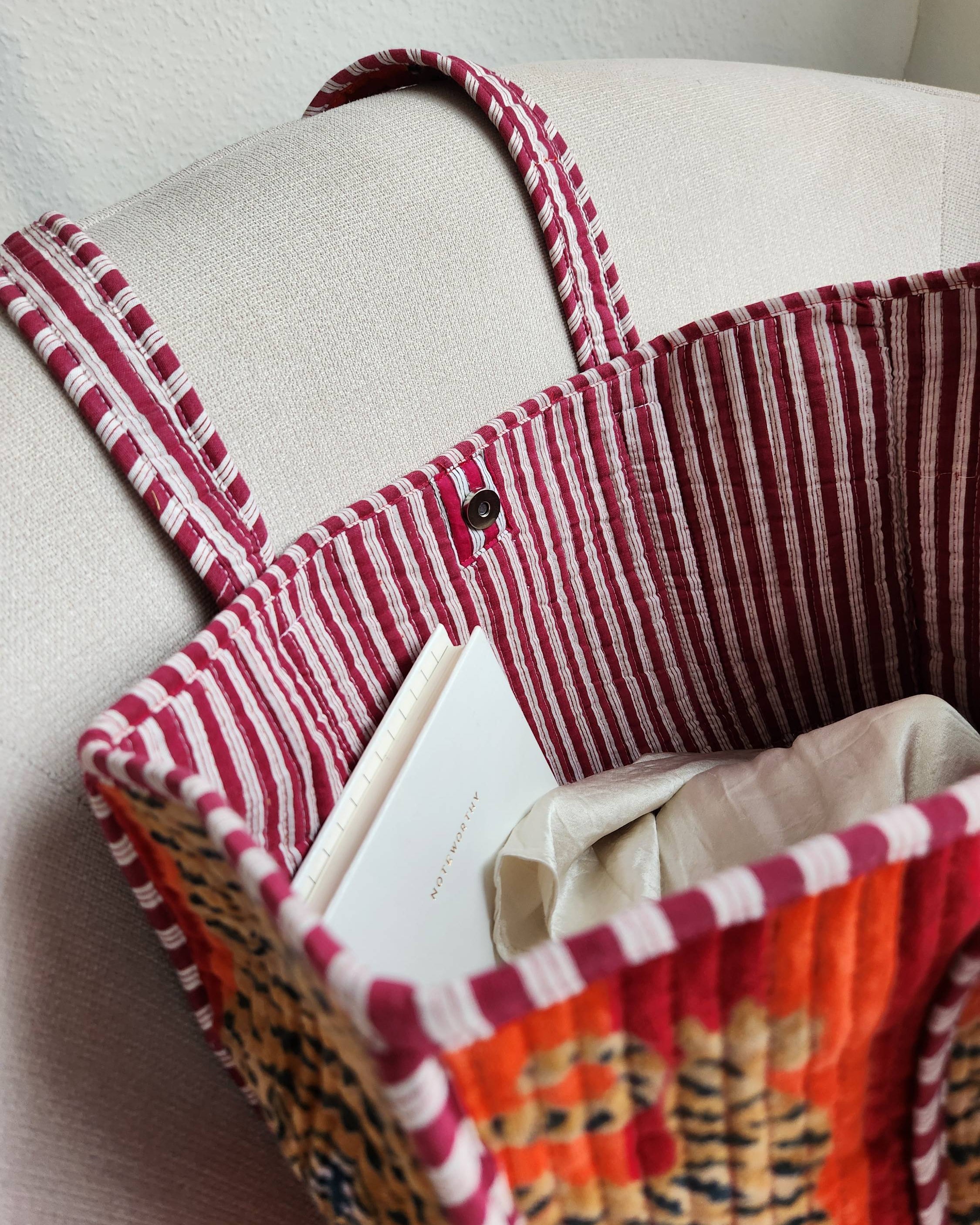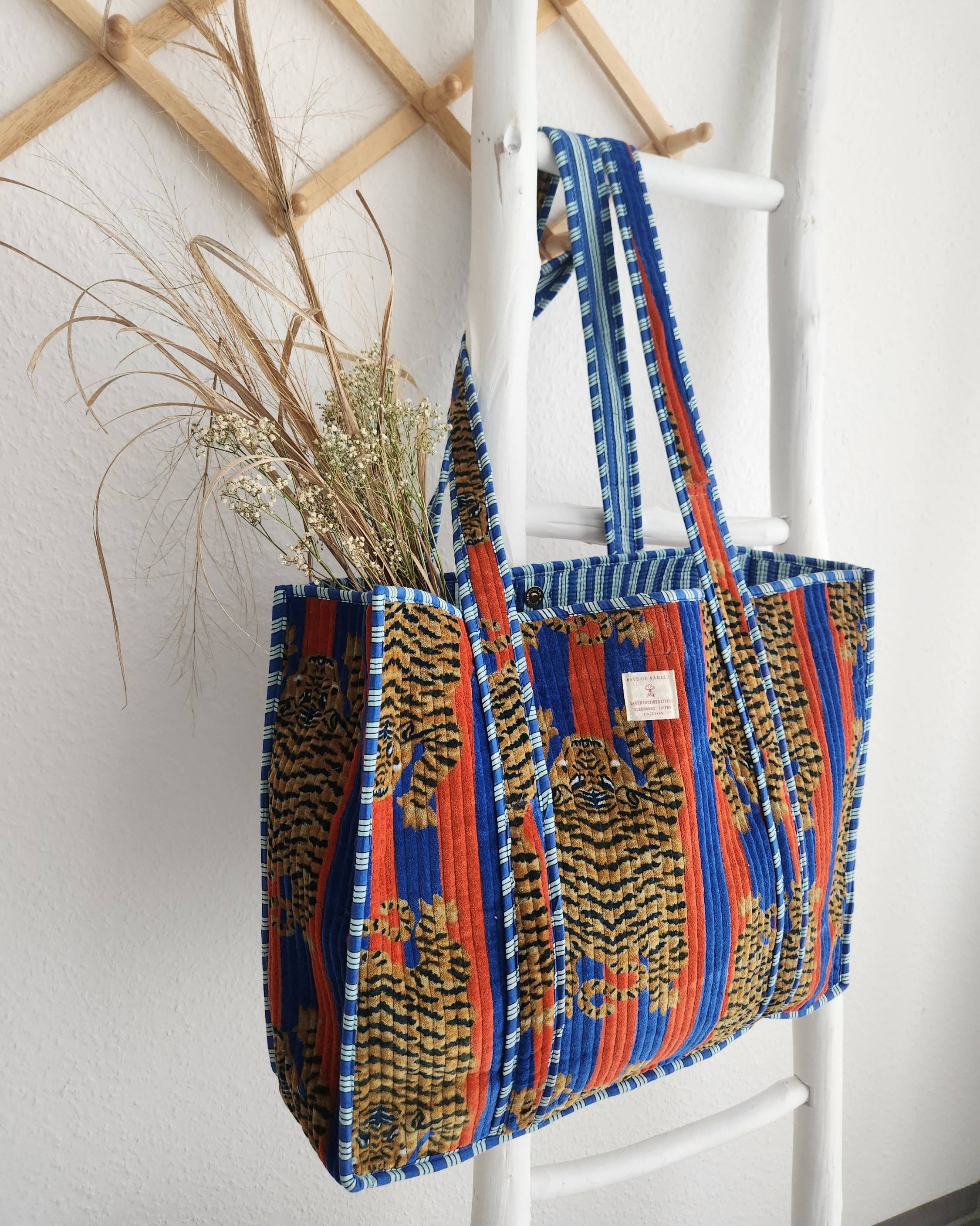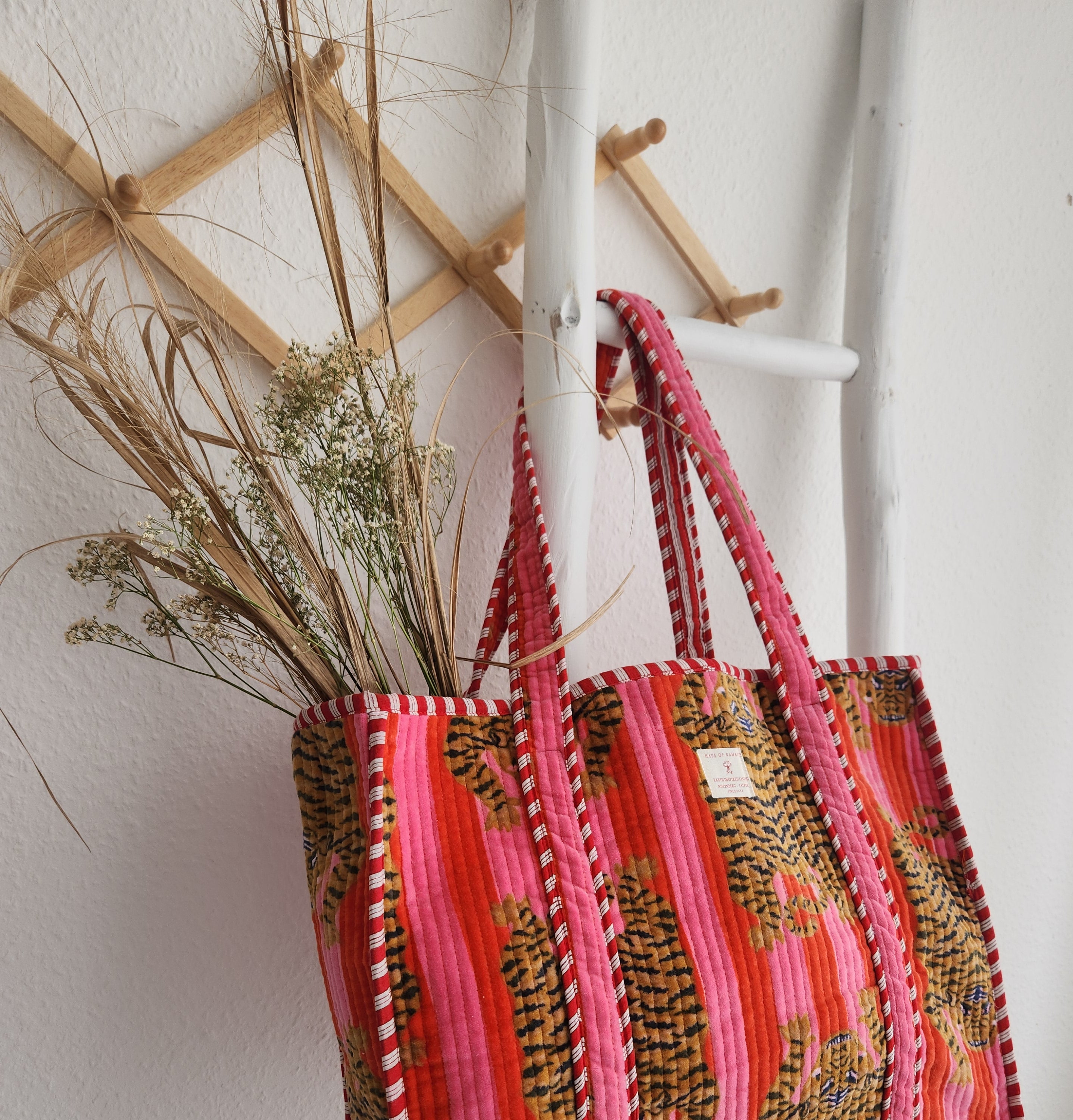 handgefertigt. Die farbenfrohen Blumenmuster werden per Handblockdruck auf die Wendetaschen