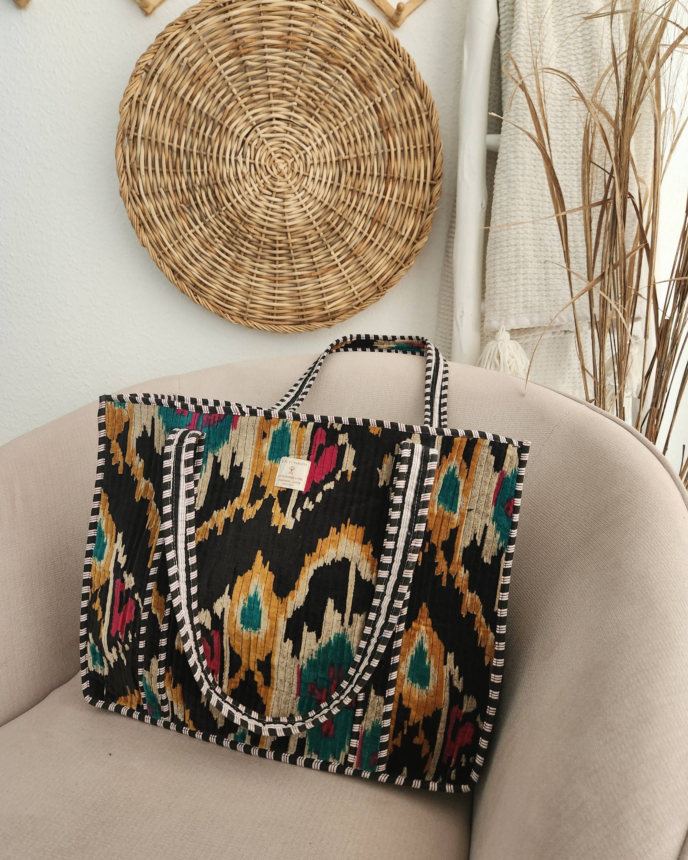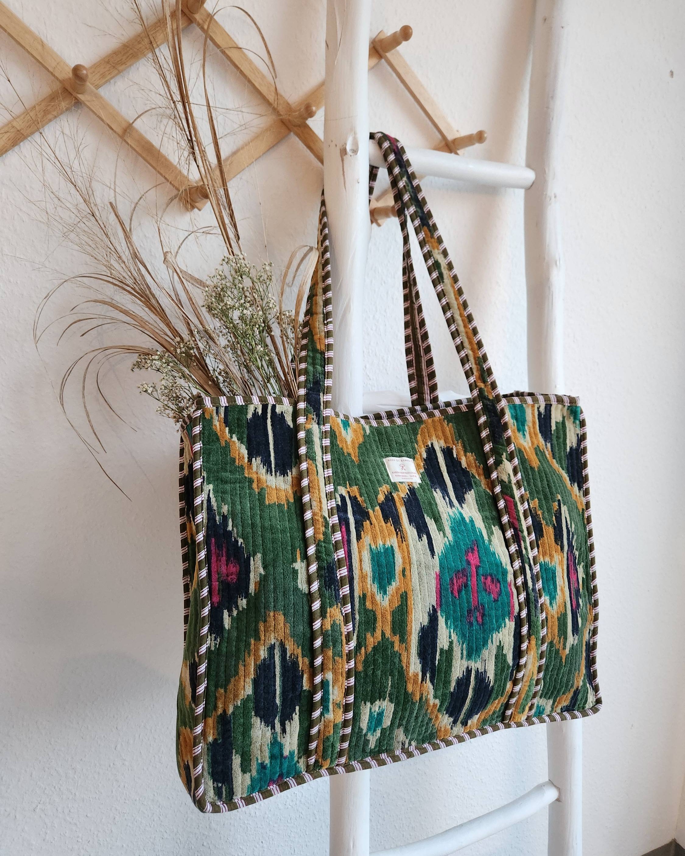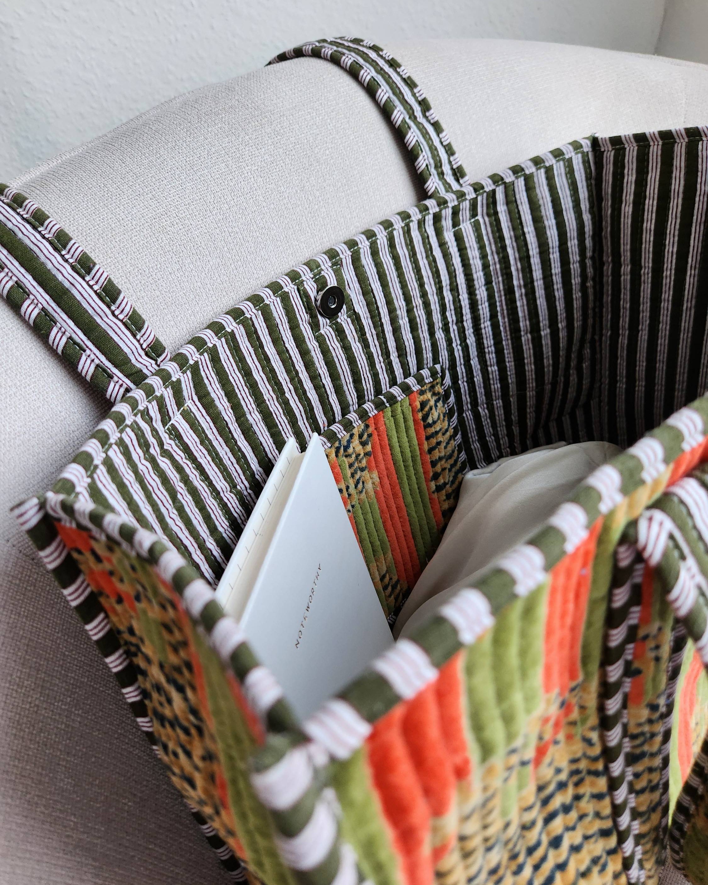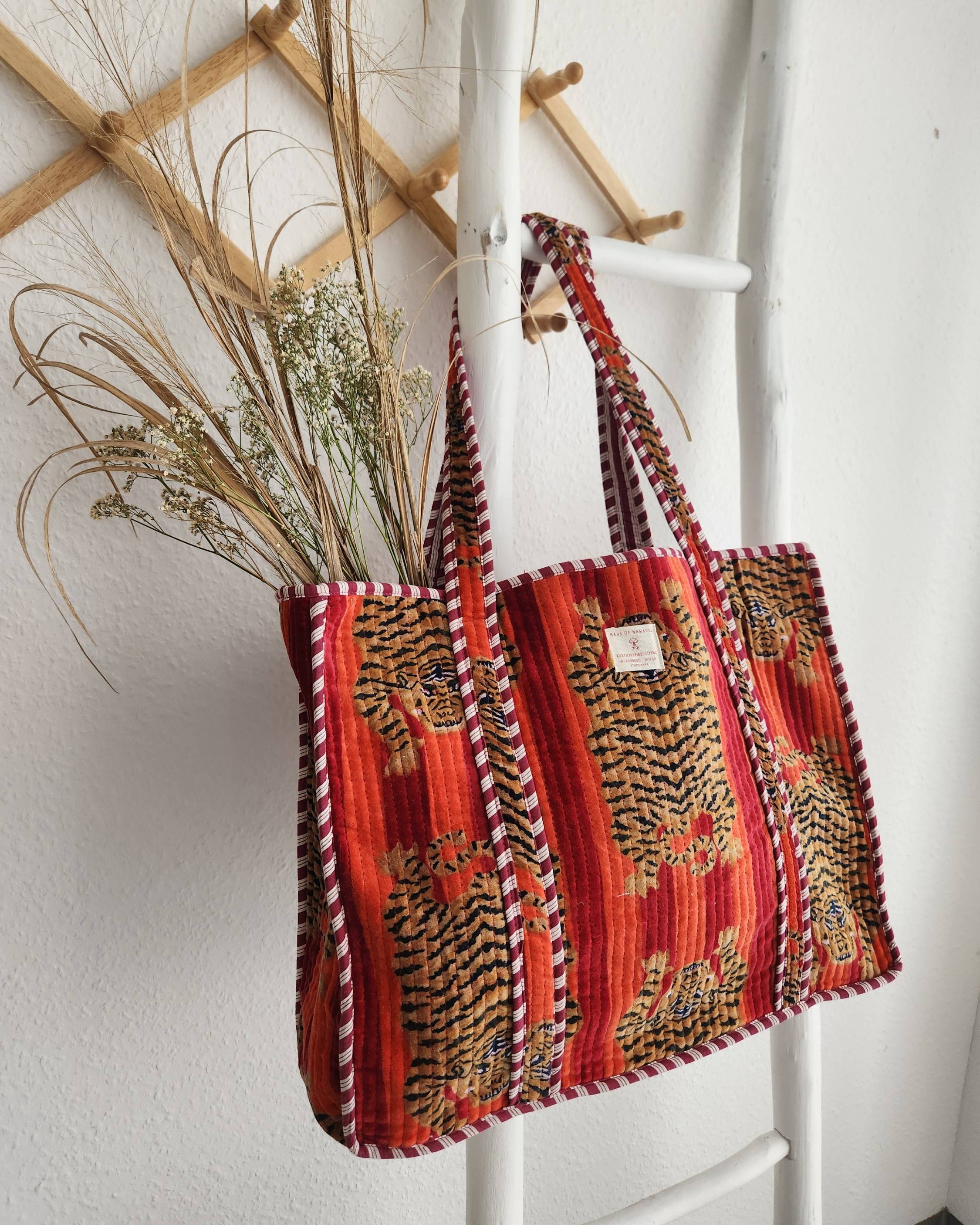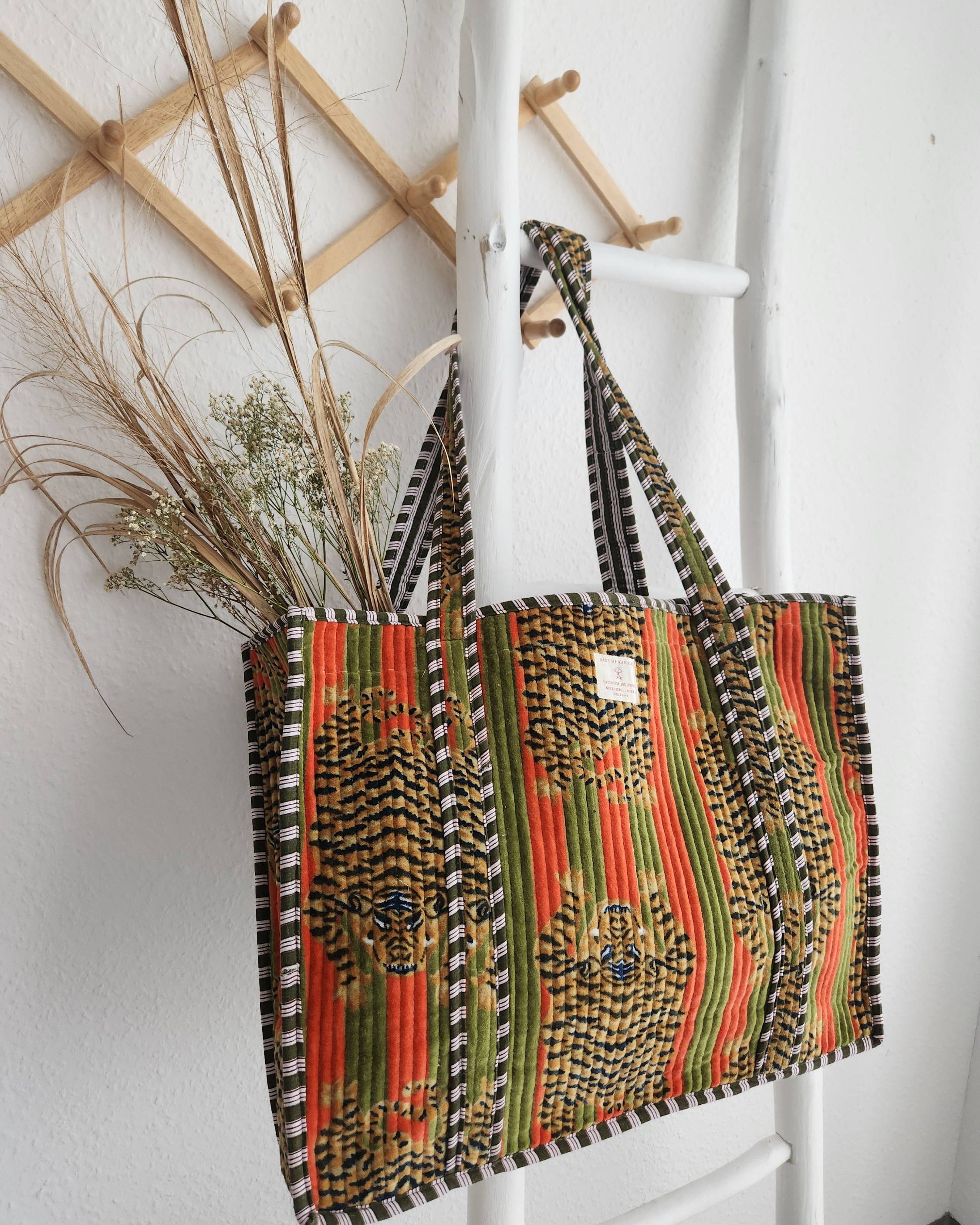 handgefertigt. Die farbenfrohen Blumenmuster werden per Handblockdruck auf die Wendetaschen