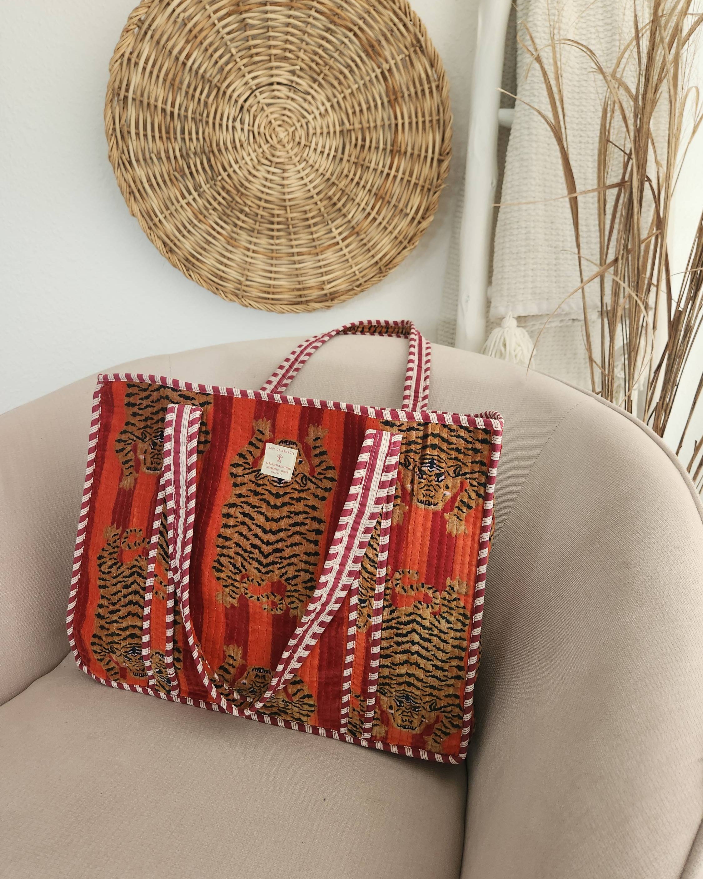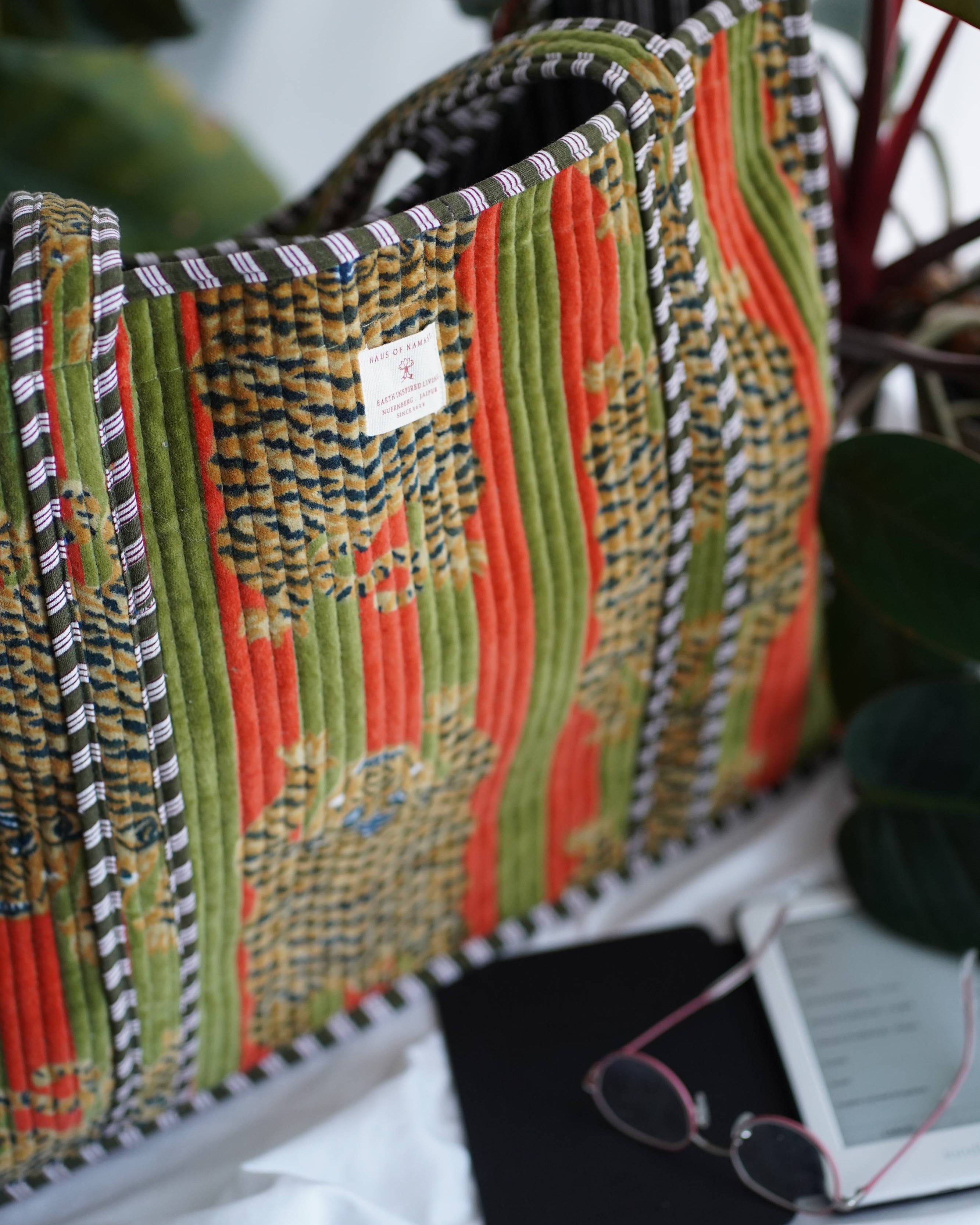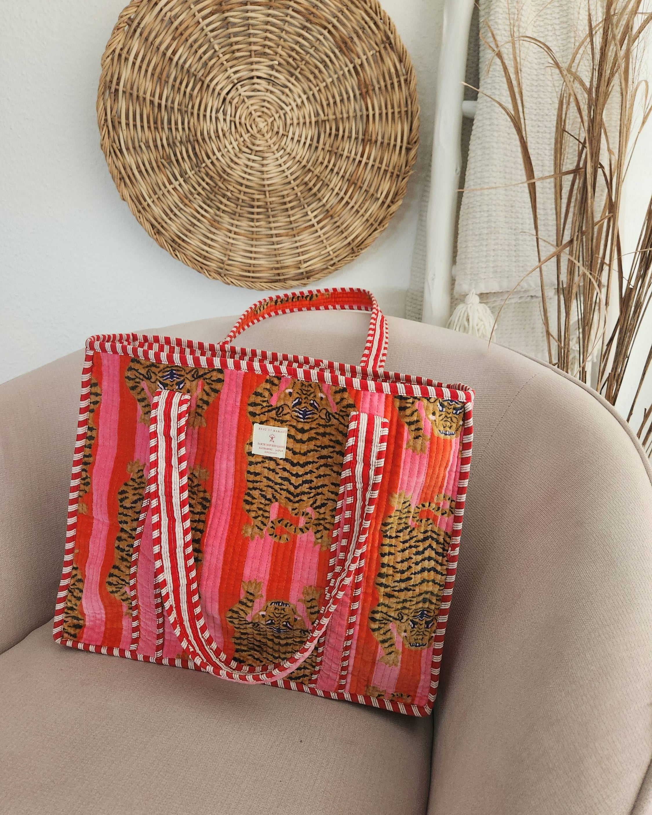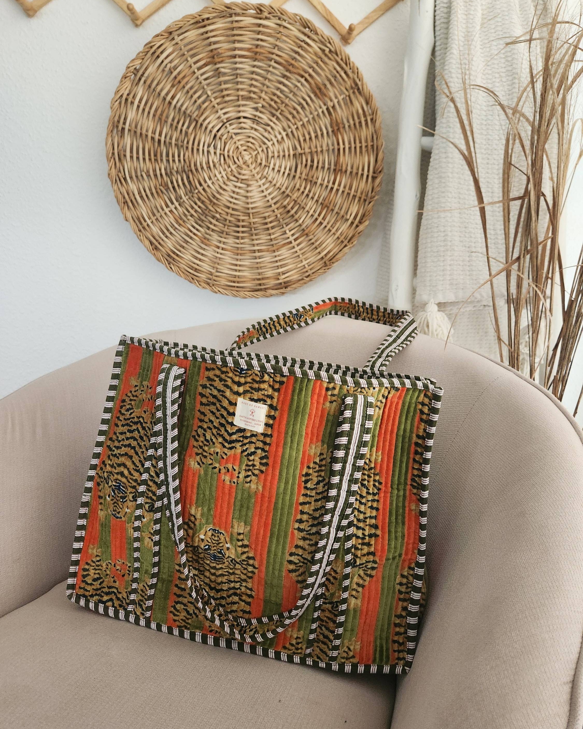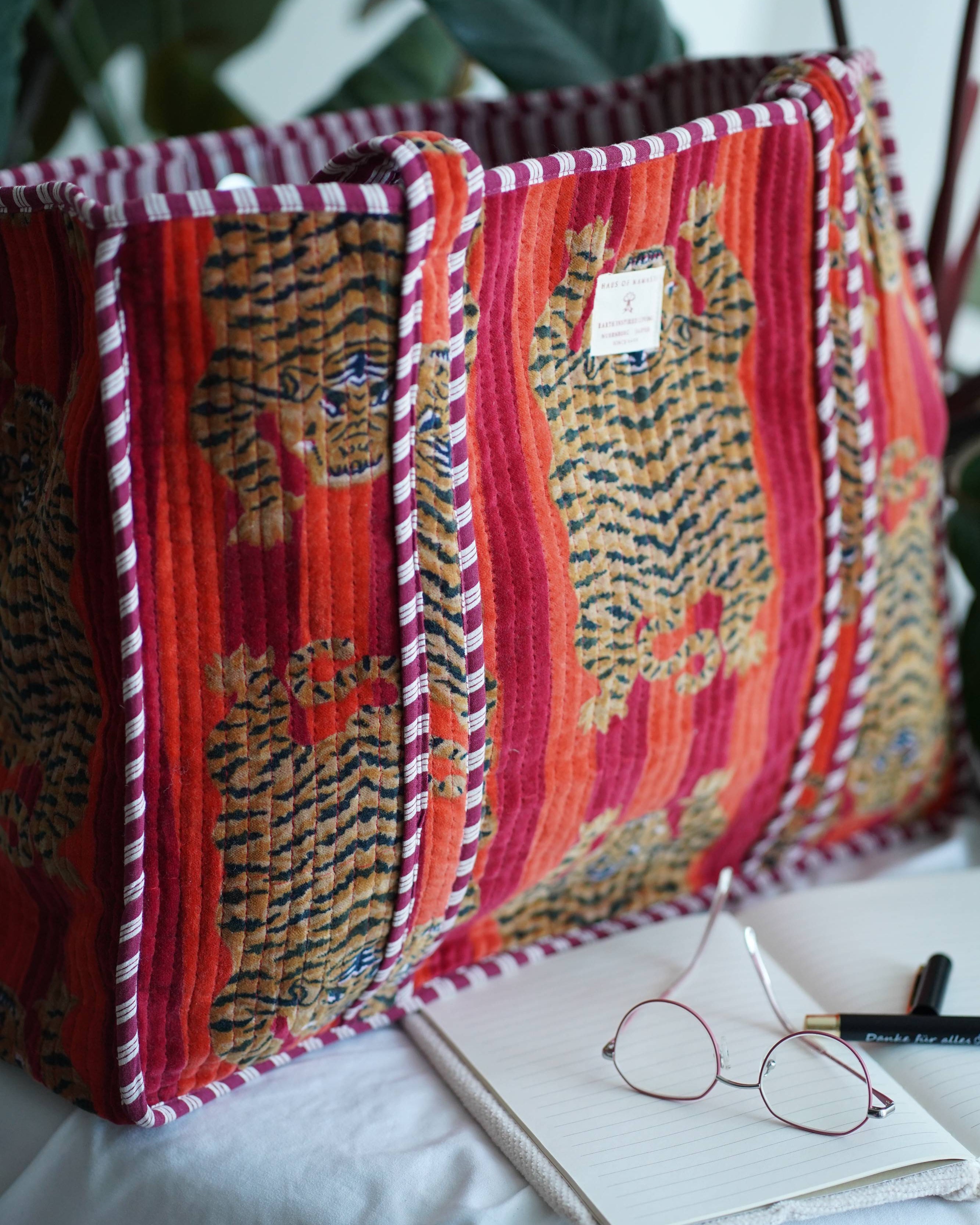handgefertigt. Die farbenfrohen Blumenmuster werden per Handblockdruck auf die Wendetaschen