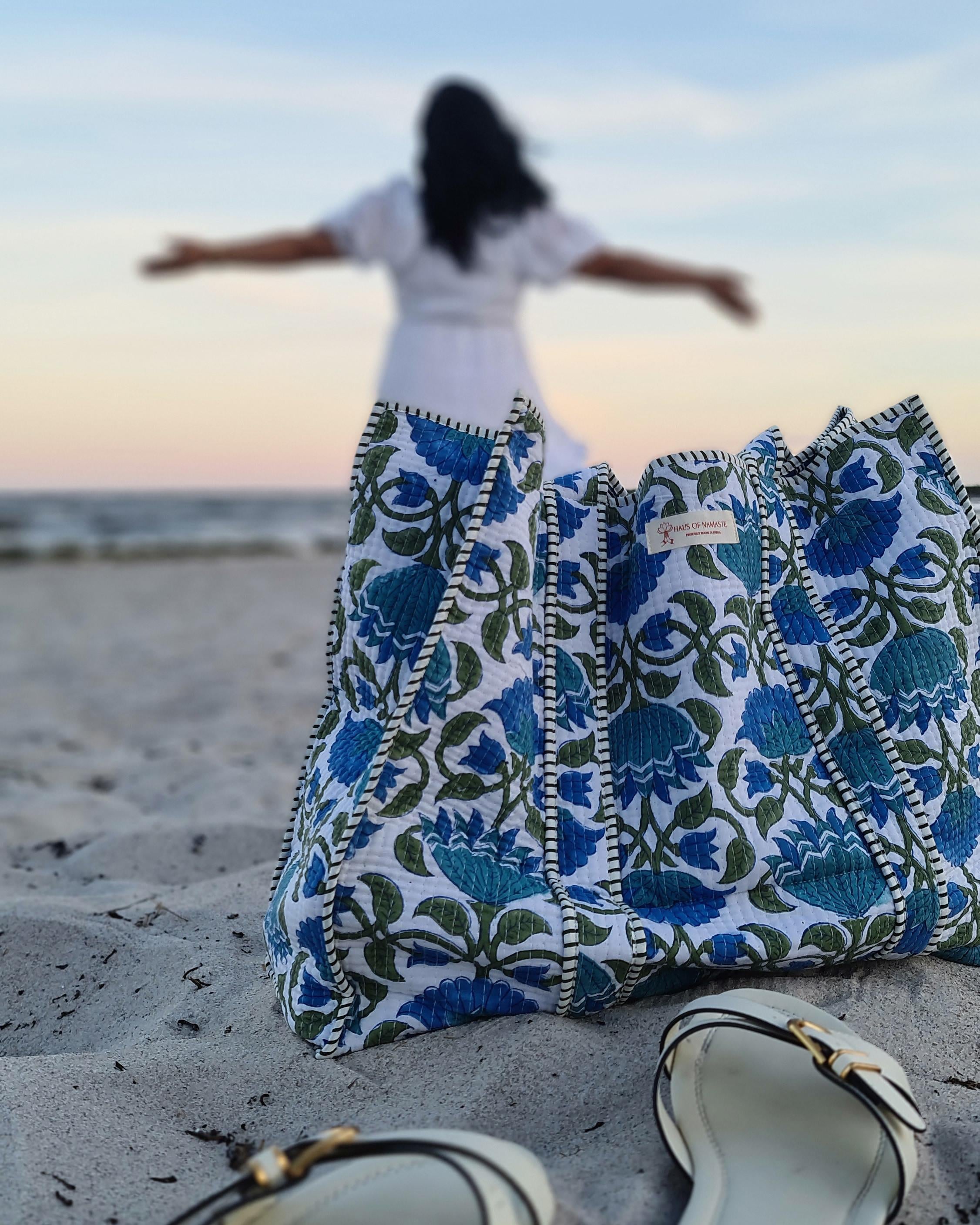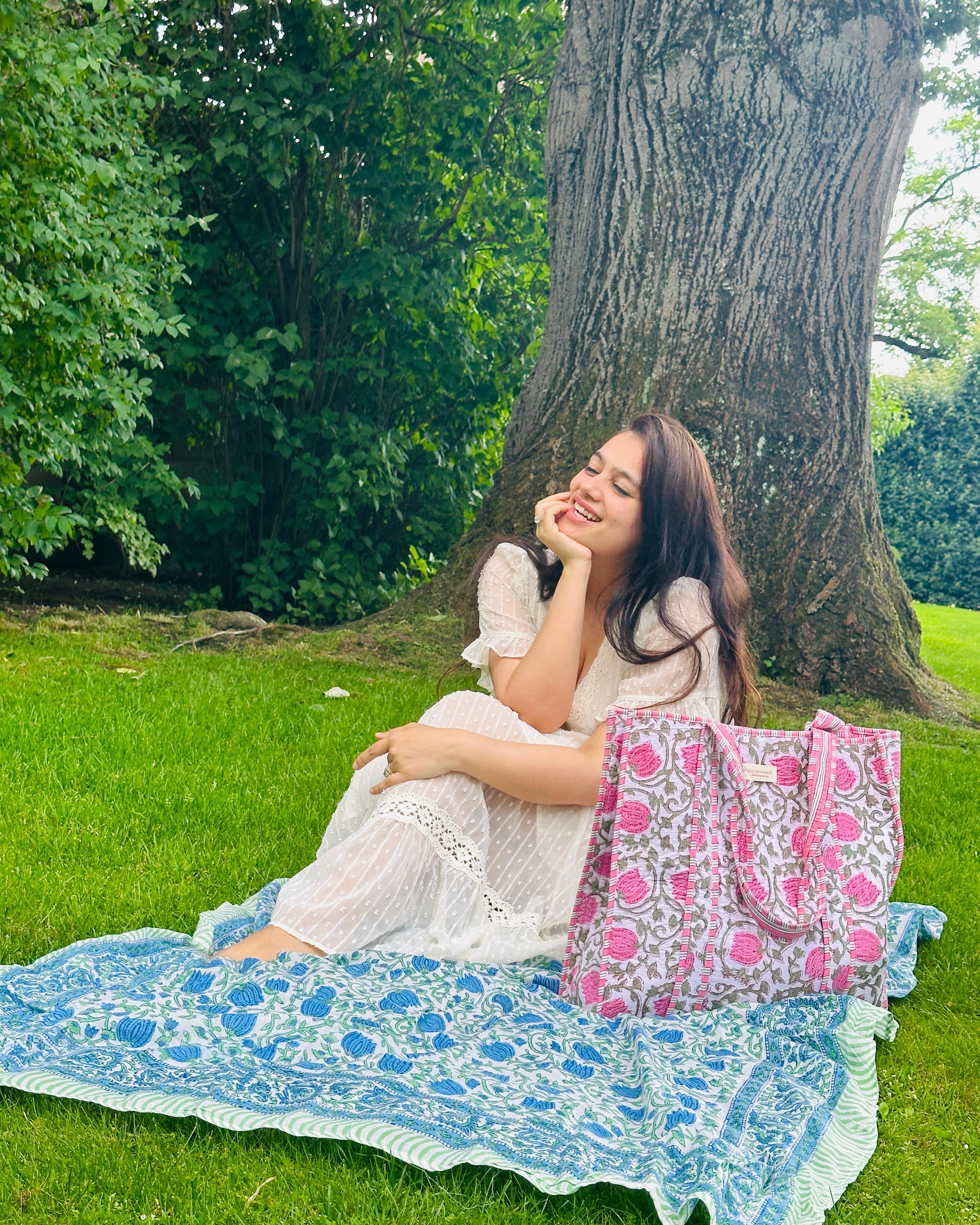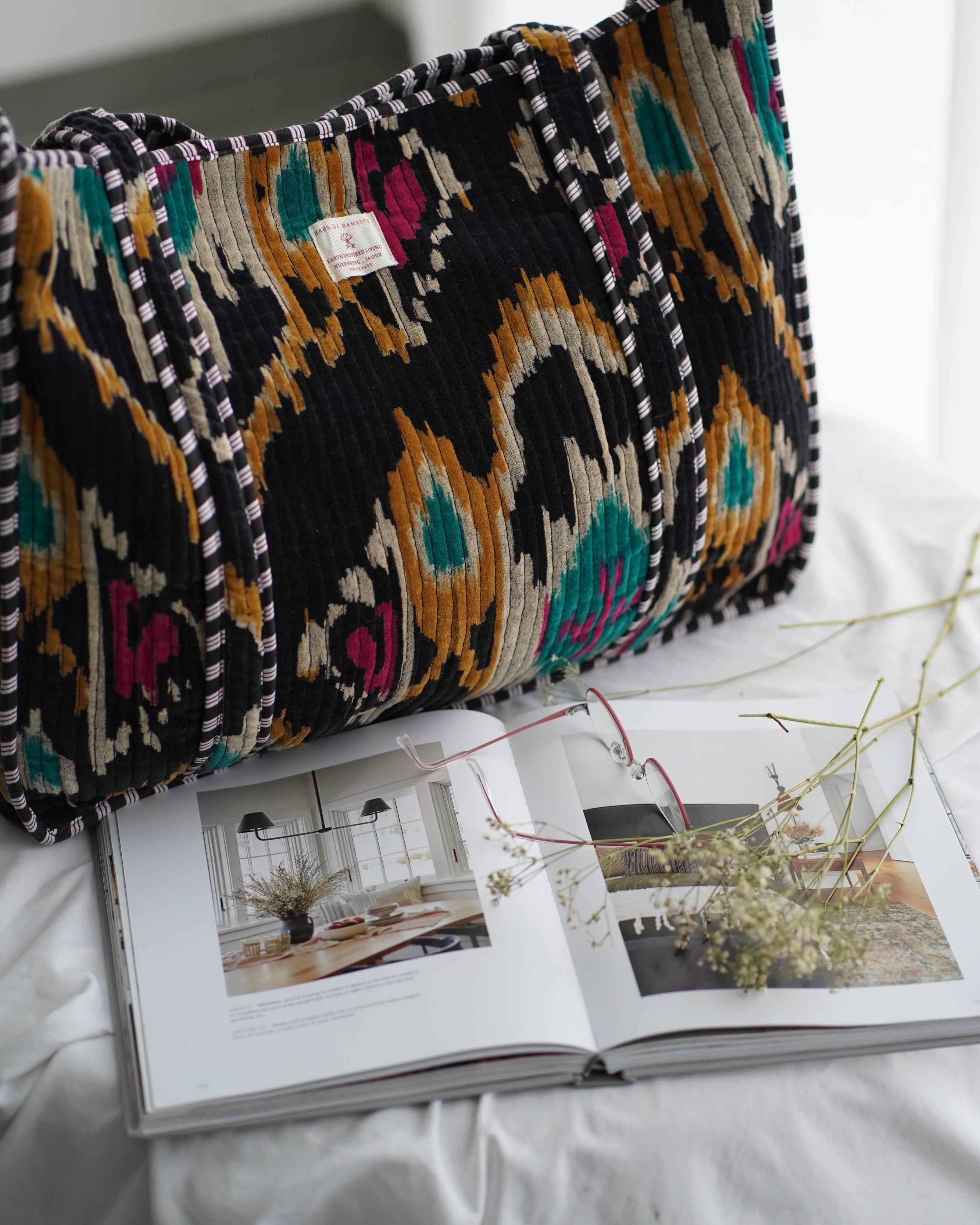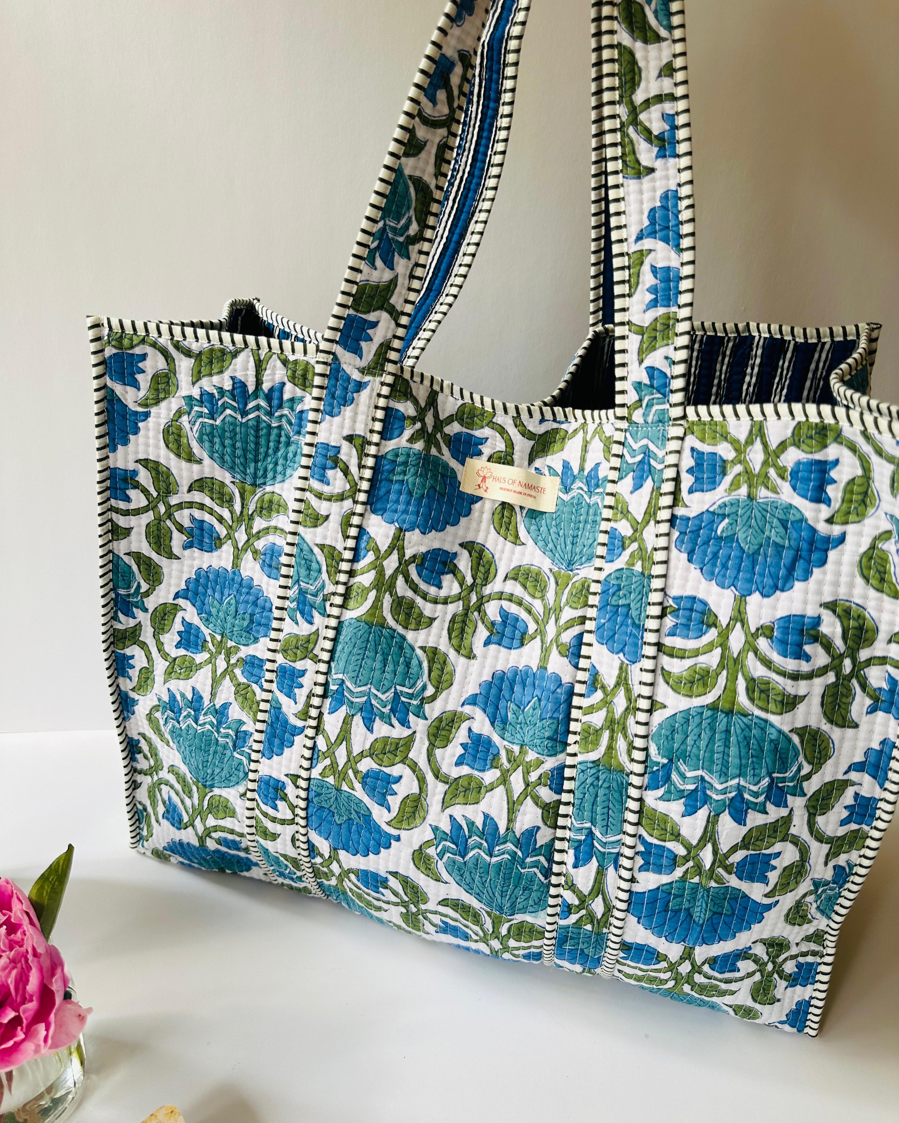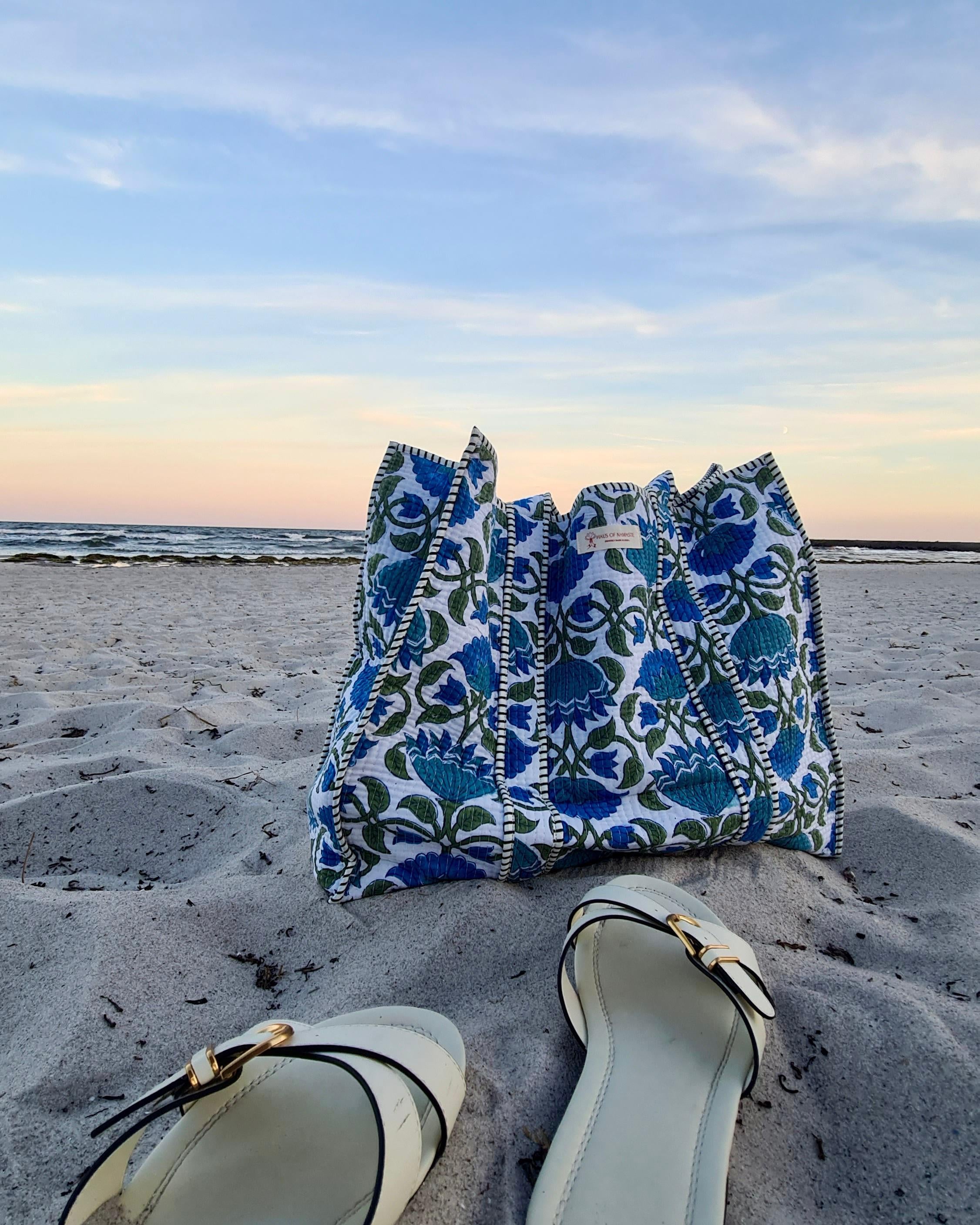 handgefertigt. Die farbenfrohen Blumenmuster werden per Handblockdruck auf die Wendetaschen