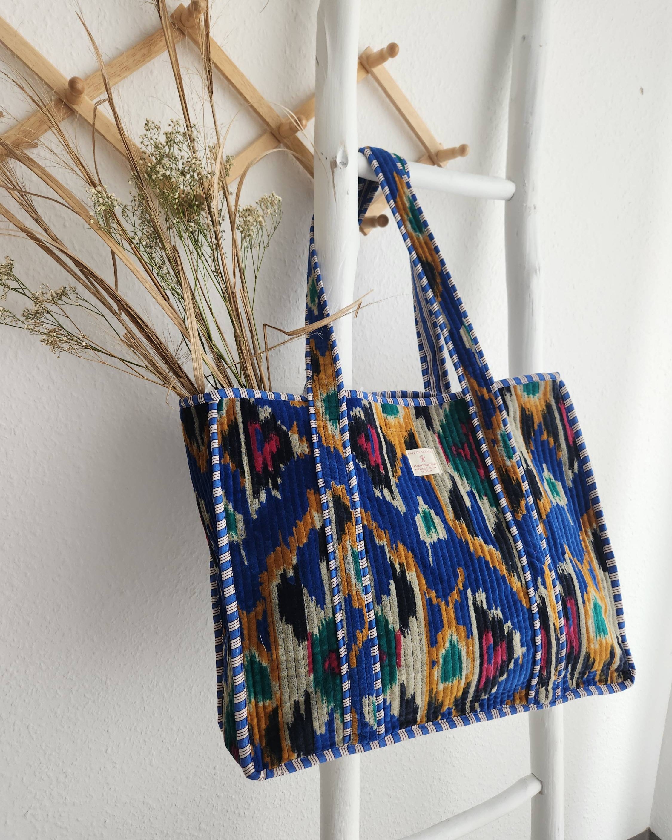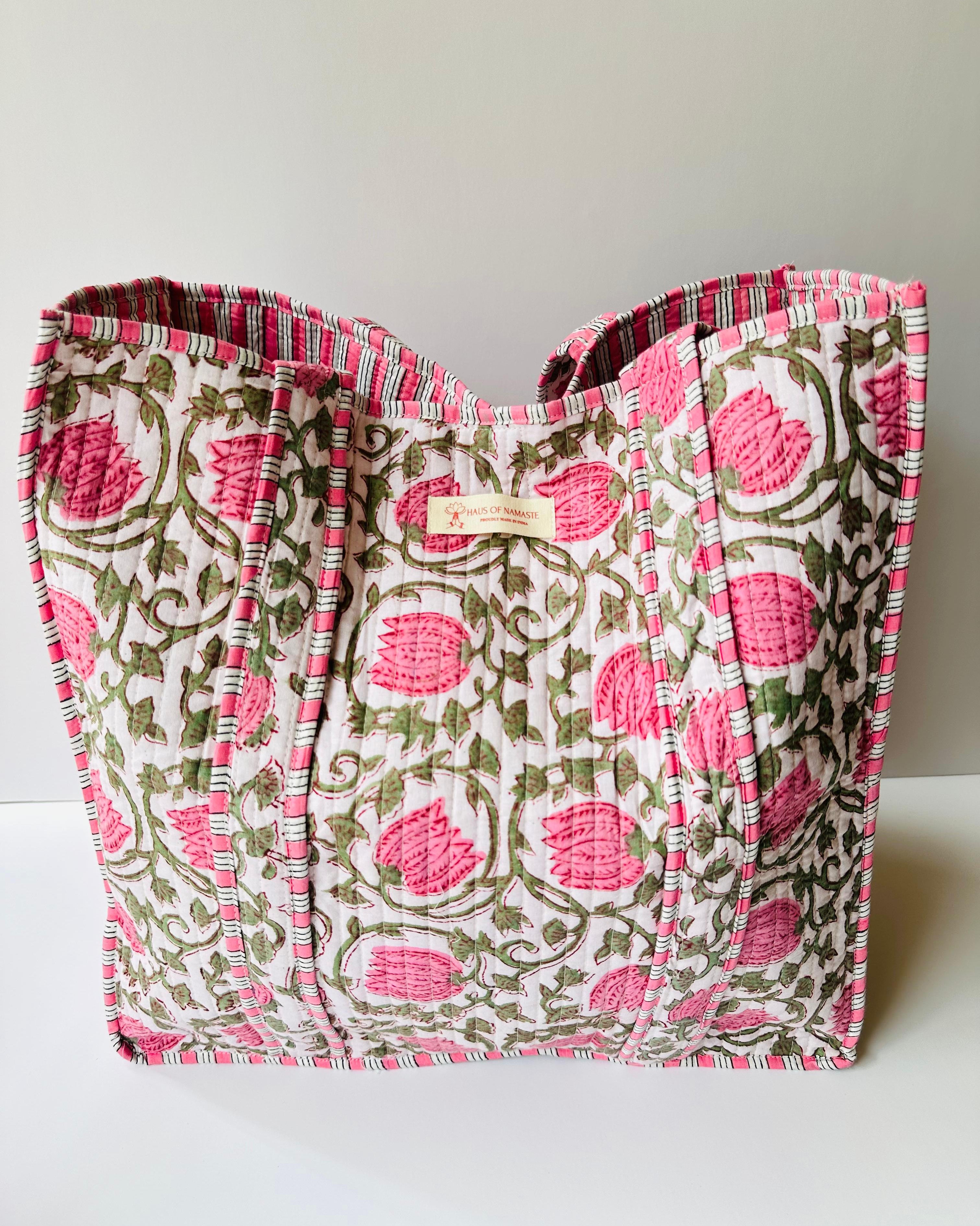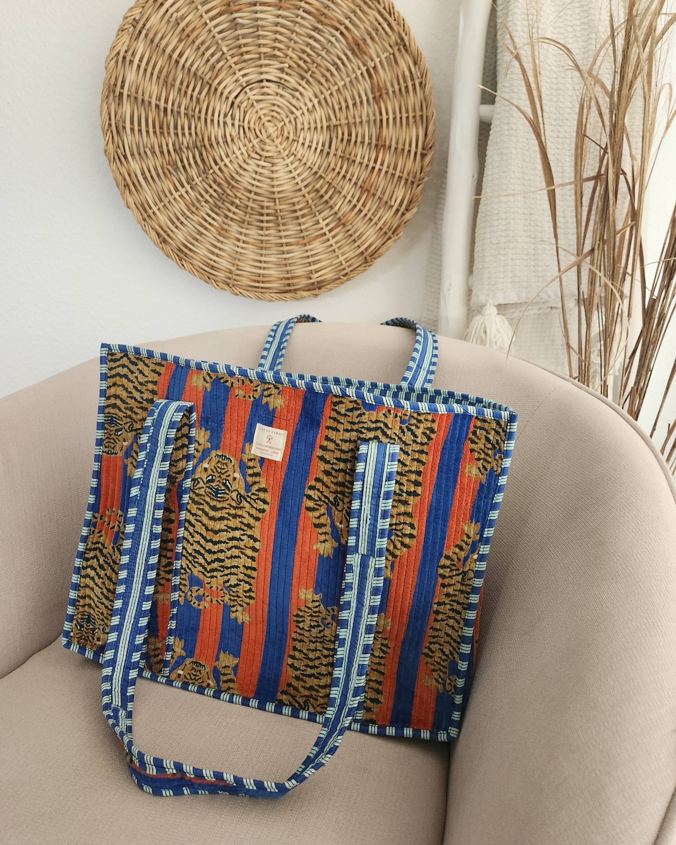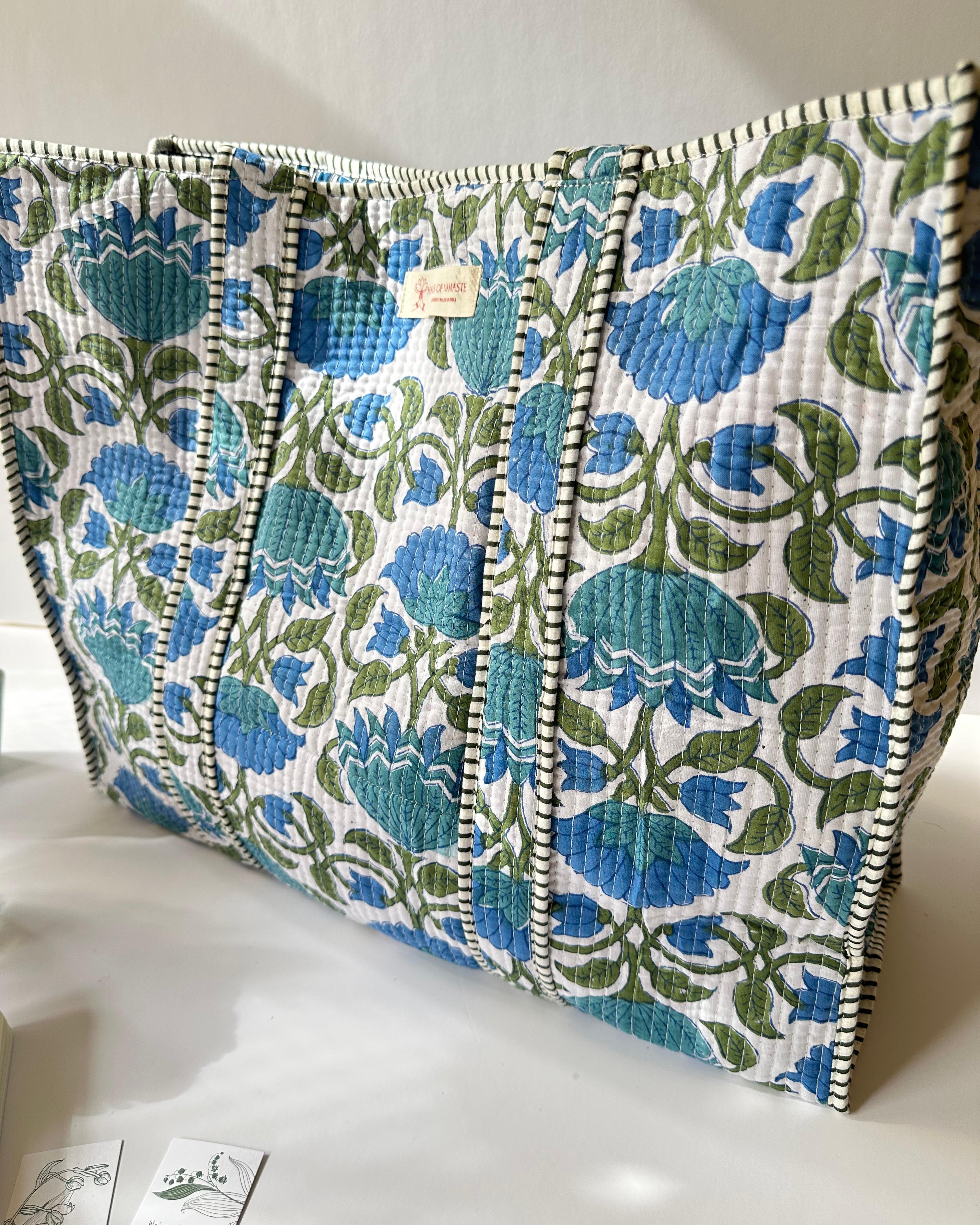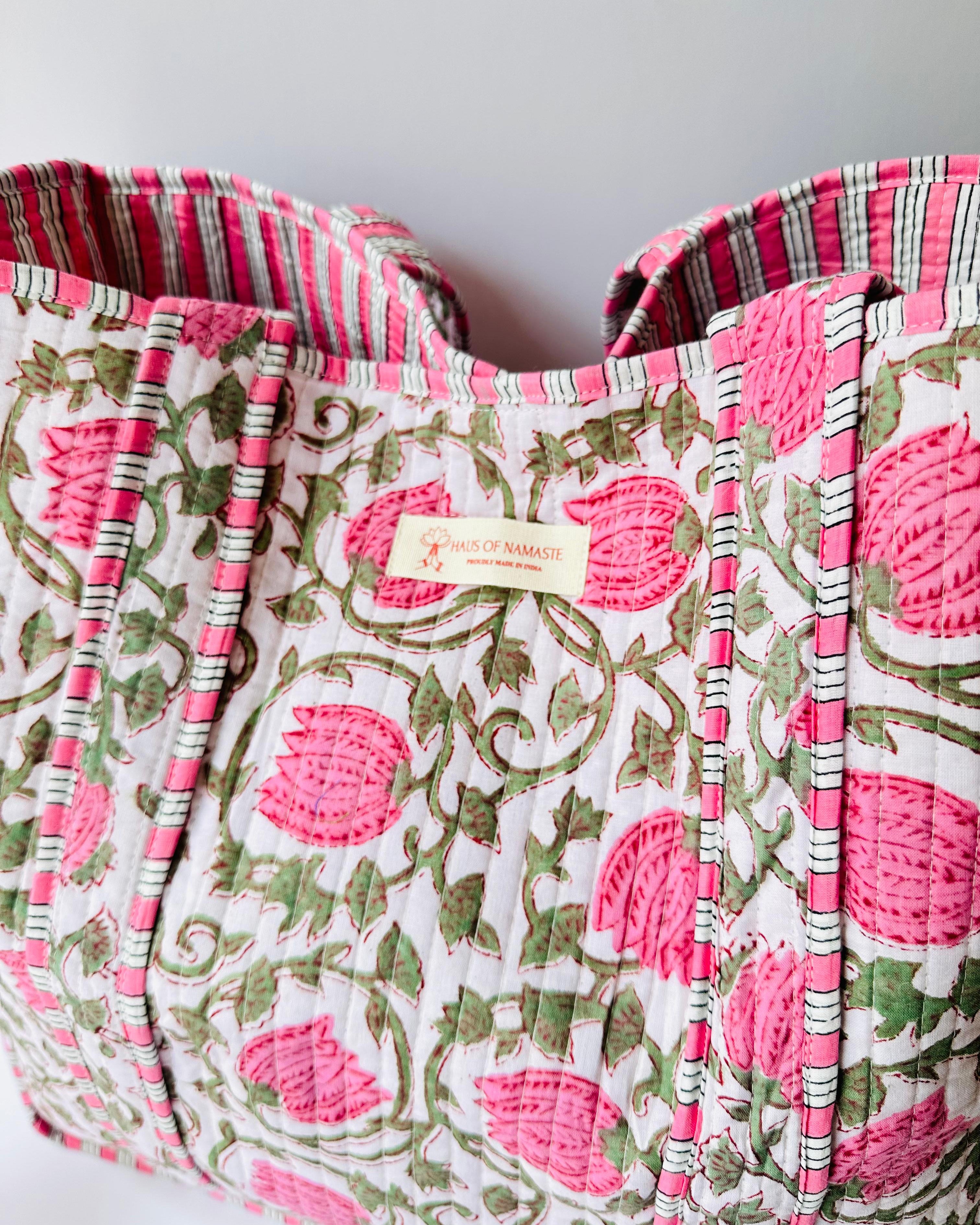 handgefertigt. Die farbenfrohen Blumenmuster werden per Handblockdruck auf die Wendetaschen