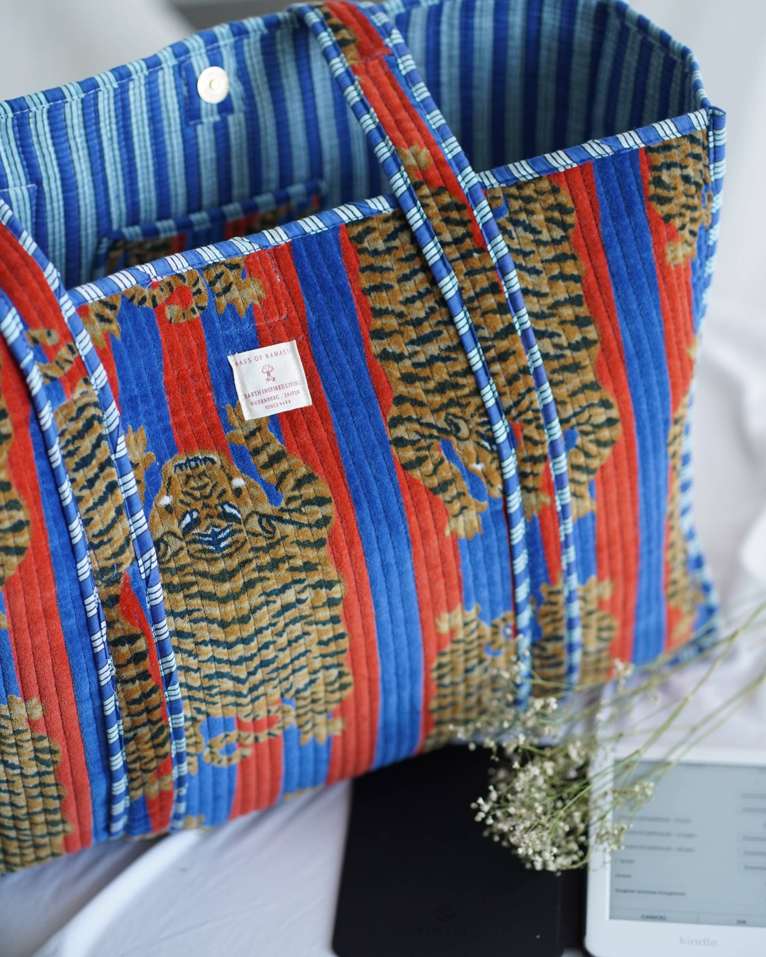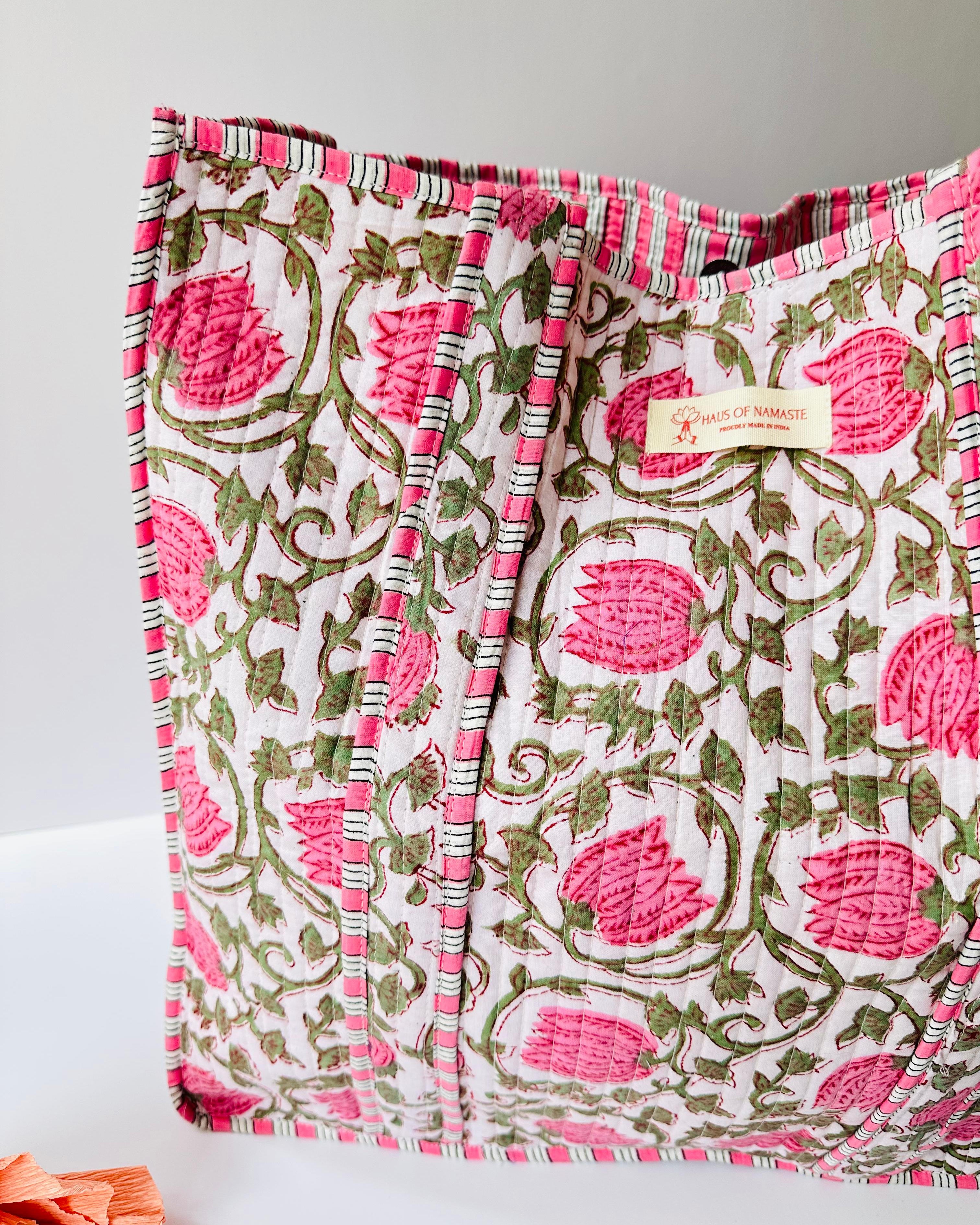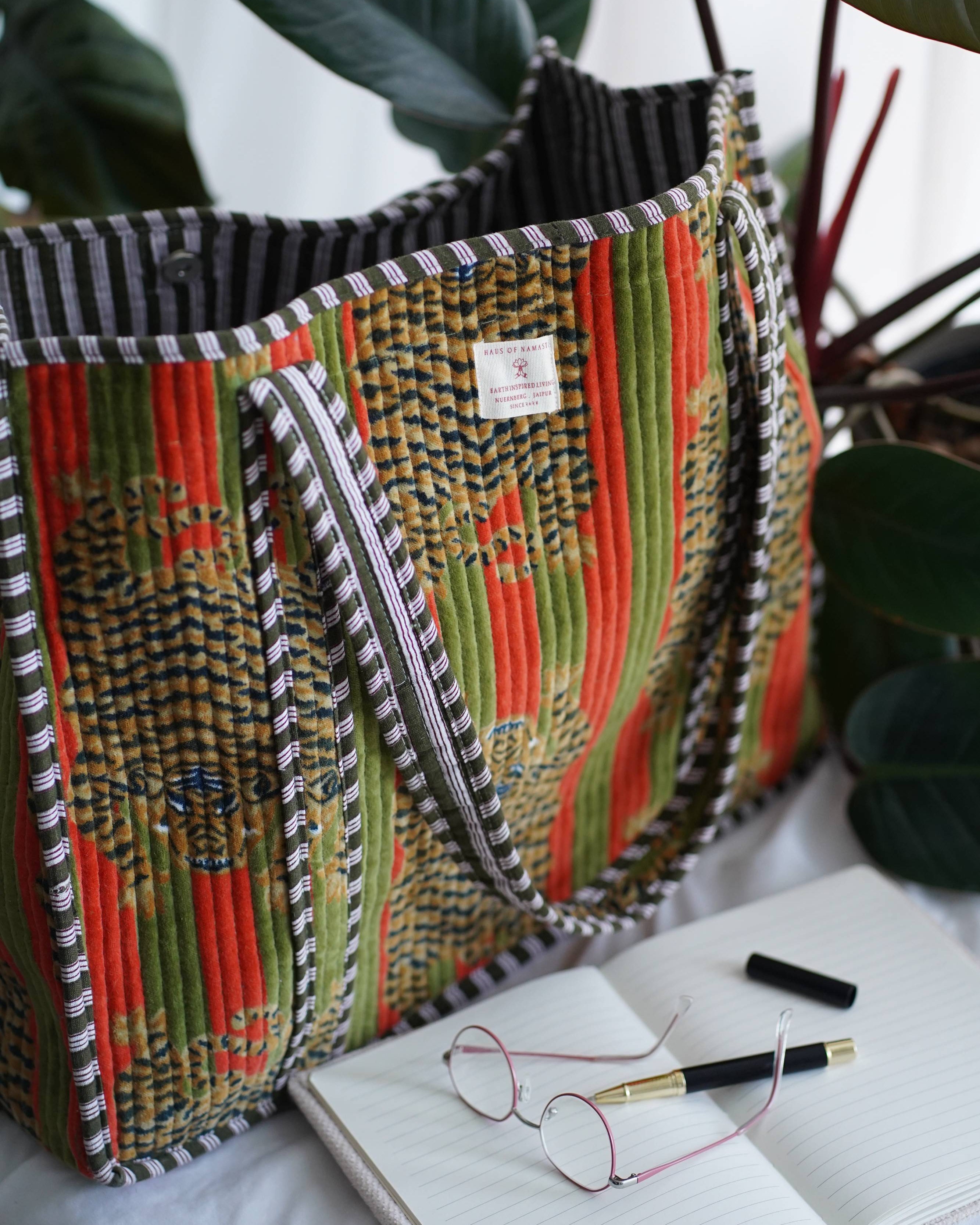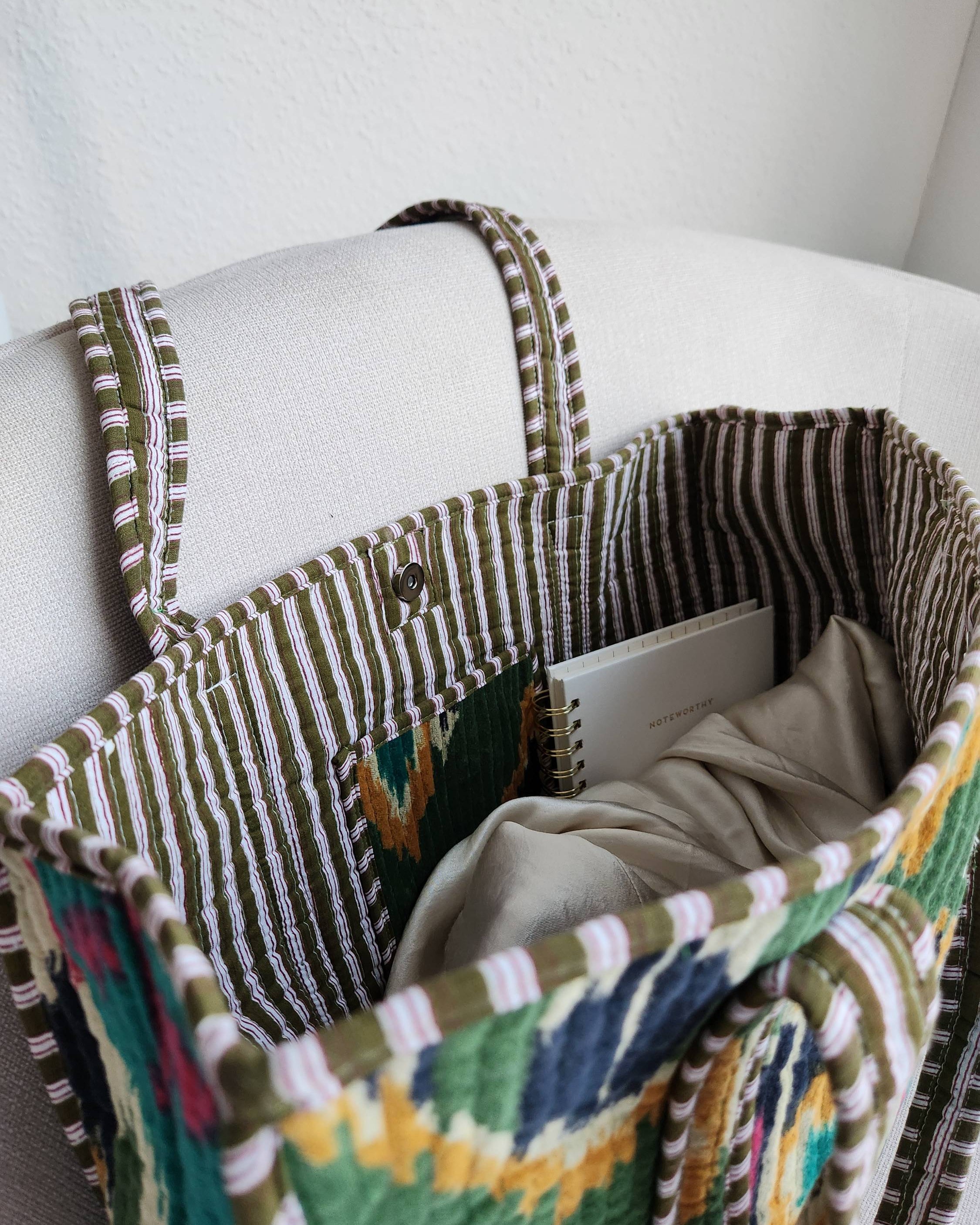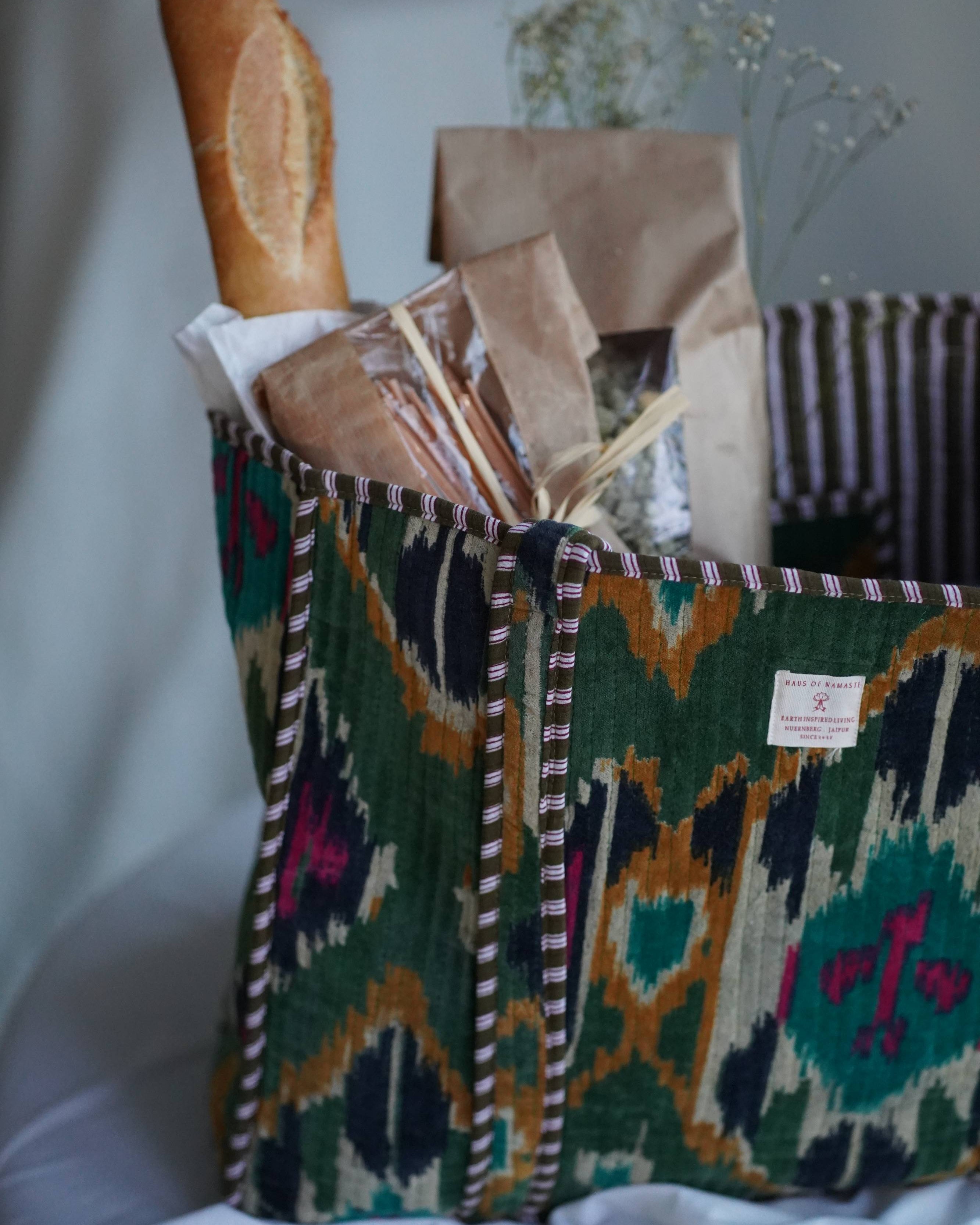 handgefertigt. Die farbenfrohen Blumenmuster werden per Handblockdruck auf die Wendetaschen