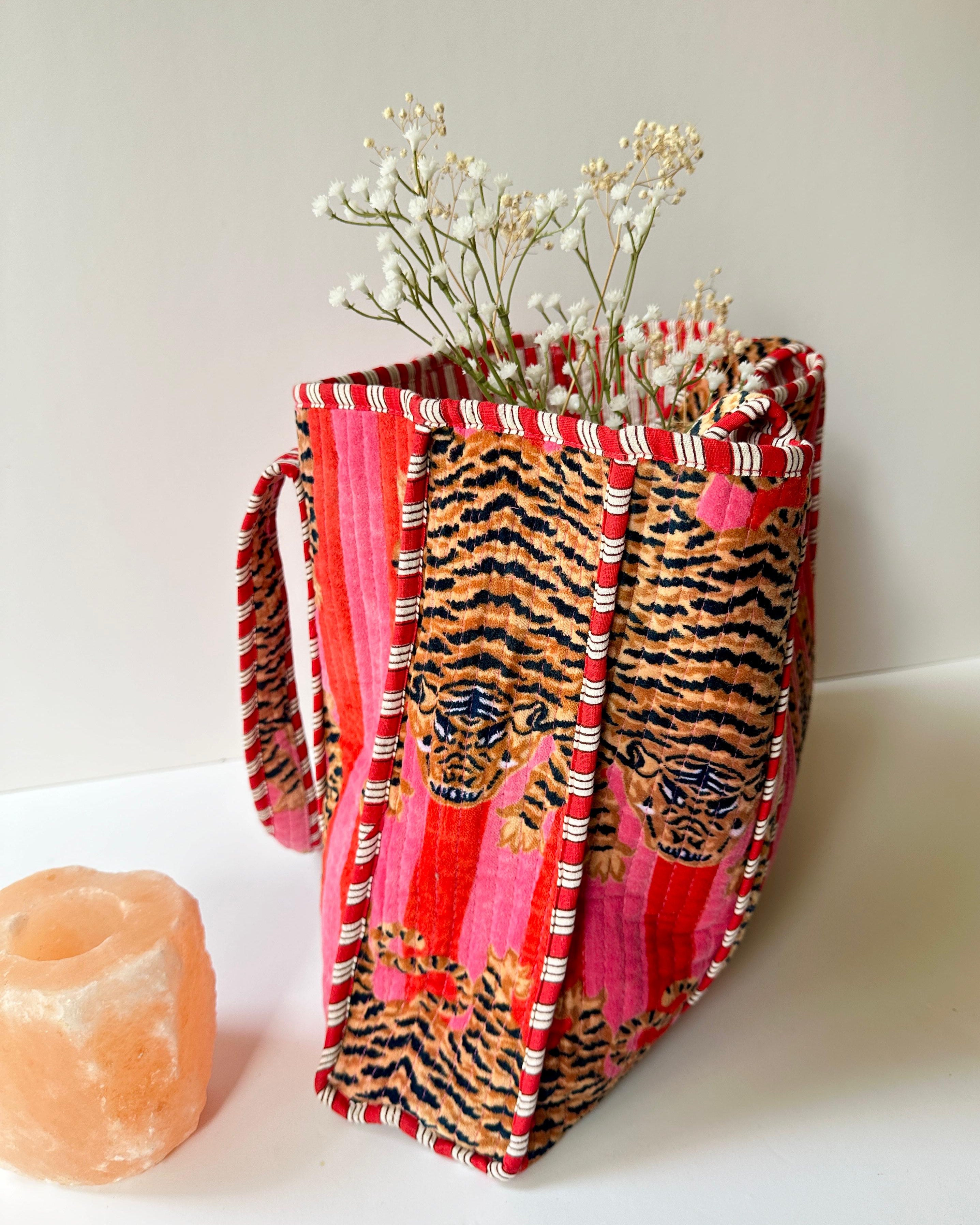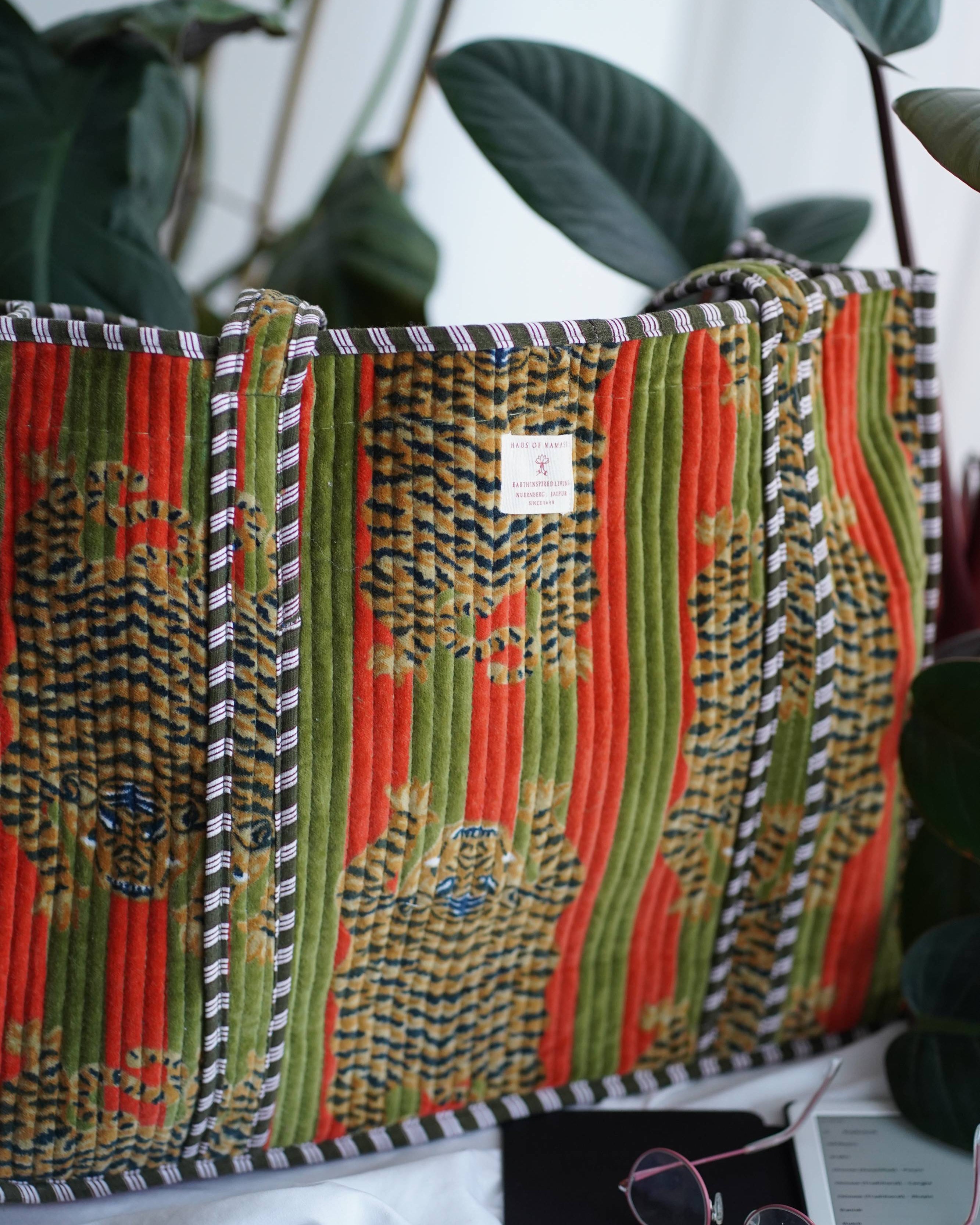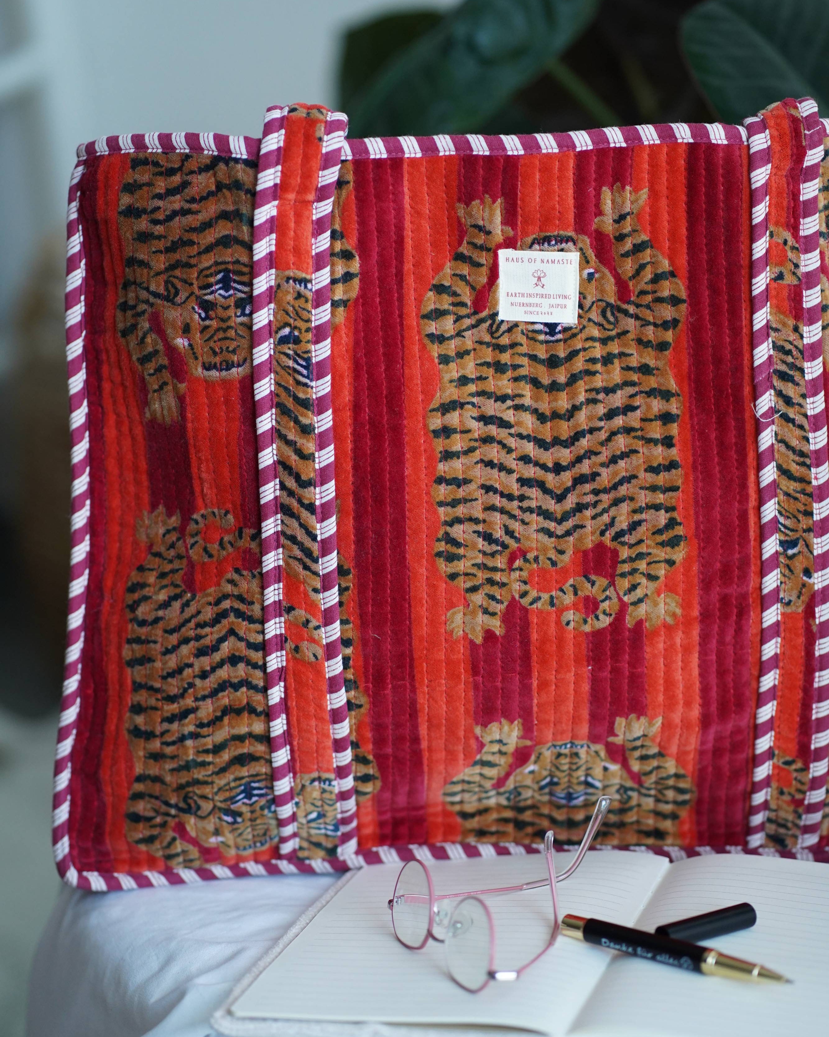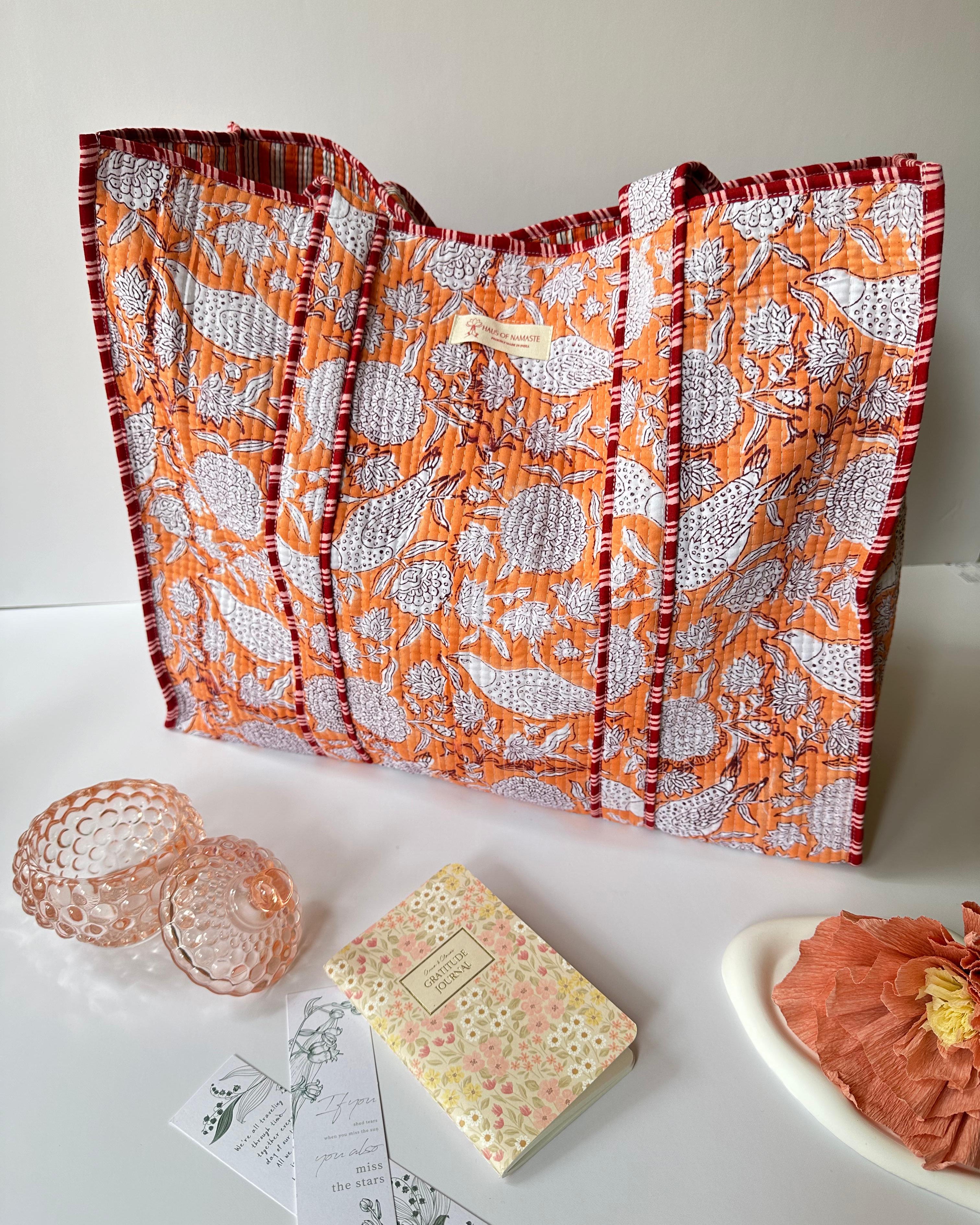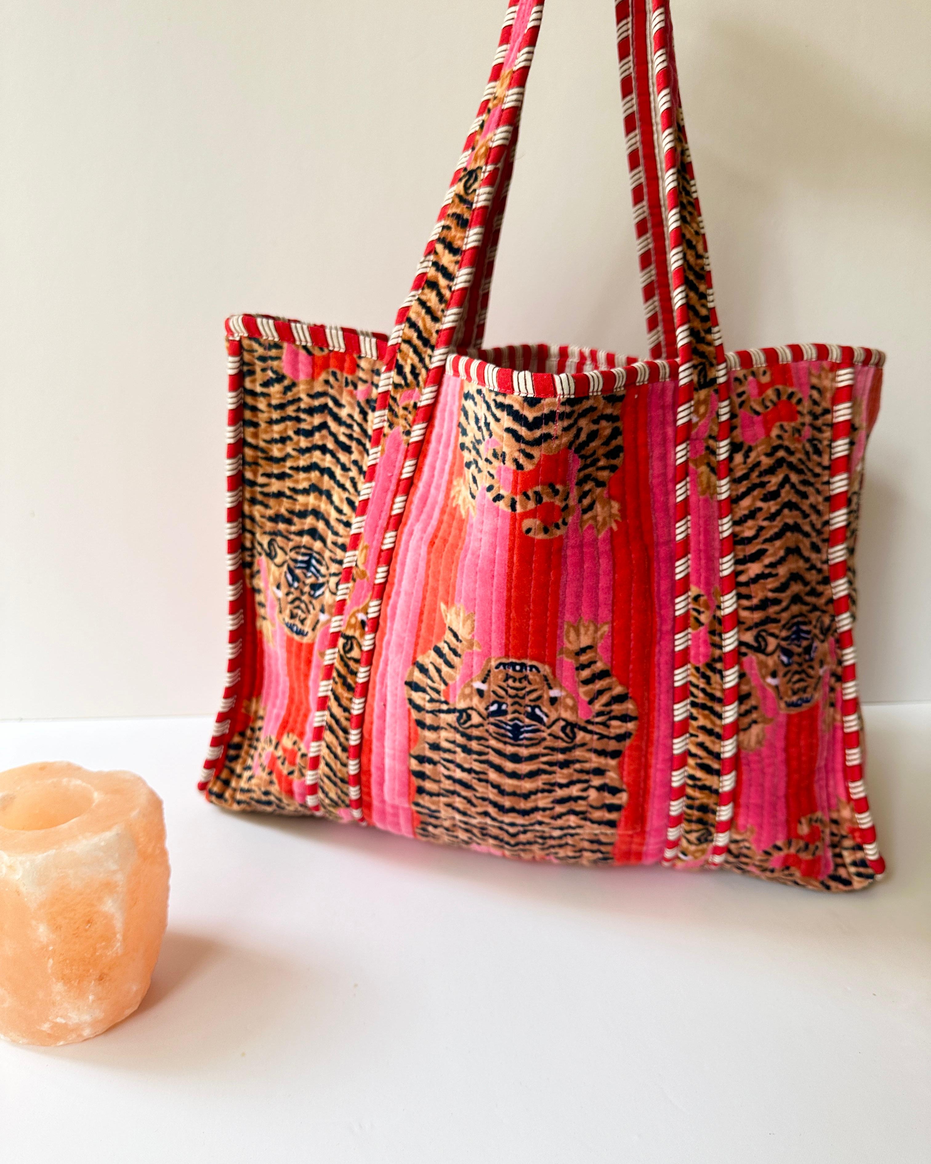 handgefertigt. Die farbenfrohen Blumenmuster werden per Handblockdruck auf die Wendetaschen