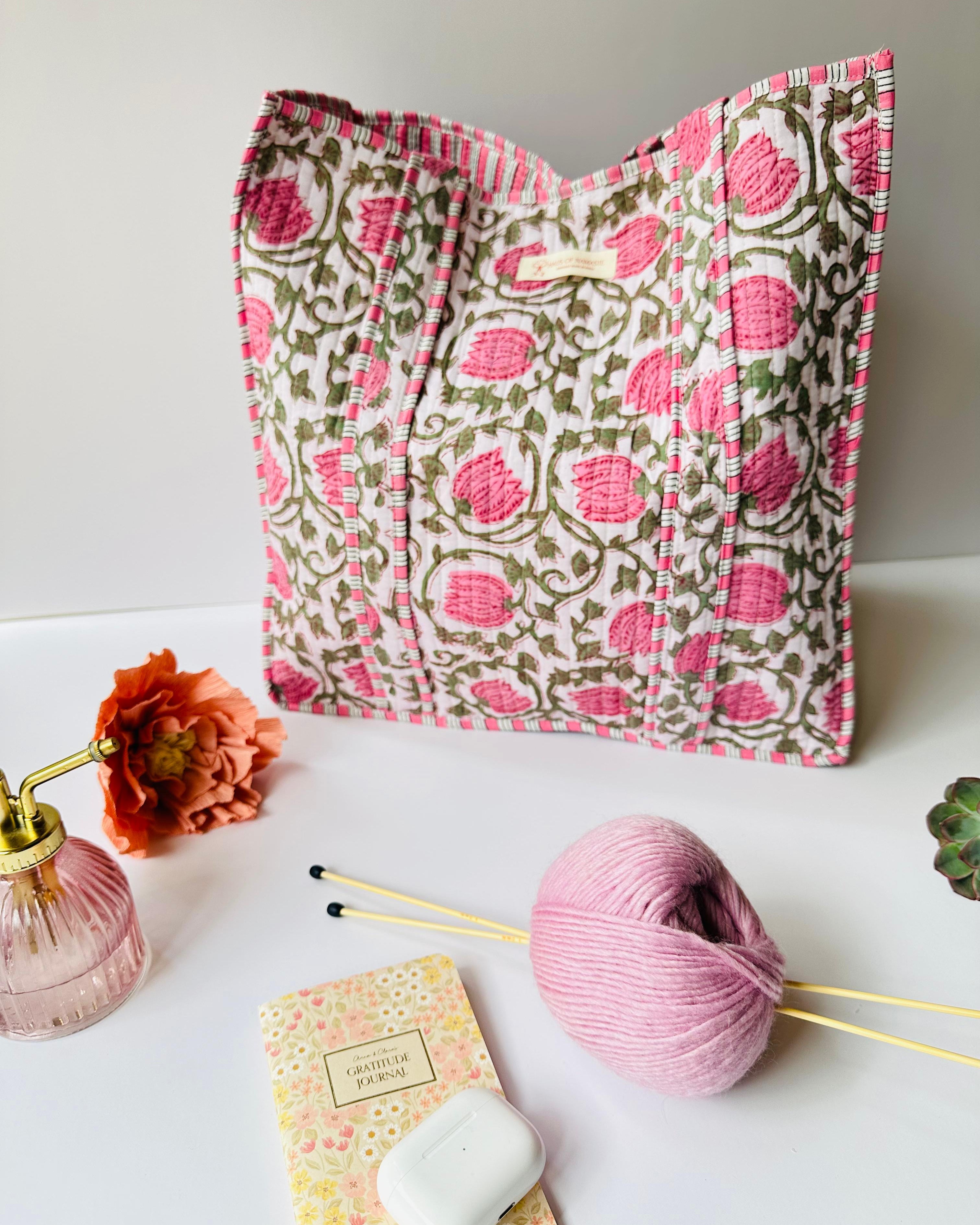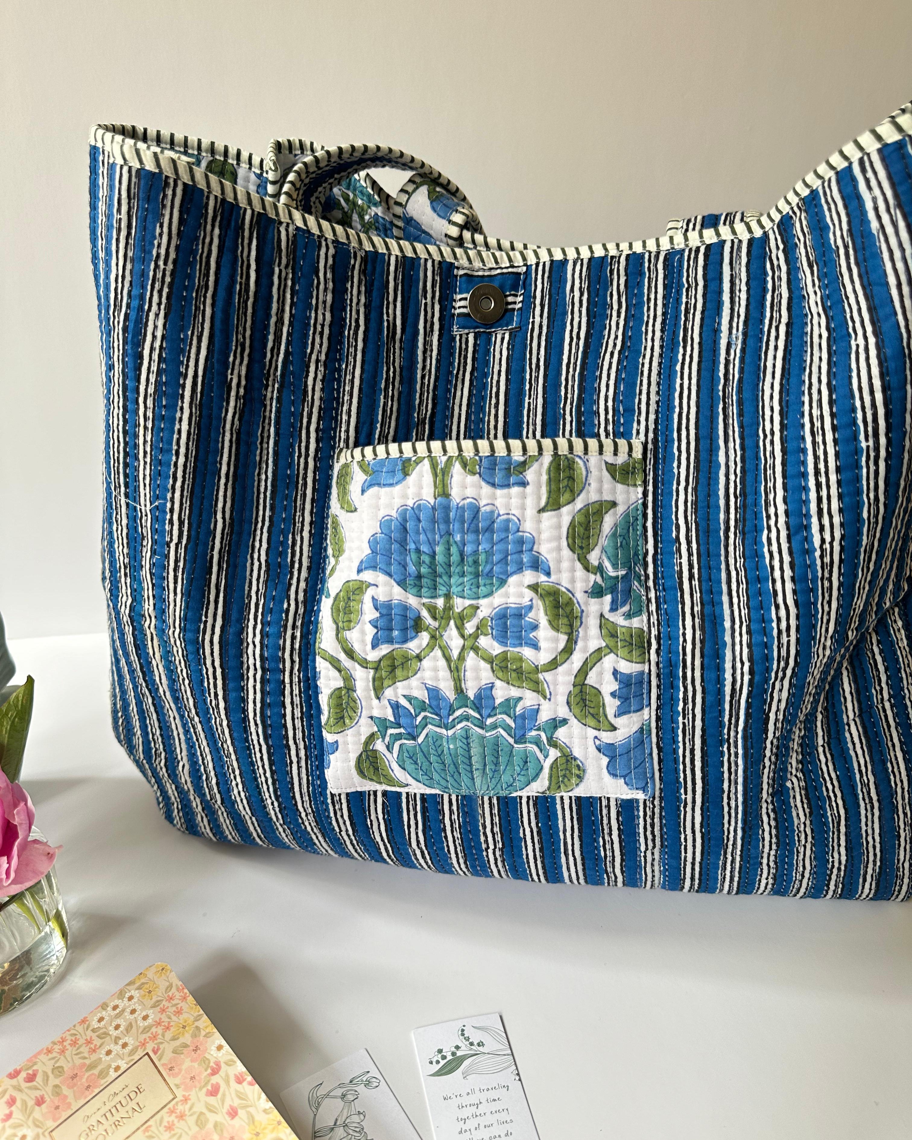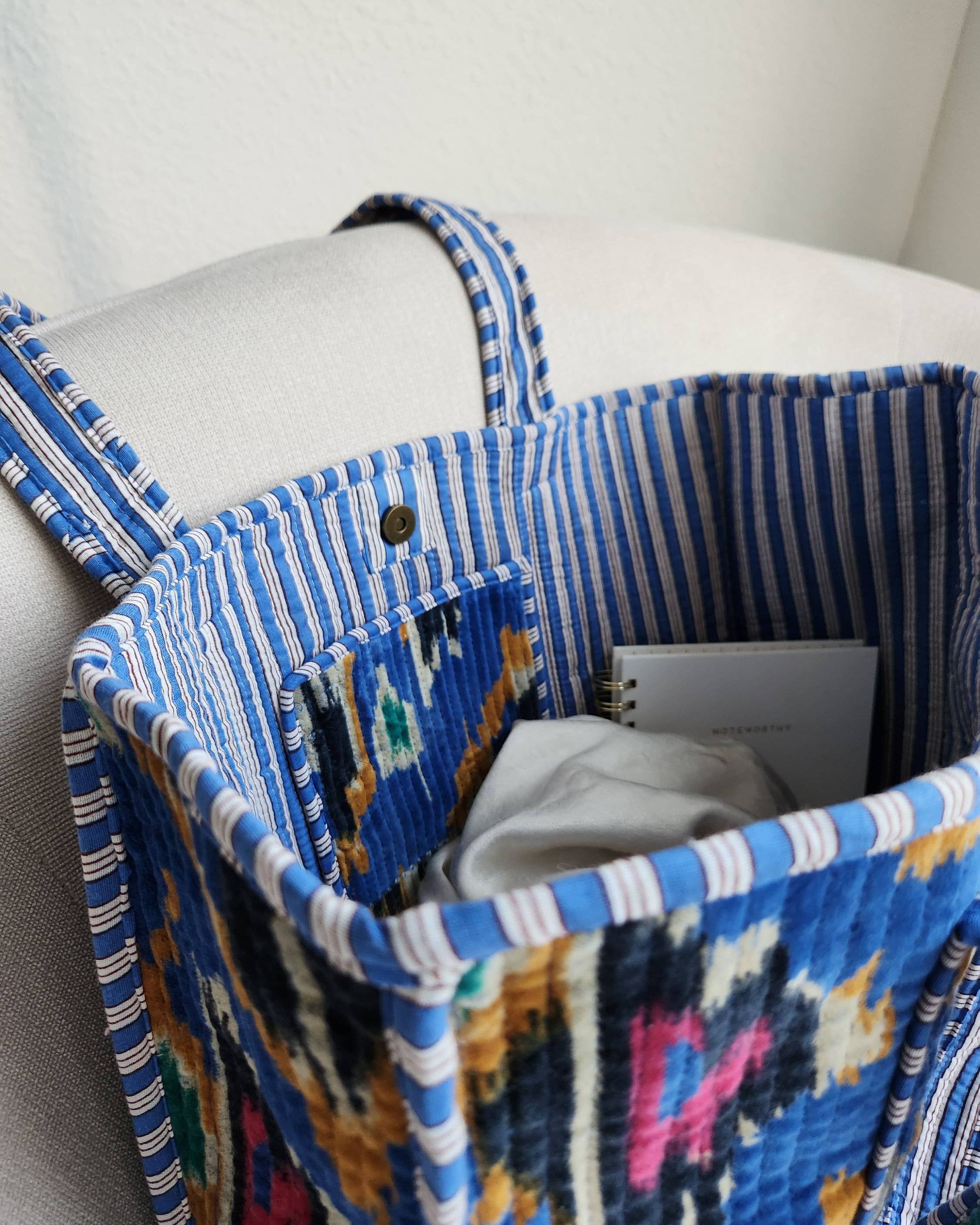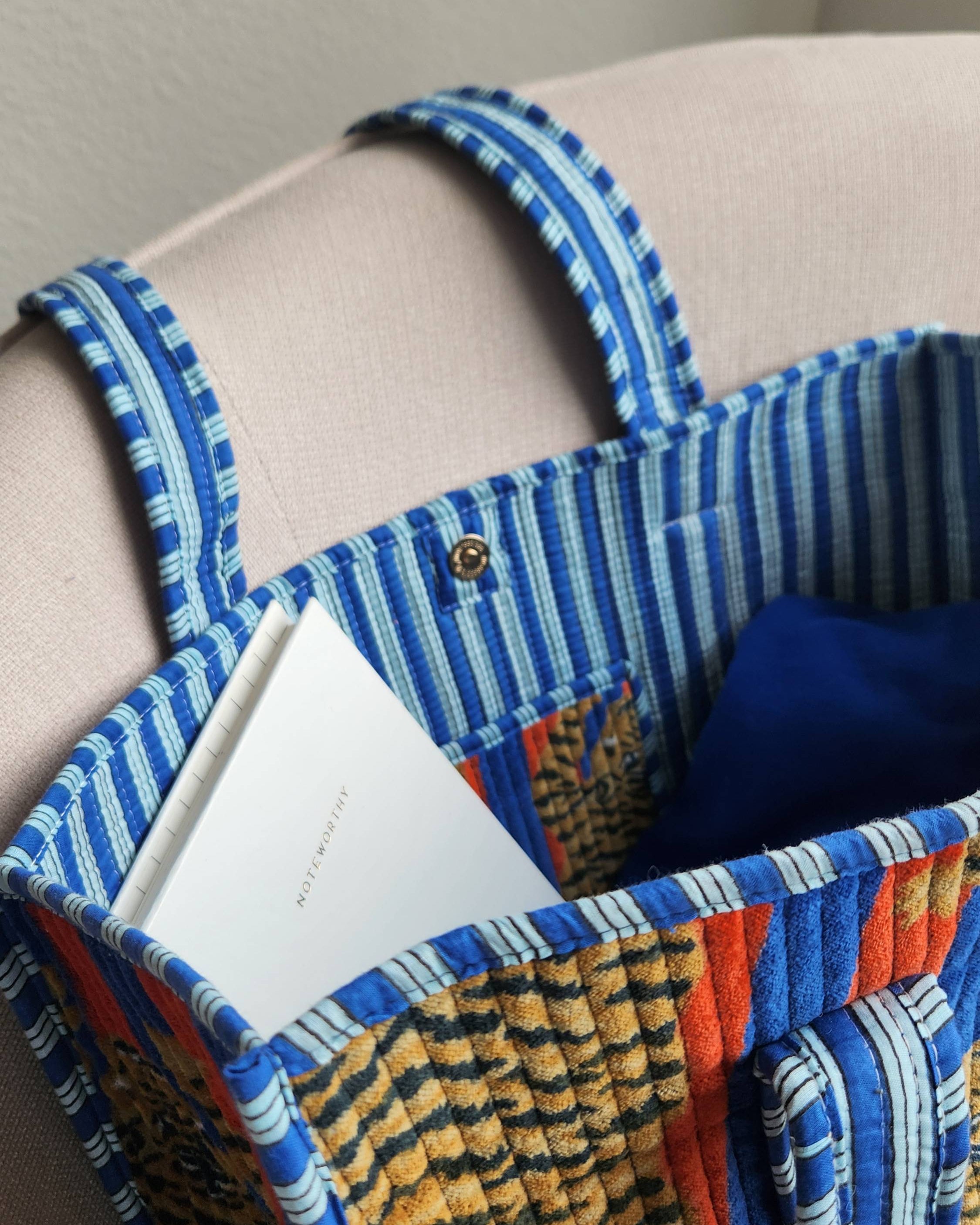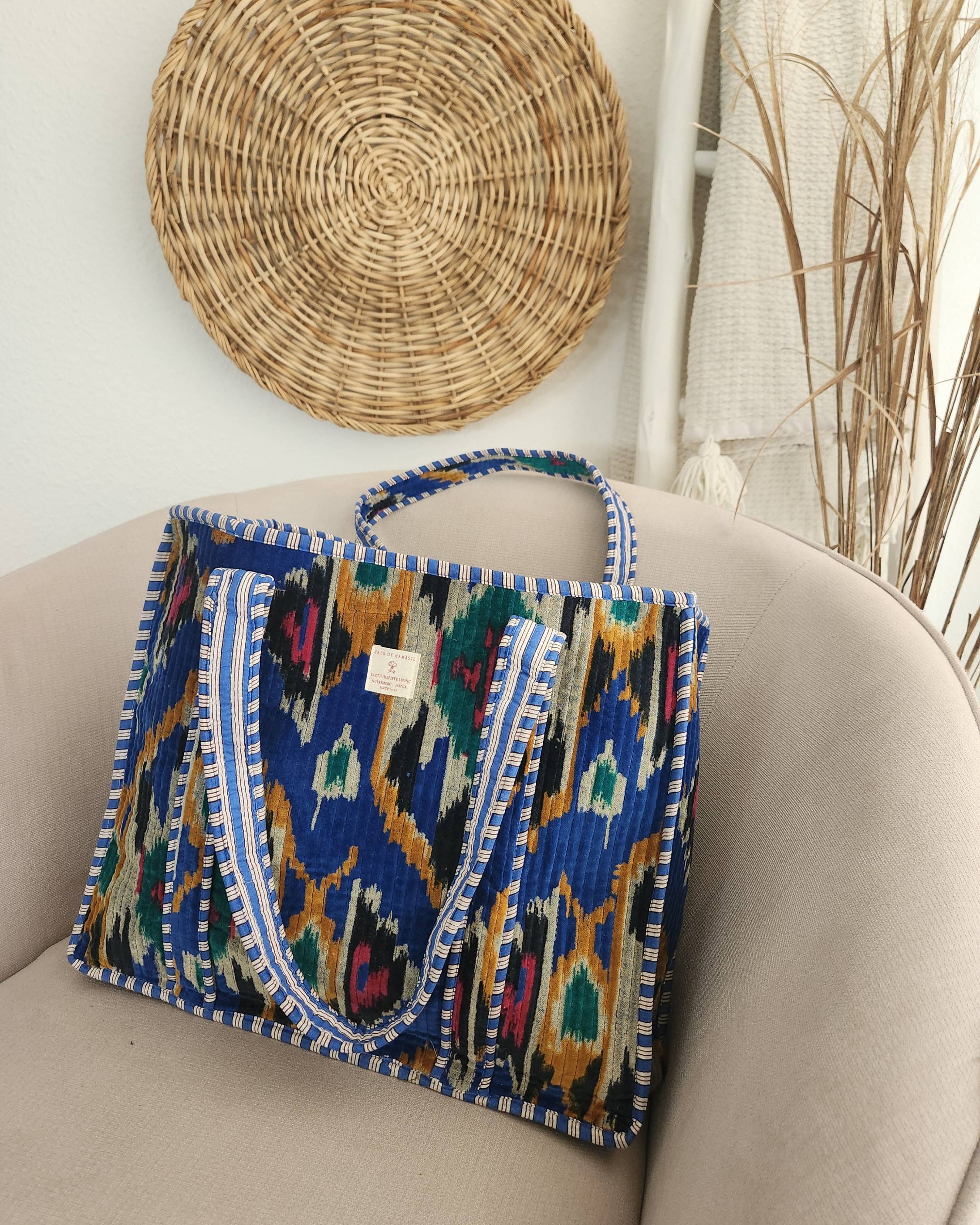 handgefertigt. Die farbenfrohen Blumenmuster werden per Handblockdruck auf die Wendetaschen