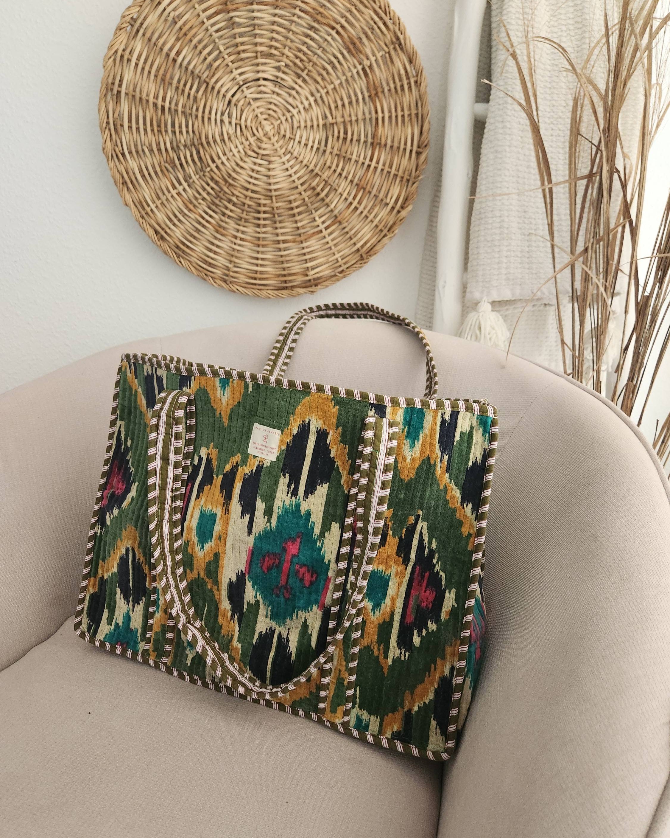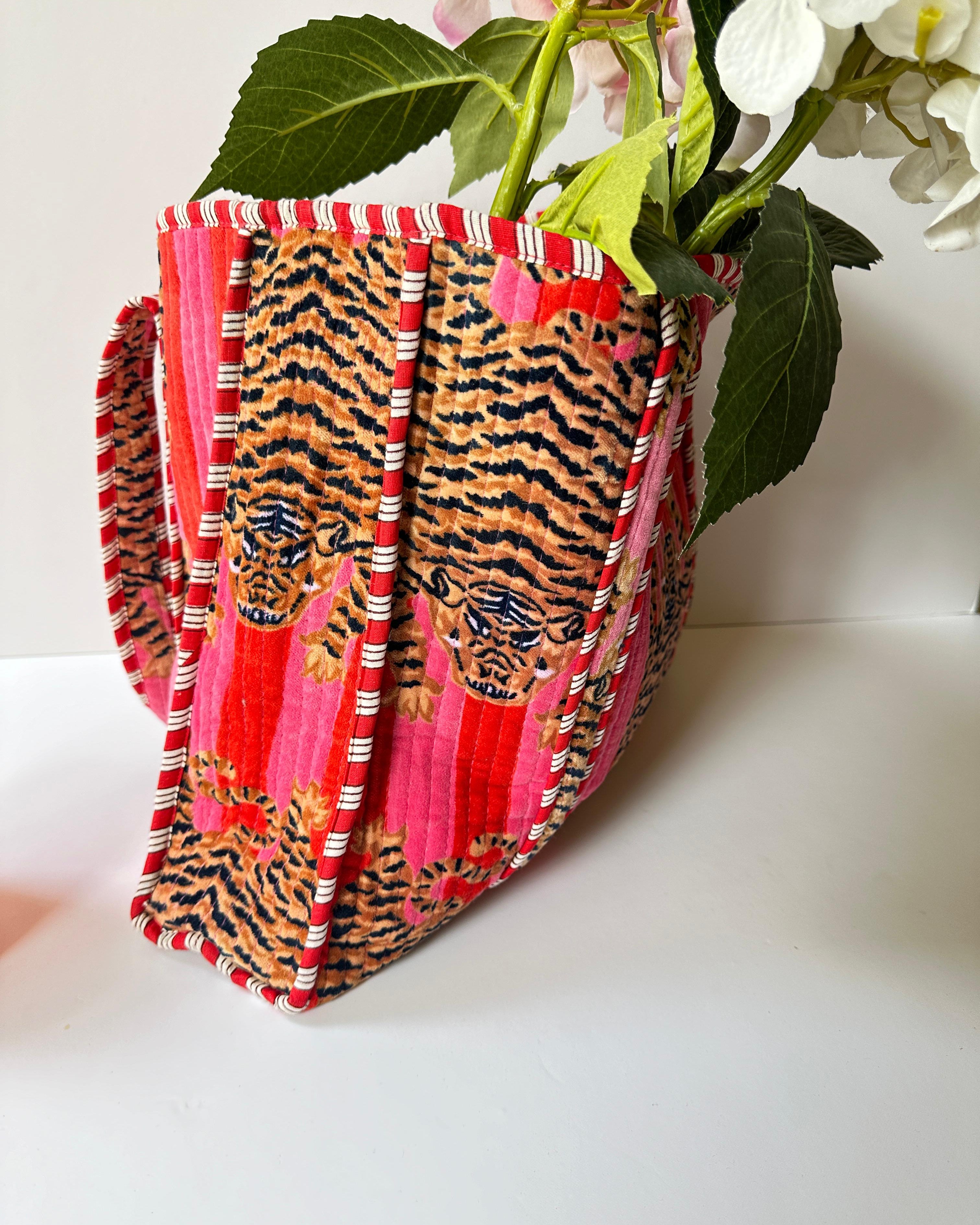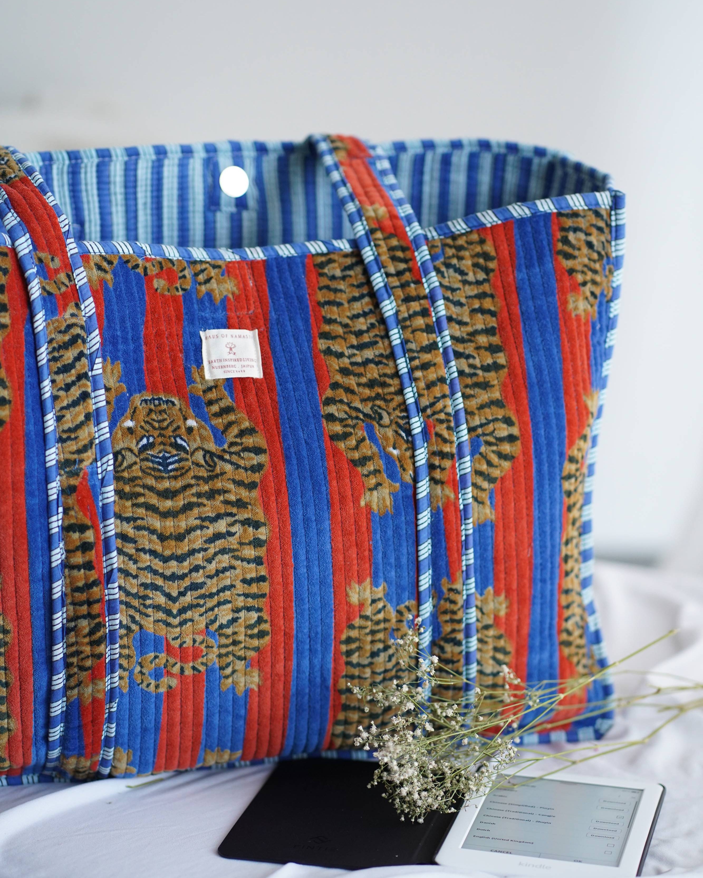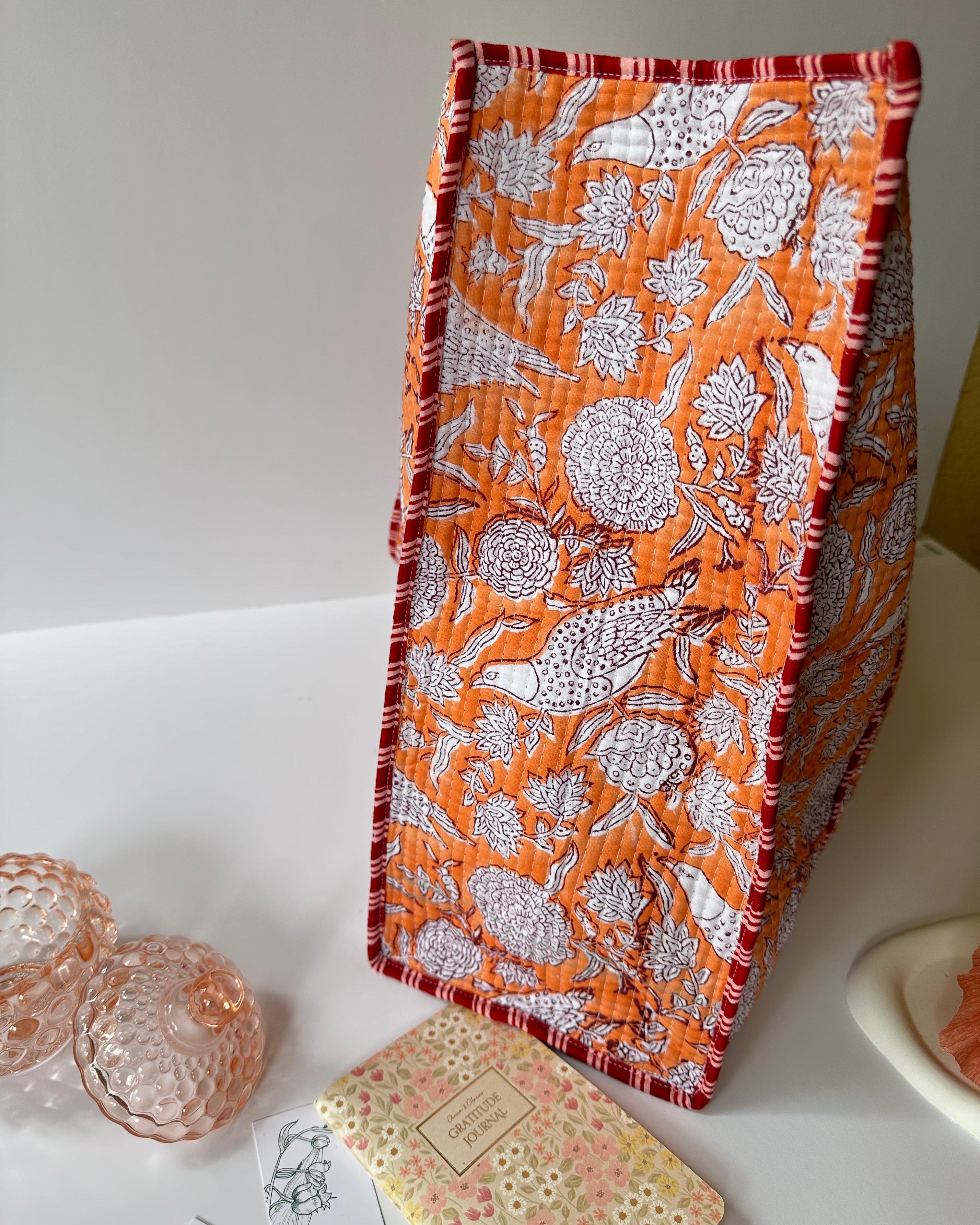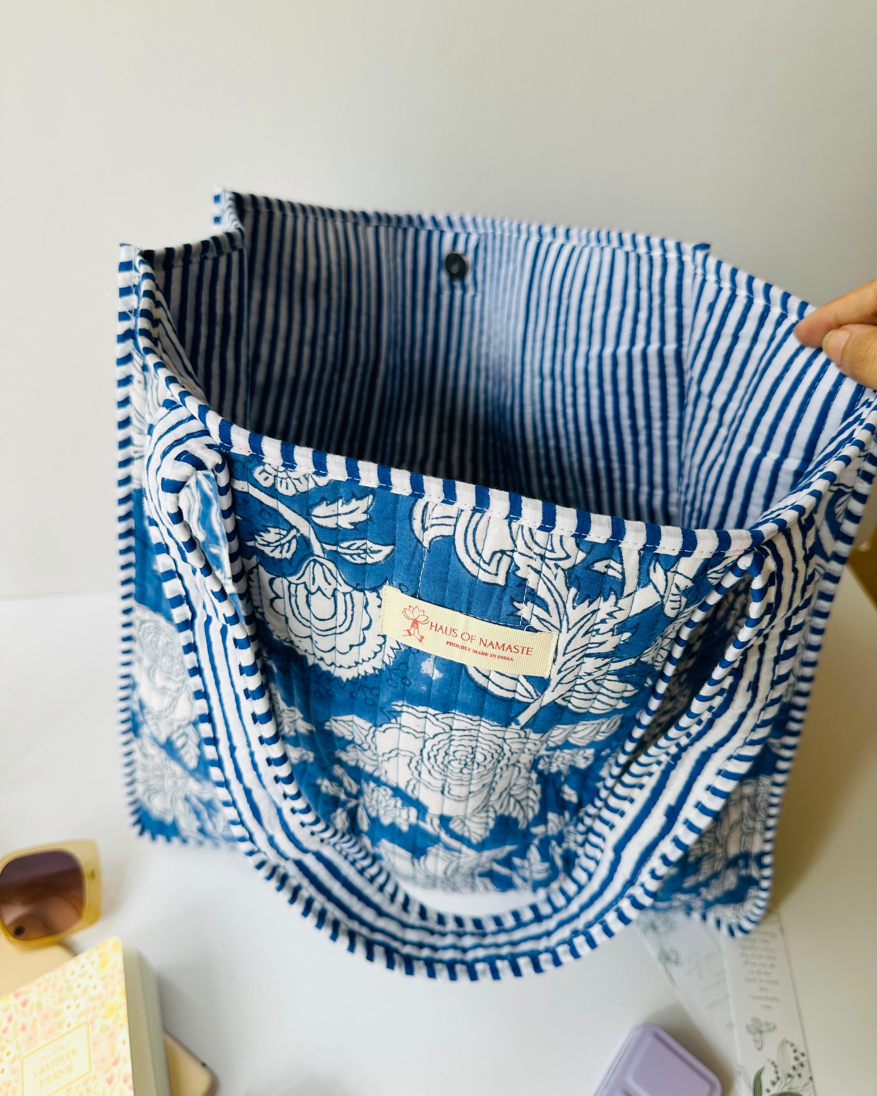 handgefertigt. Die farbenfrohen Blumenmuster werden per Handblockdruck auf die Wendetaschen