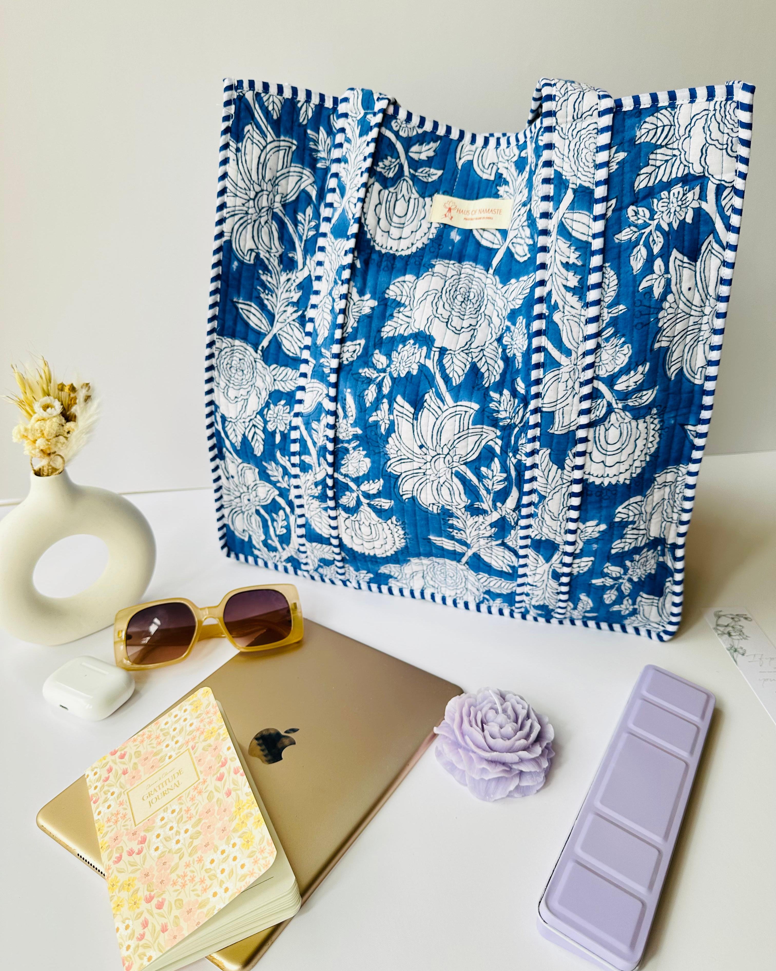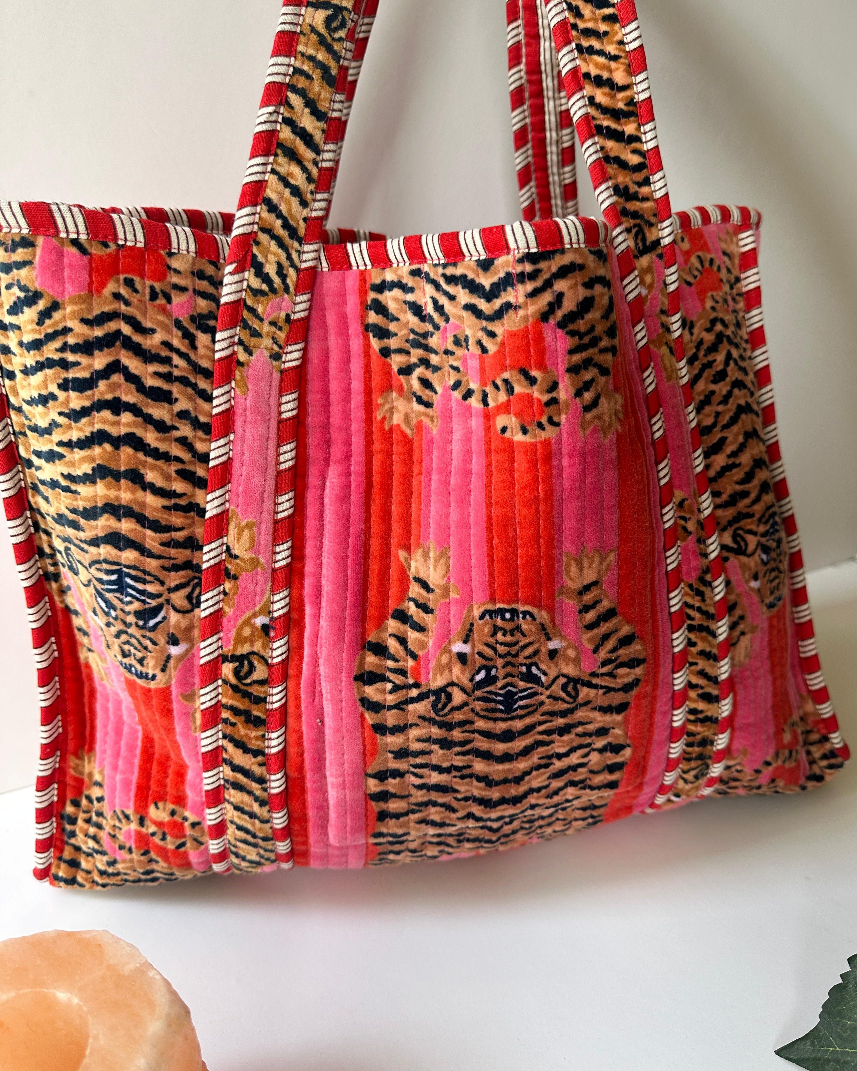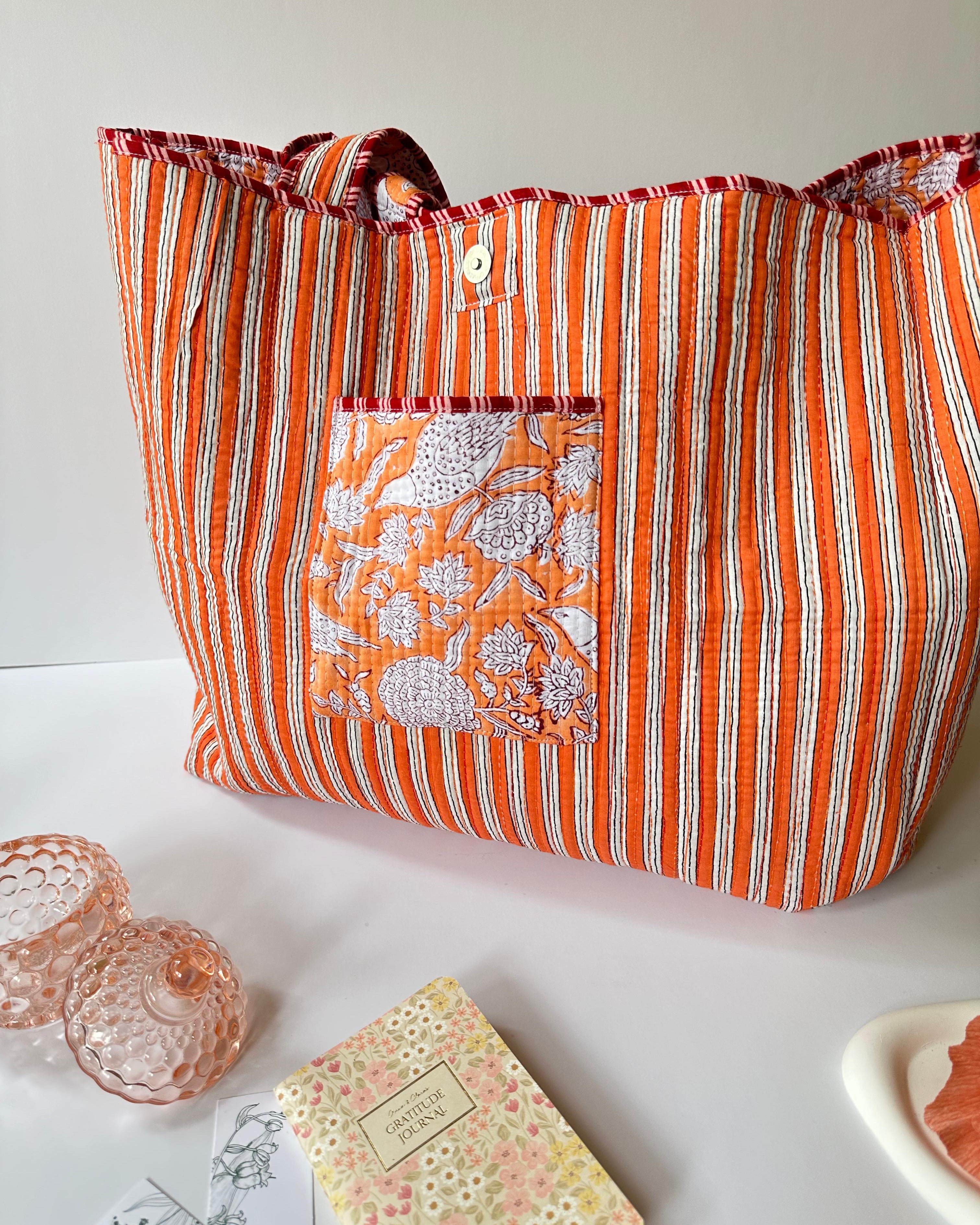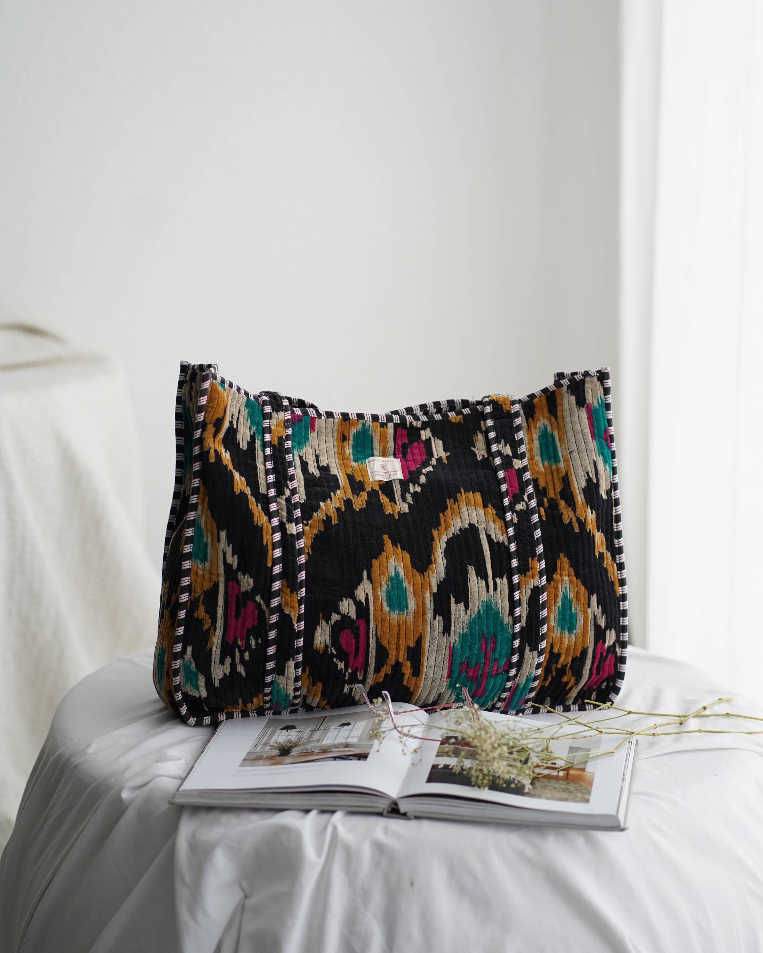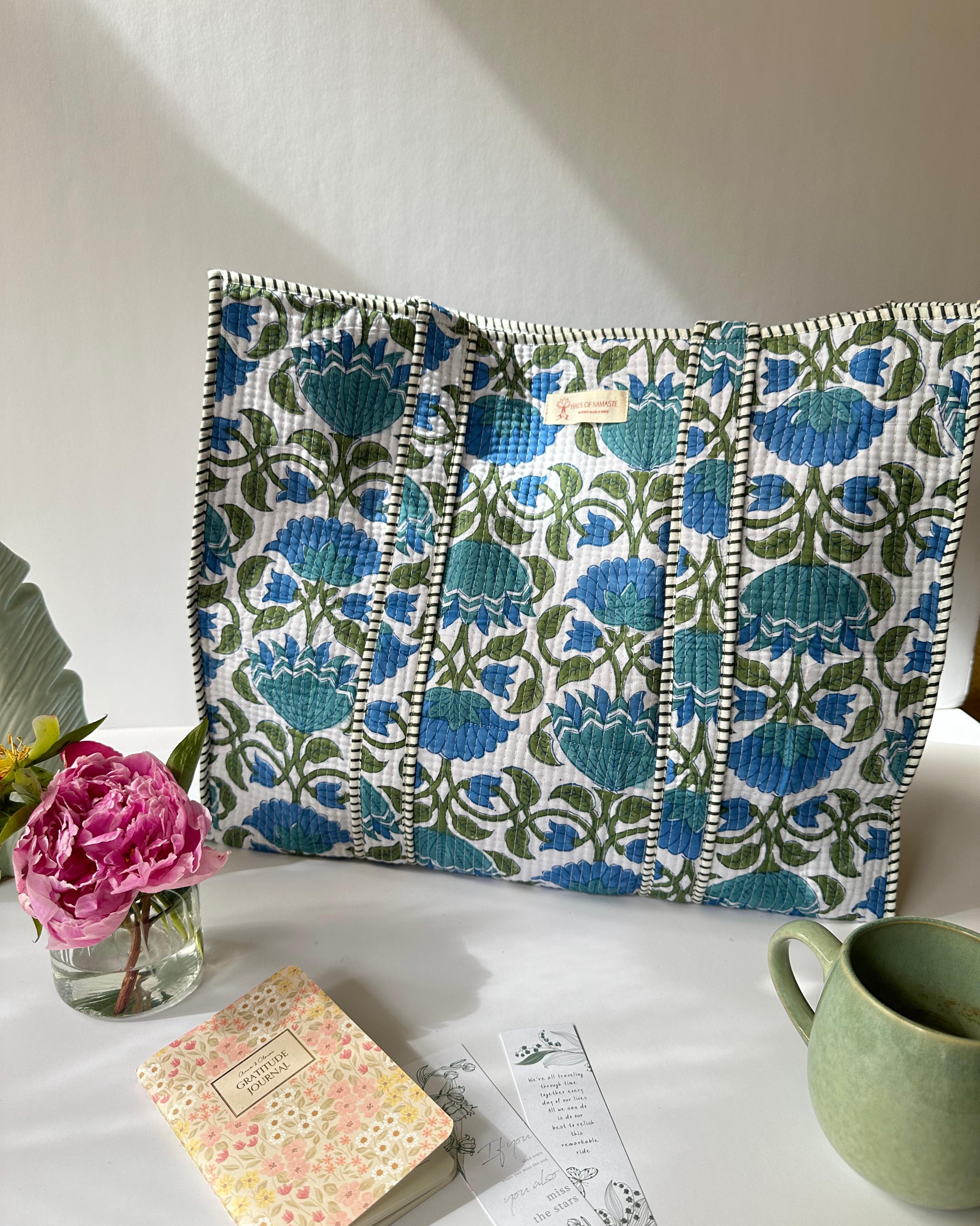 handgefertigt. Die farbenfrohen Blumenmuster werden per Handblockdruck auf die Wendetaschen