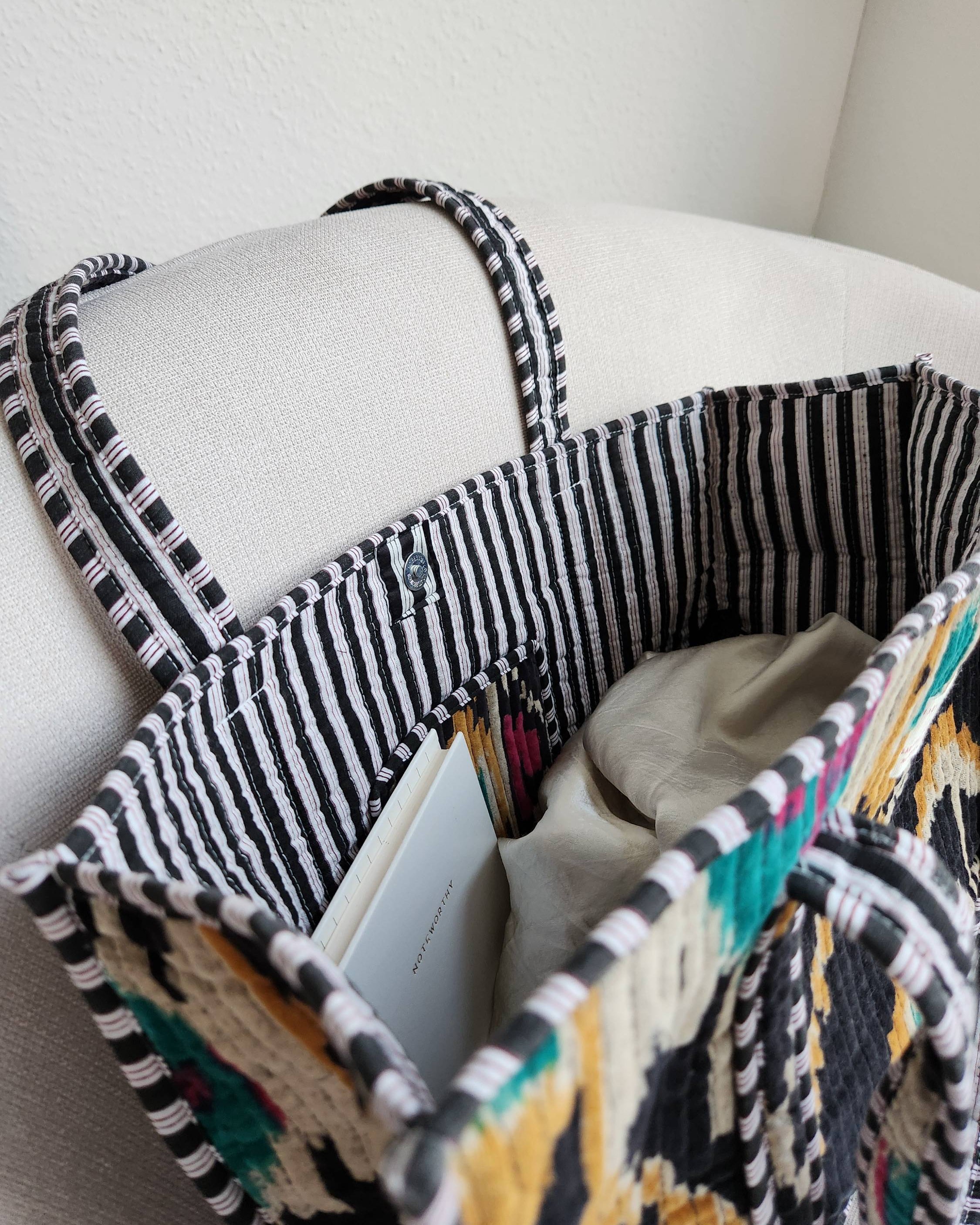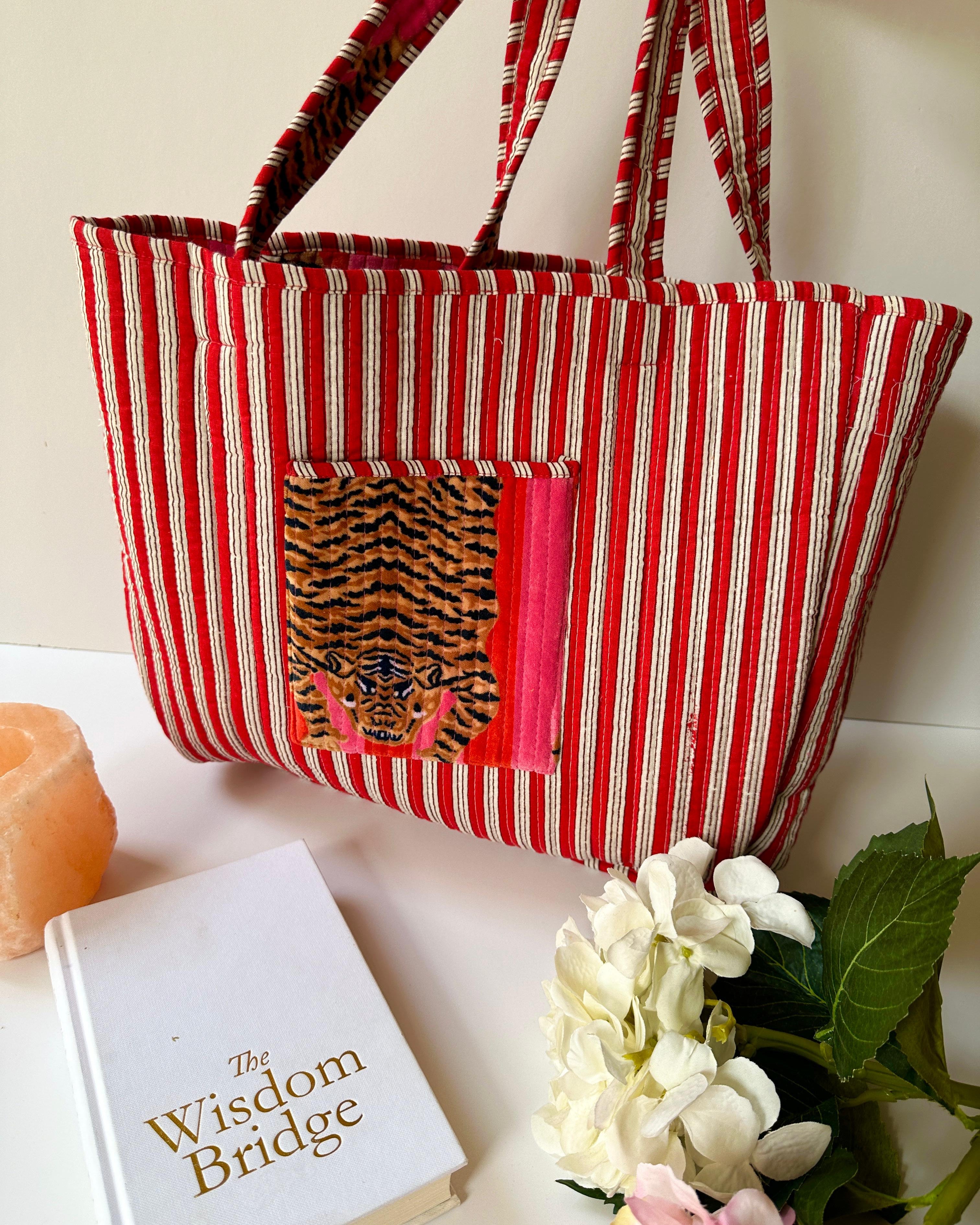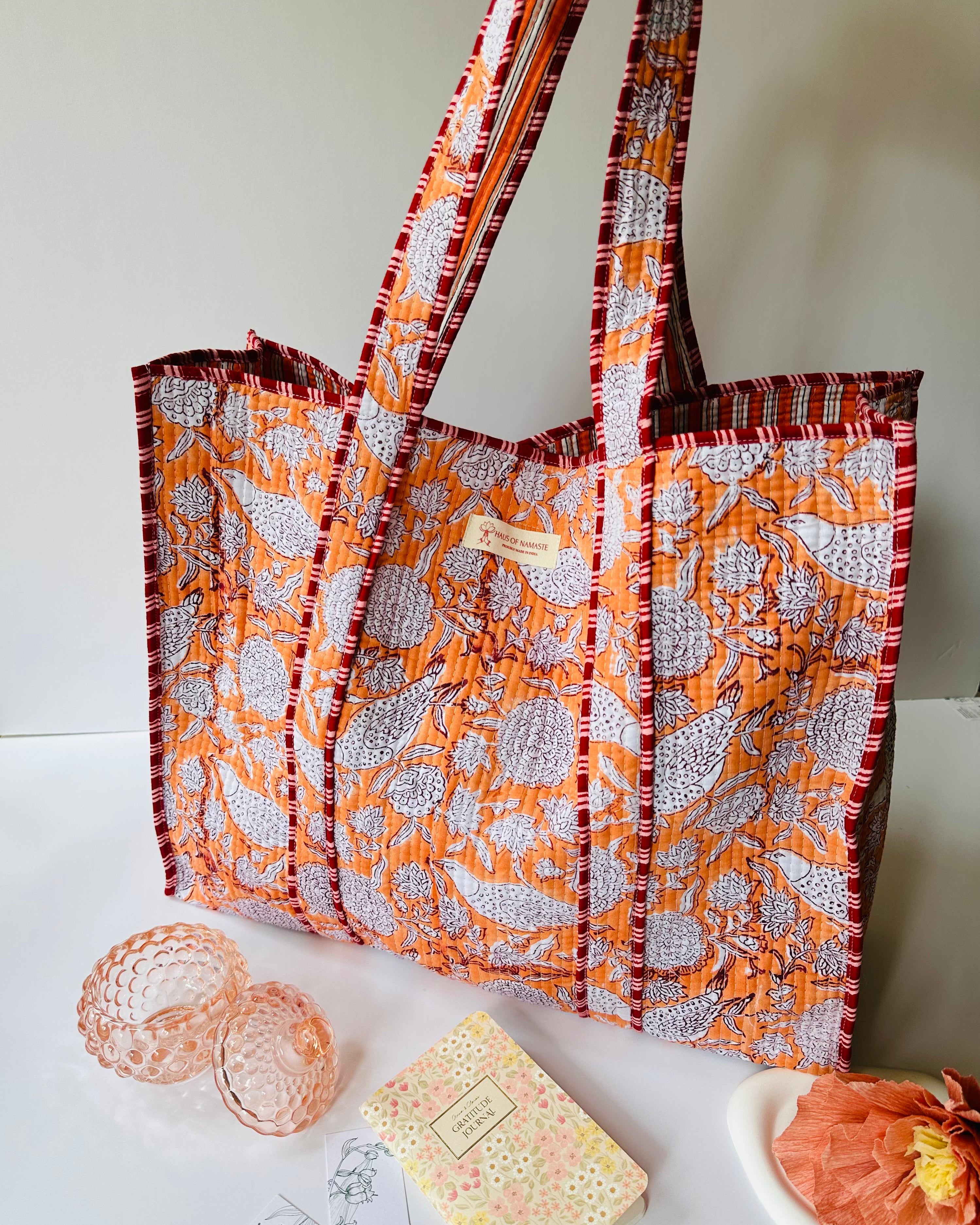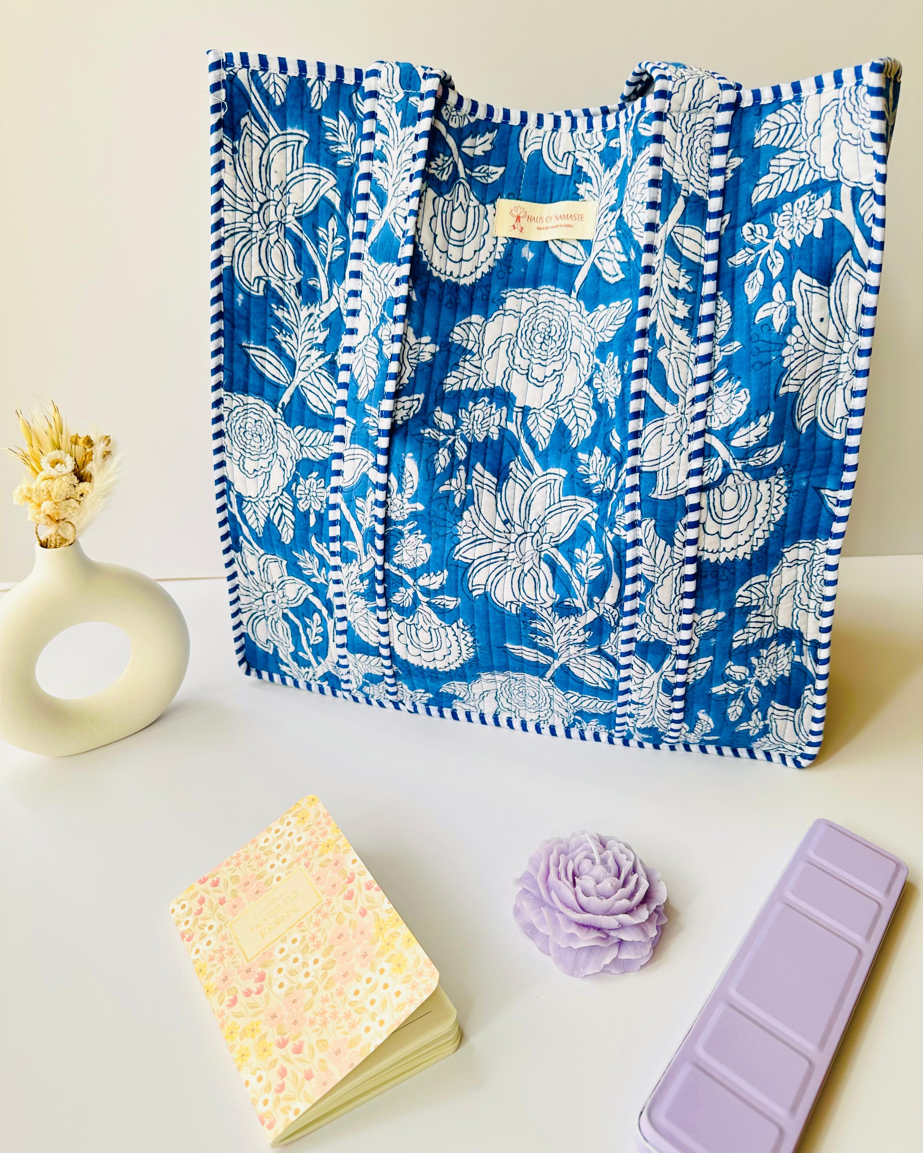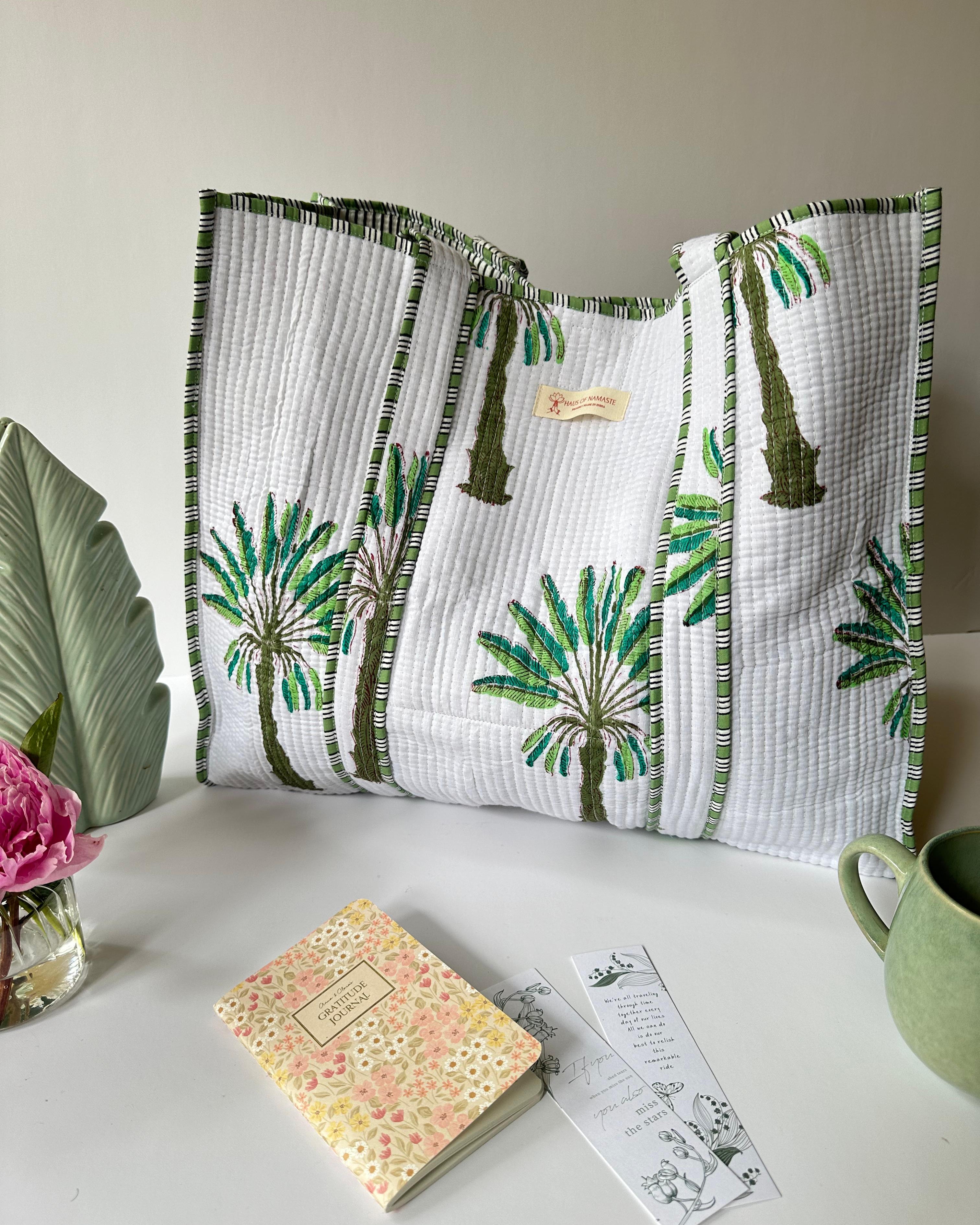 handgefertigt. Die farbenfrohen Blumenmuster werden per Handblockdruck auf die Wendetaschen