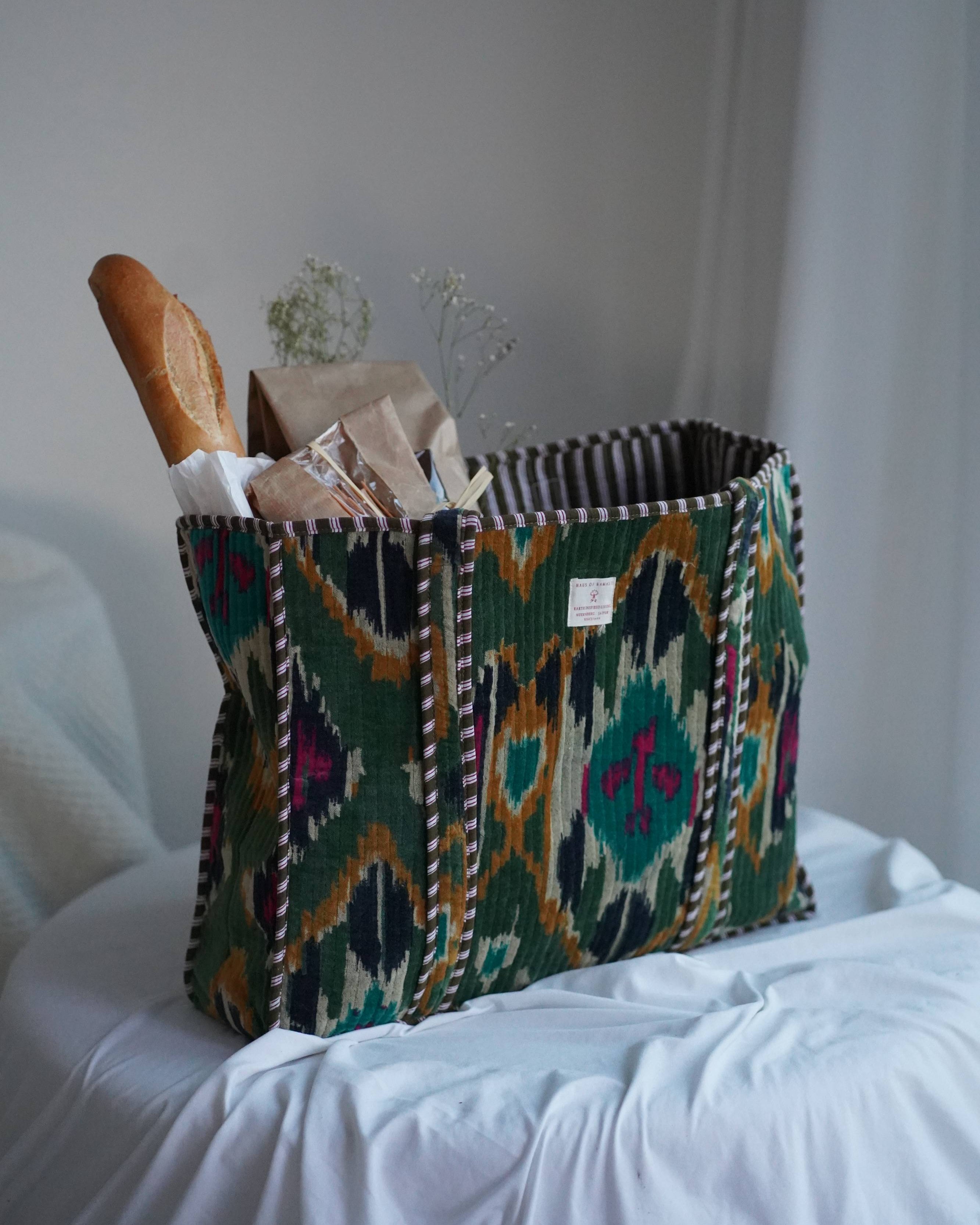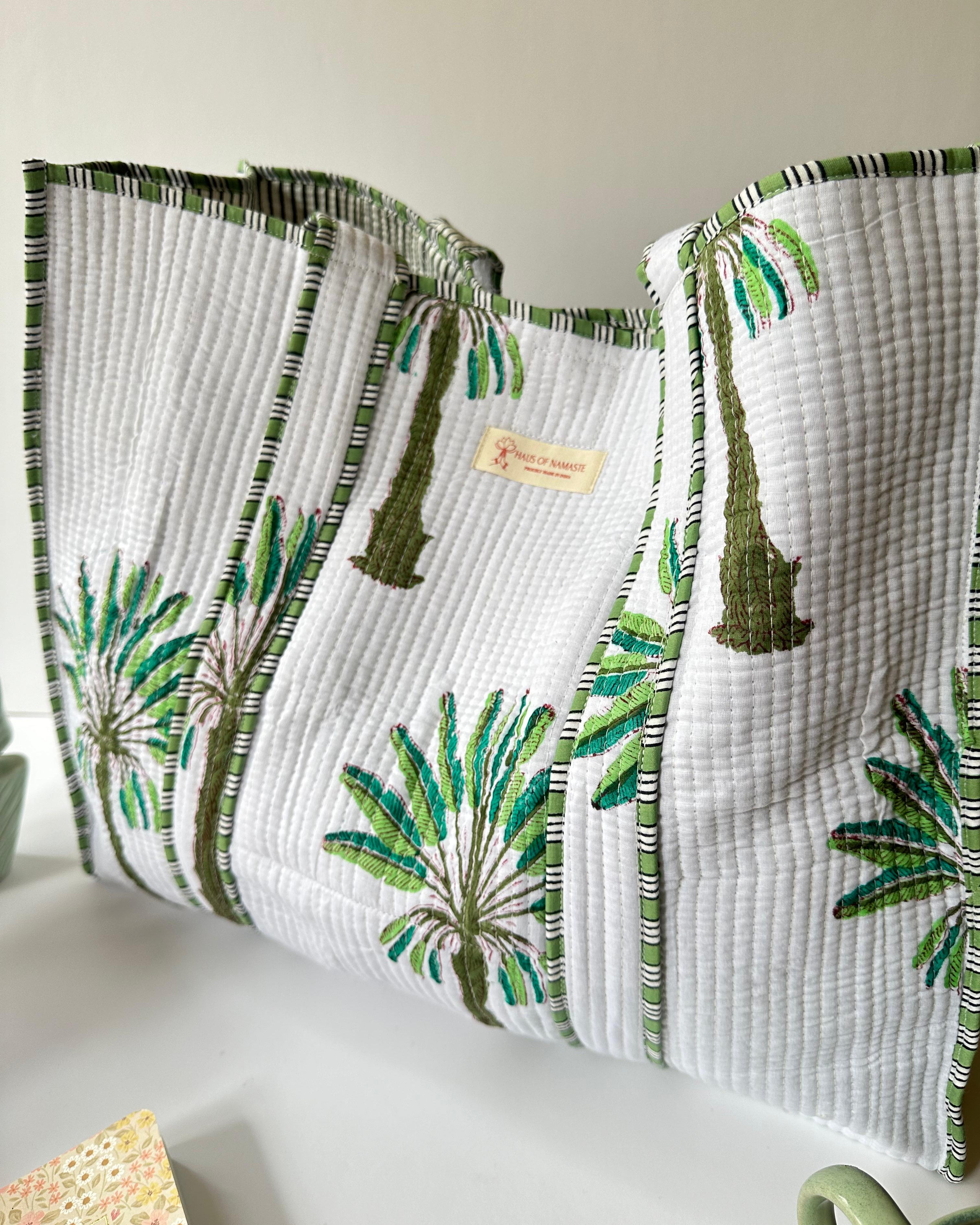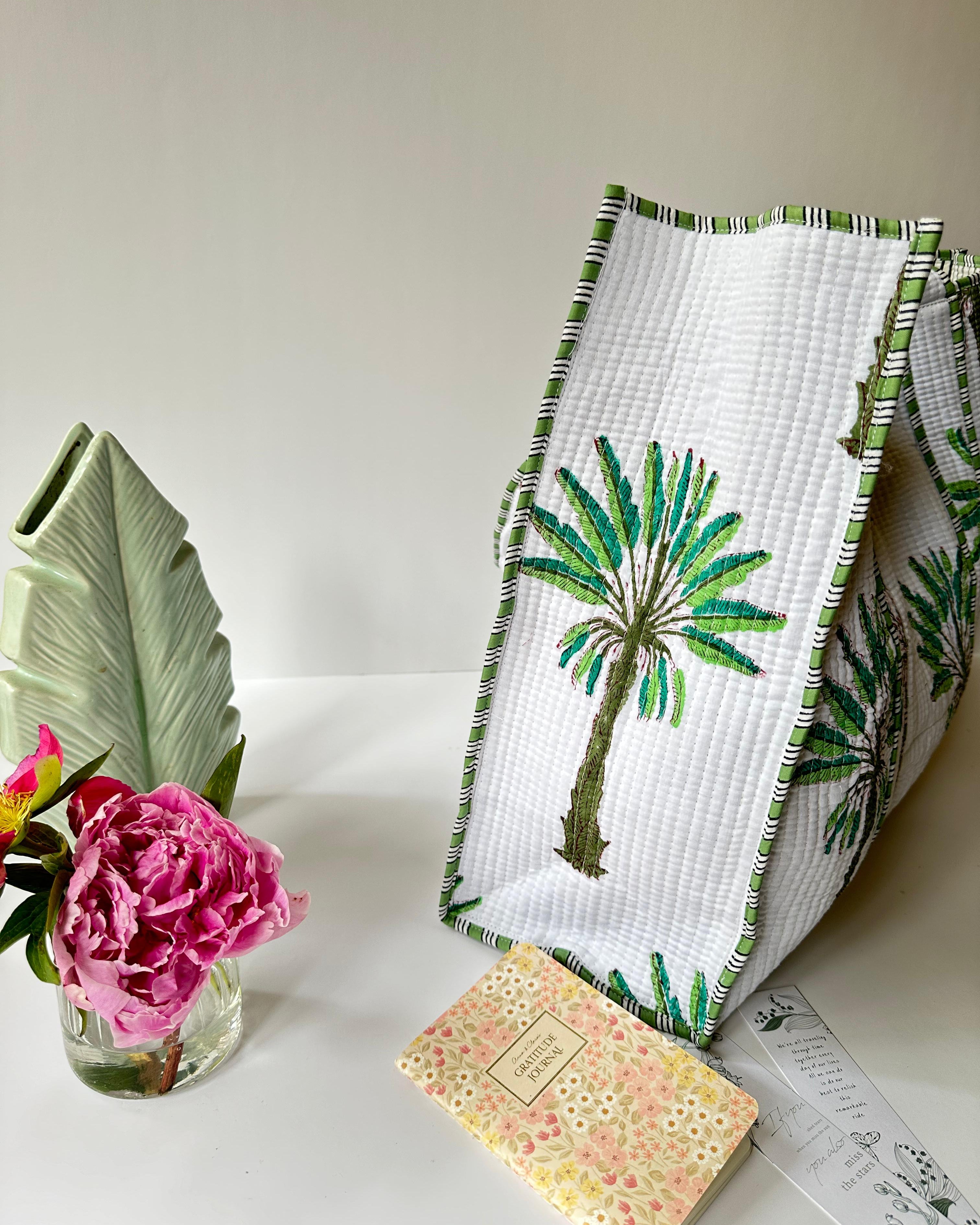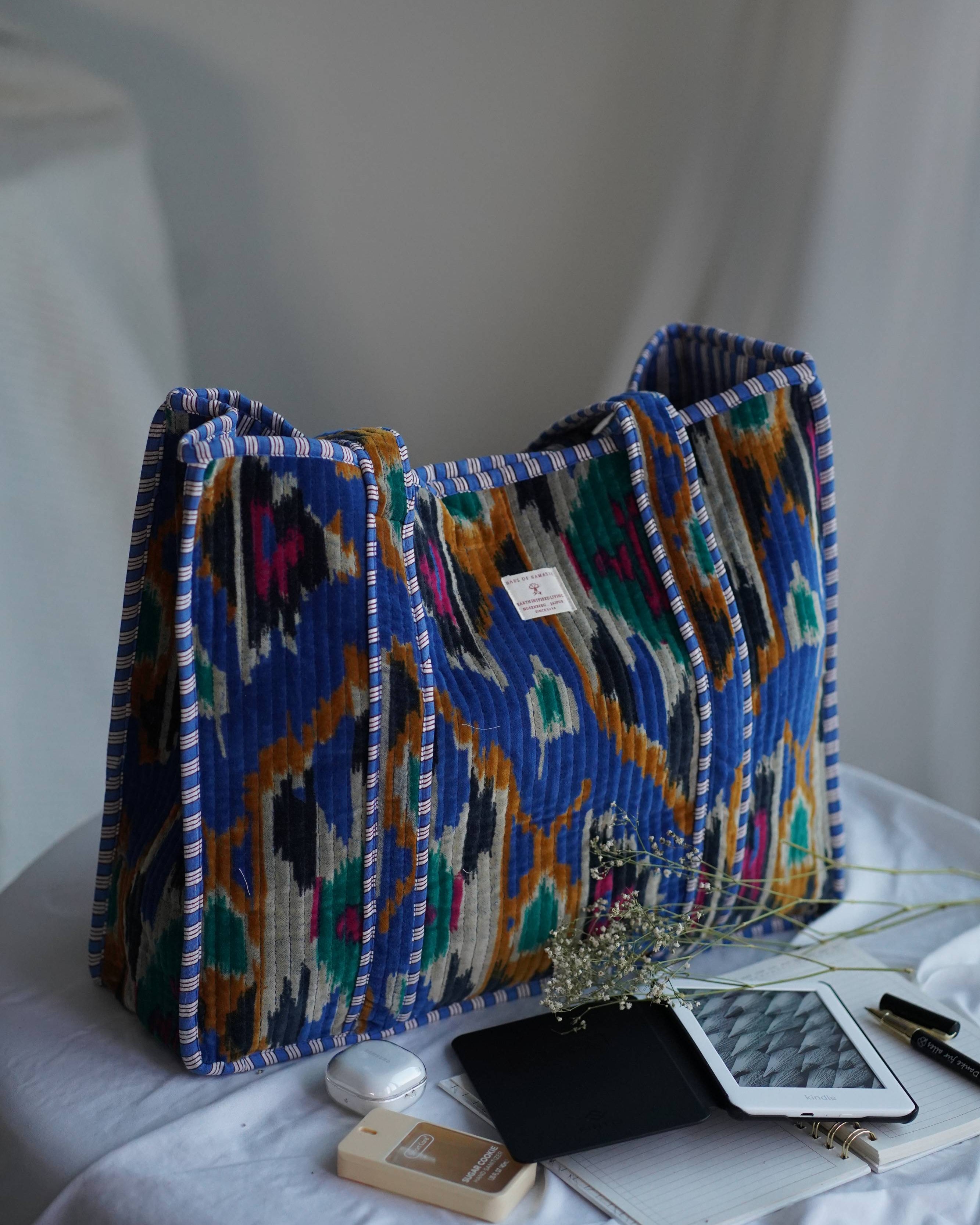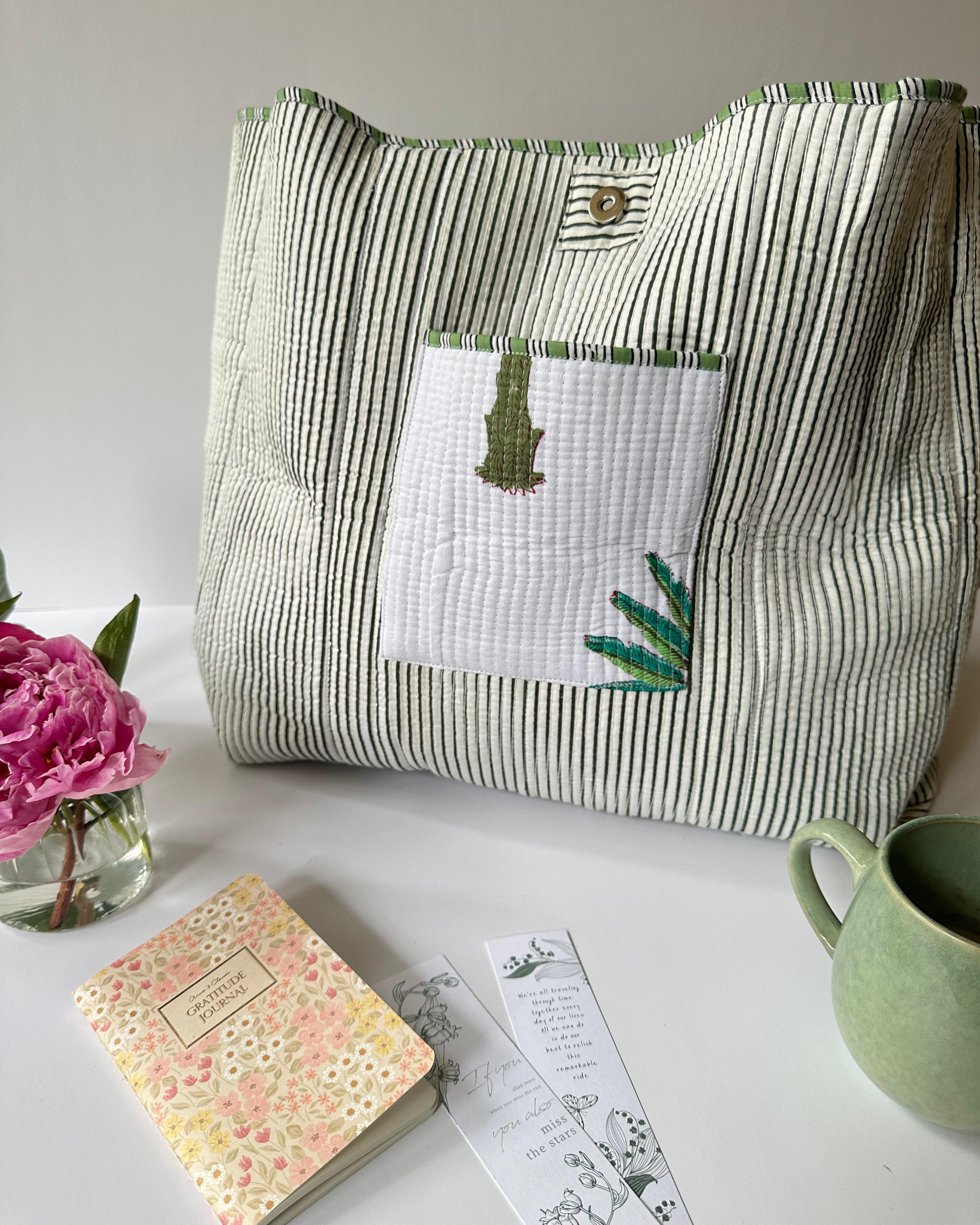 handgefertigt. Die farbenfrohen Blumenmuster werden per Handblockdruck auf die Wendetaschen