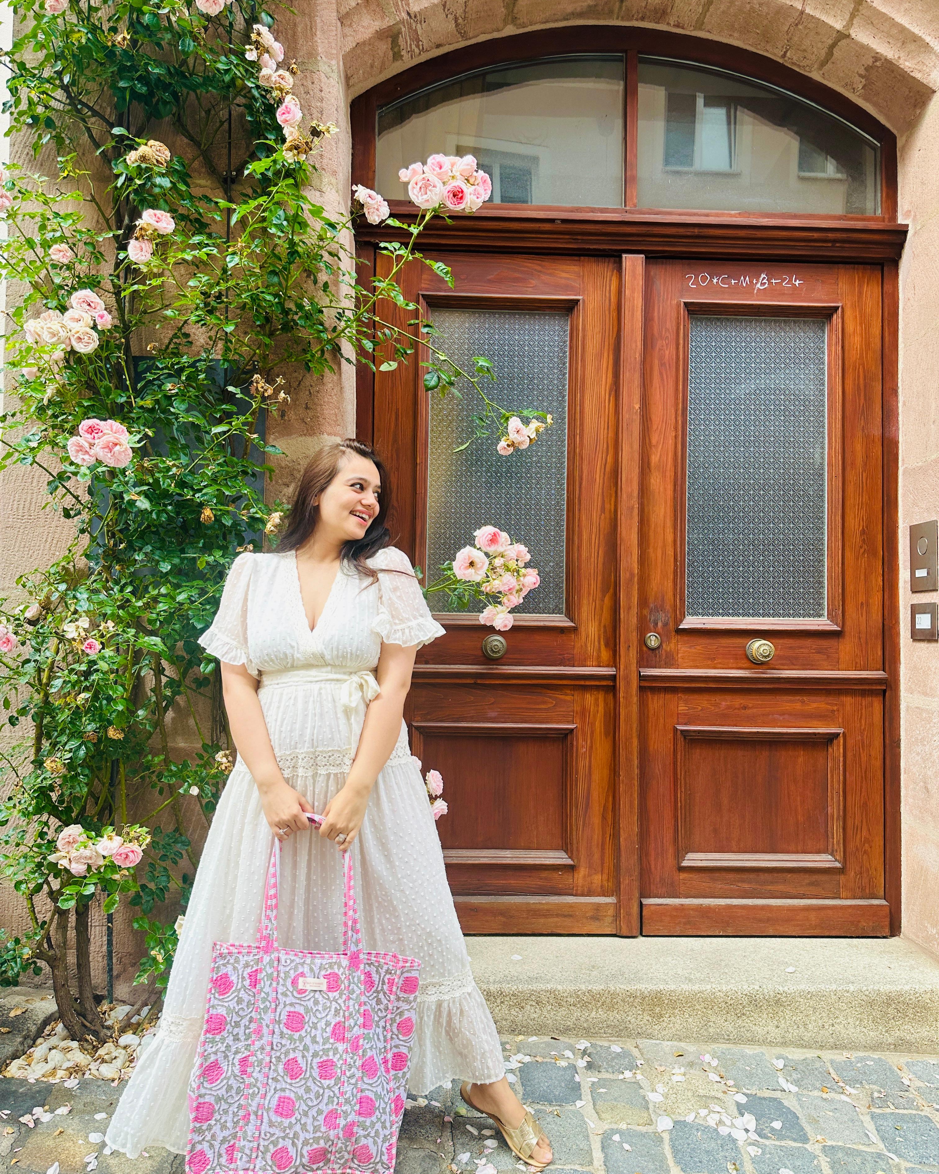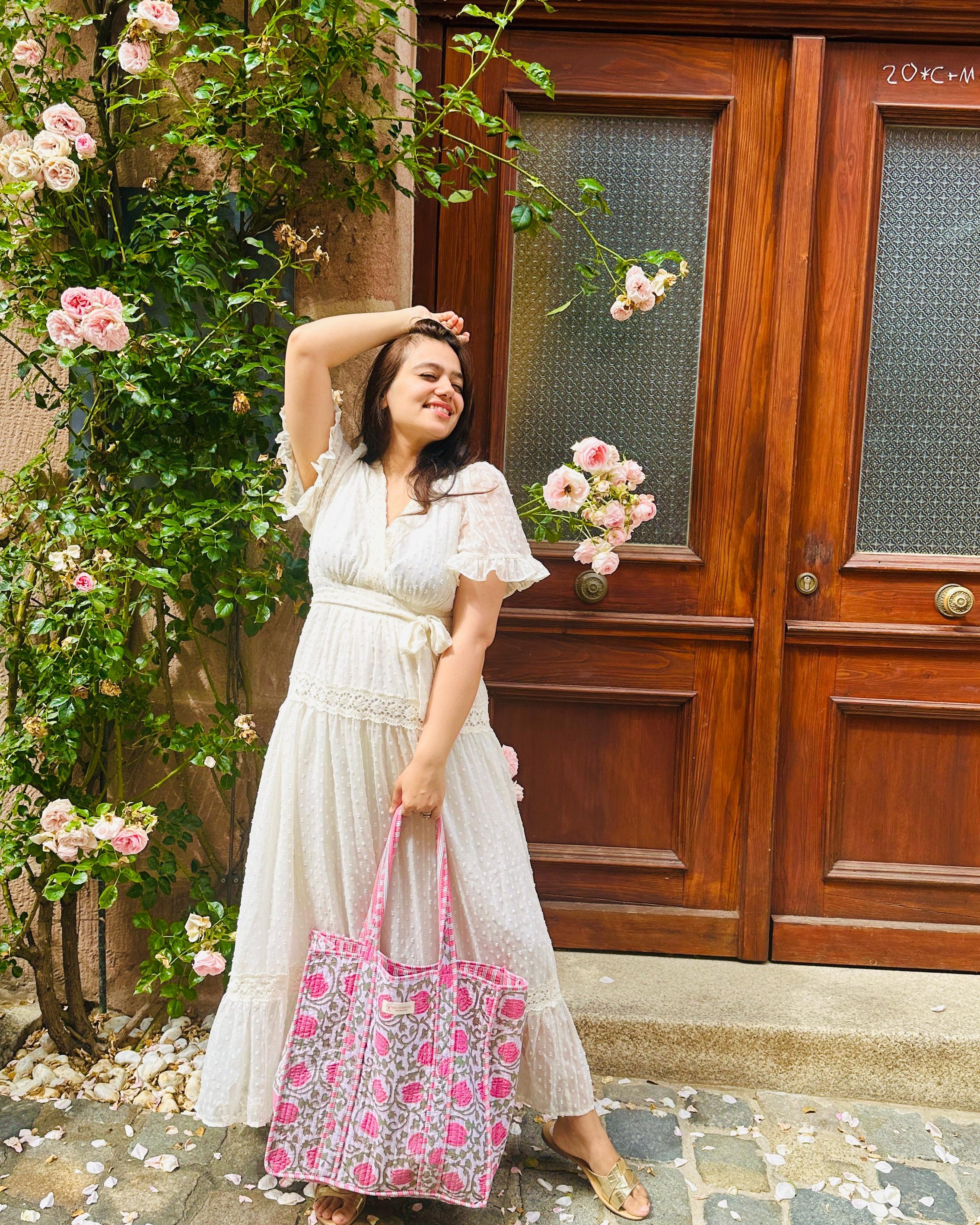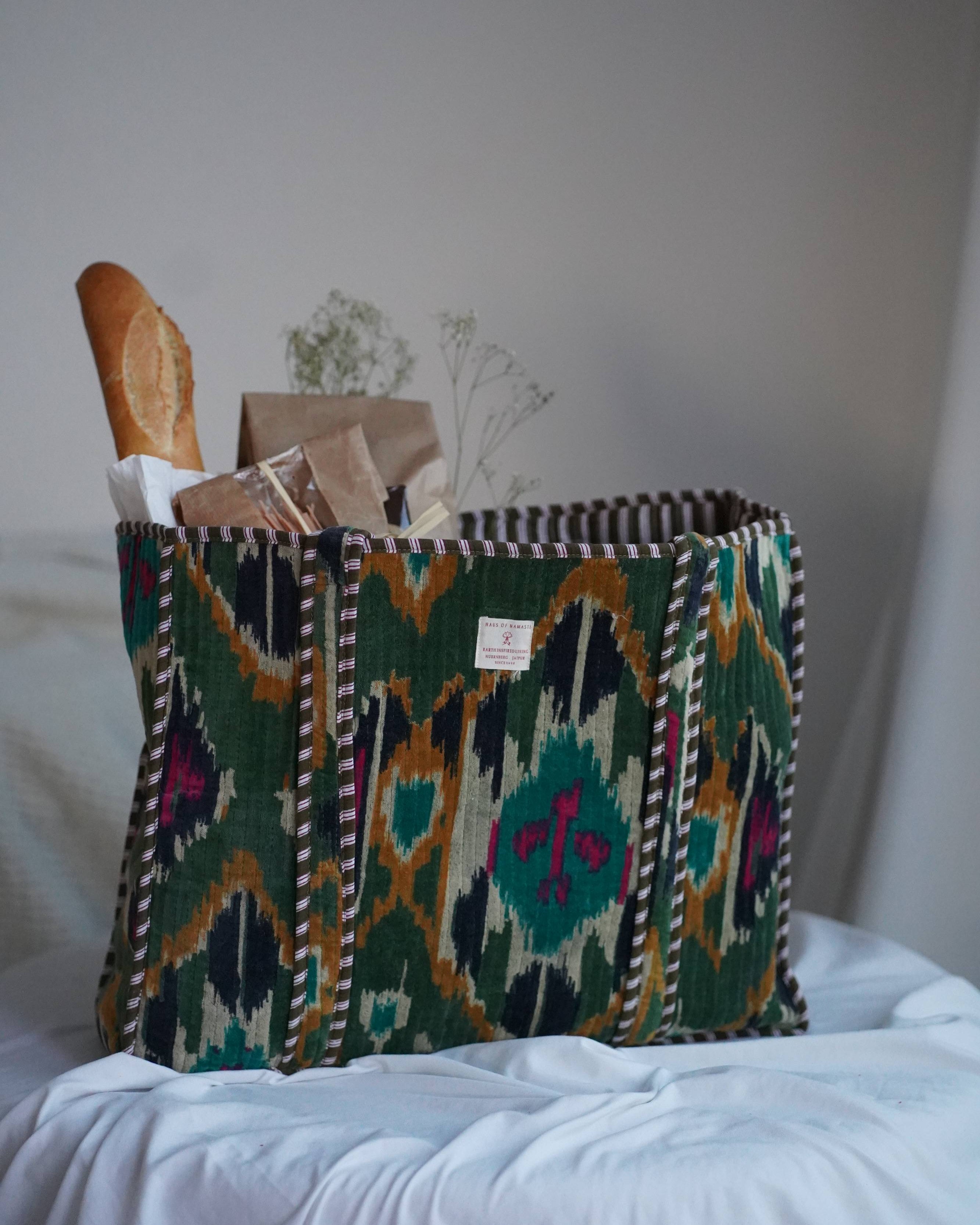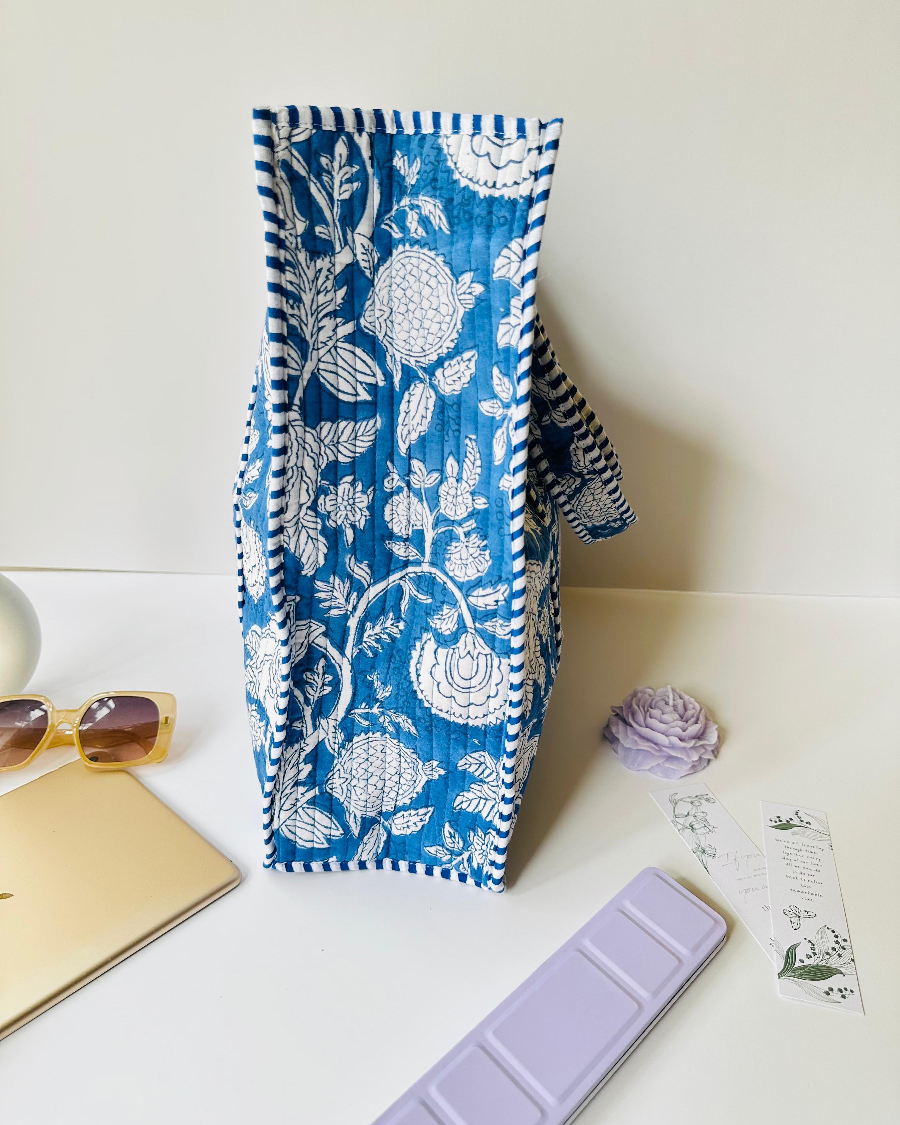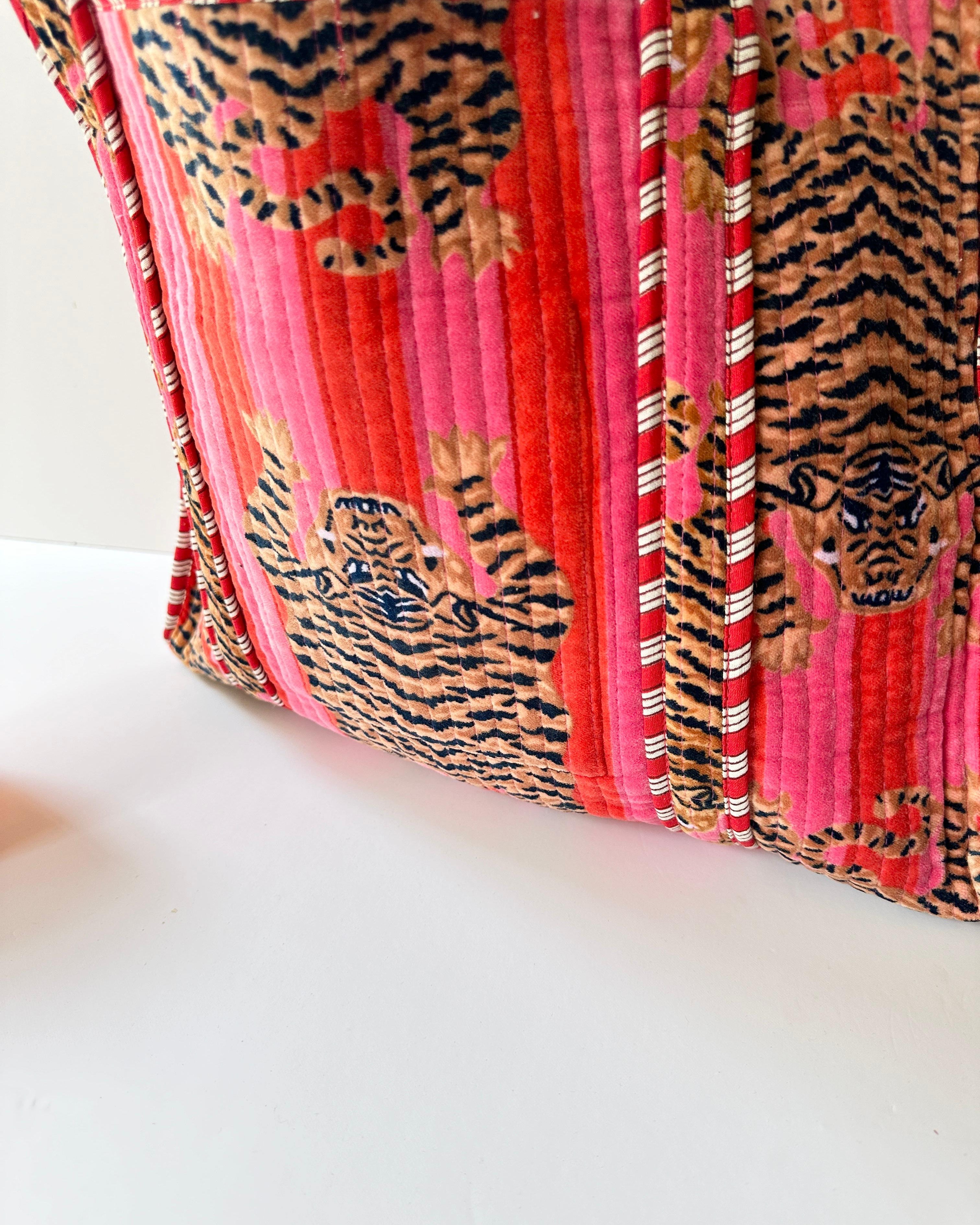 handgefertigt. Die farbenfrohen Blumenmuster werden per Handblockdruck auf die Wendetaschen