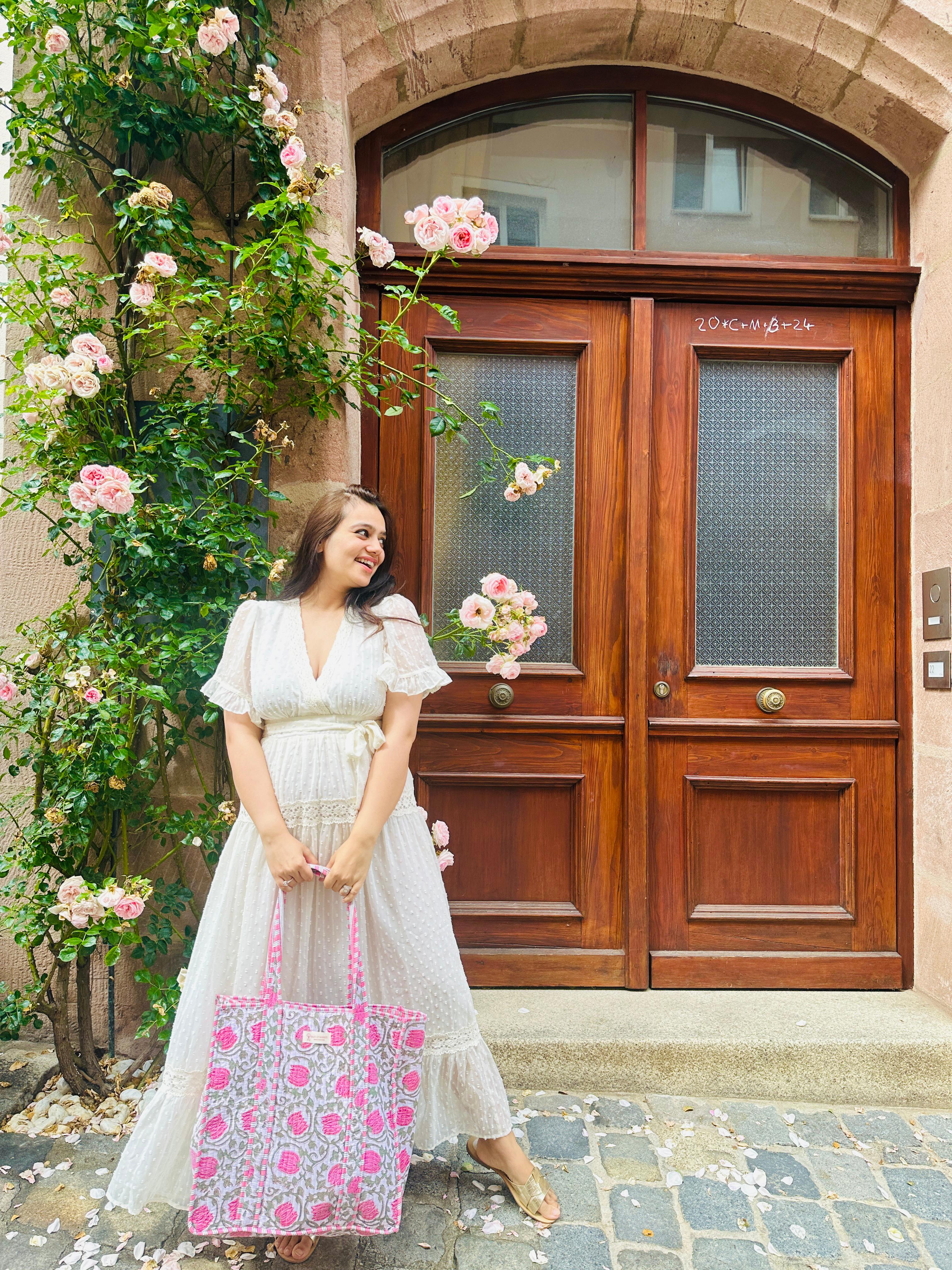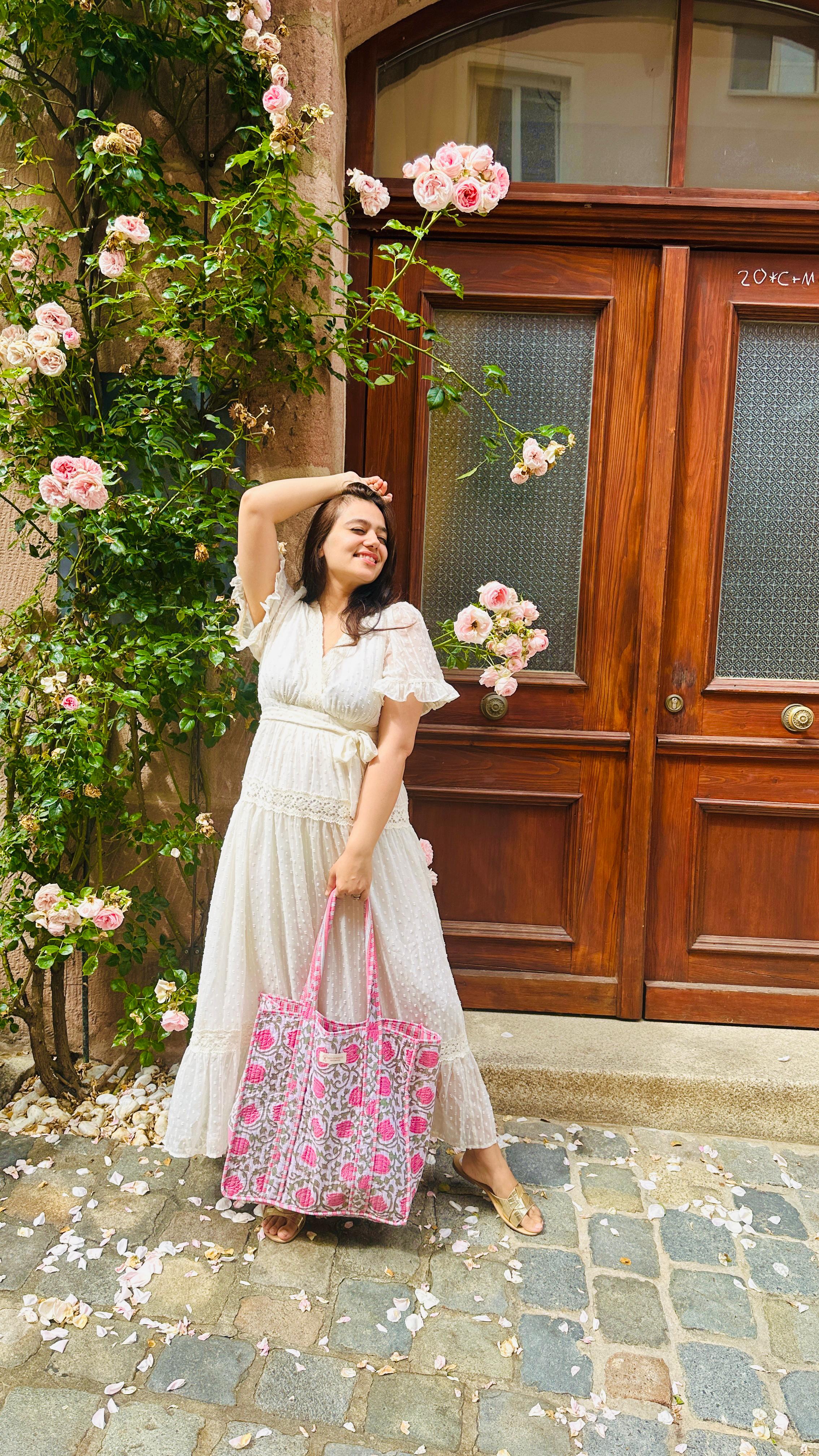 Diese handgefertigte Tragetasche aus 100 % Baumwolle ist ein wahres Meisterwerk traditioneller Handwerkskunst. Mit viel Liebe zum Detail wurde sie in Indien sorgfältig per Handblockdruck verziert.
