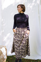 Der Naina-Rock – ein zeitloser schwarz-weißer Blumenblockdruck auf Bio-Baumwolle.