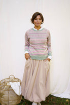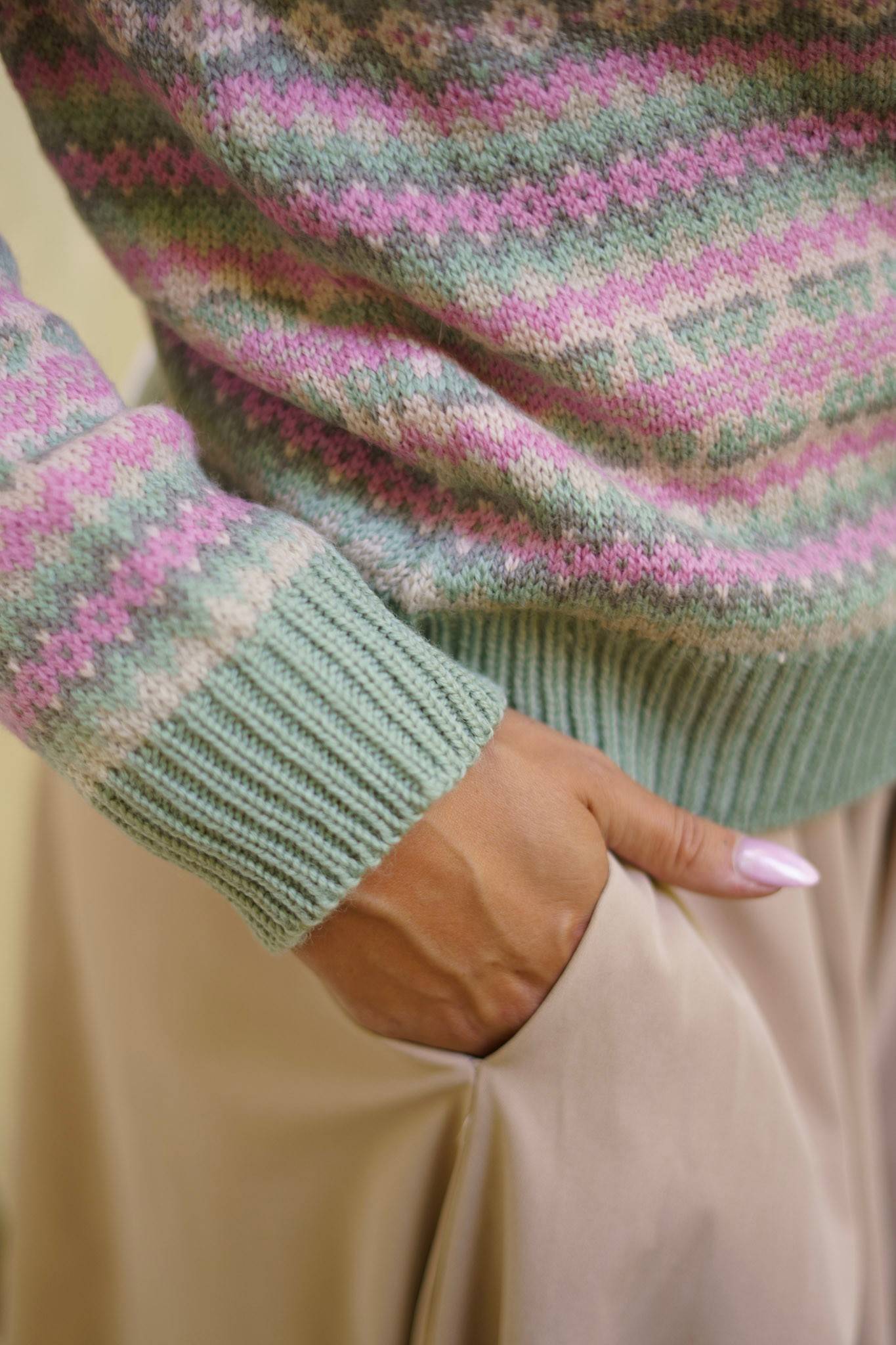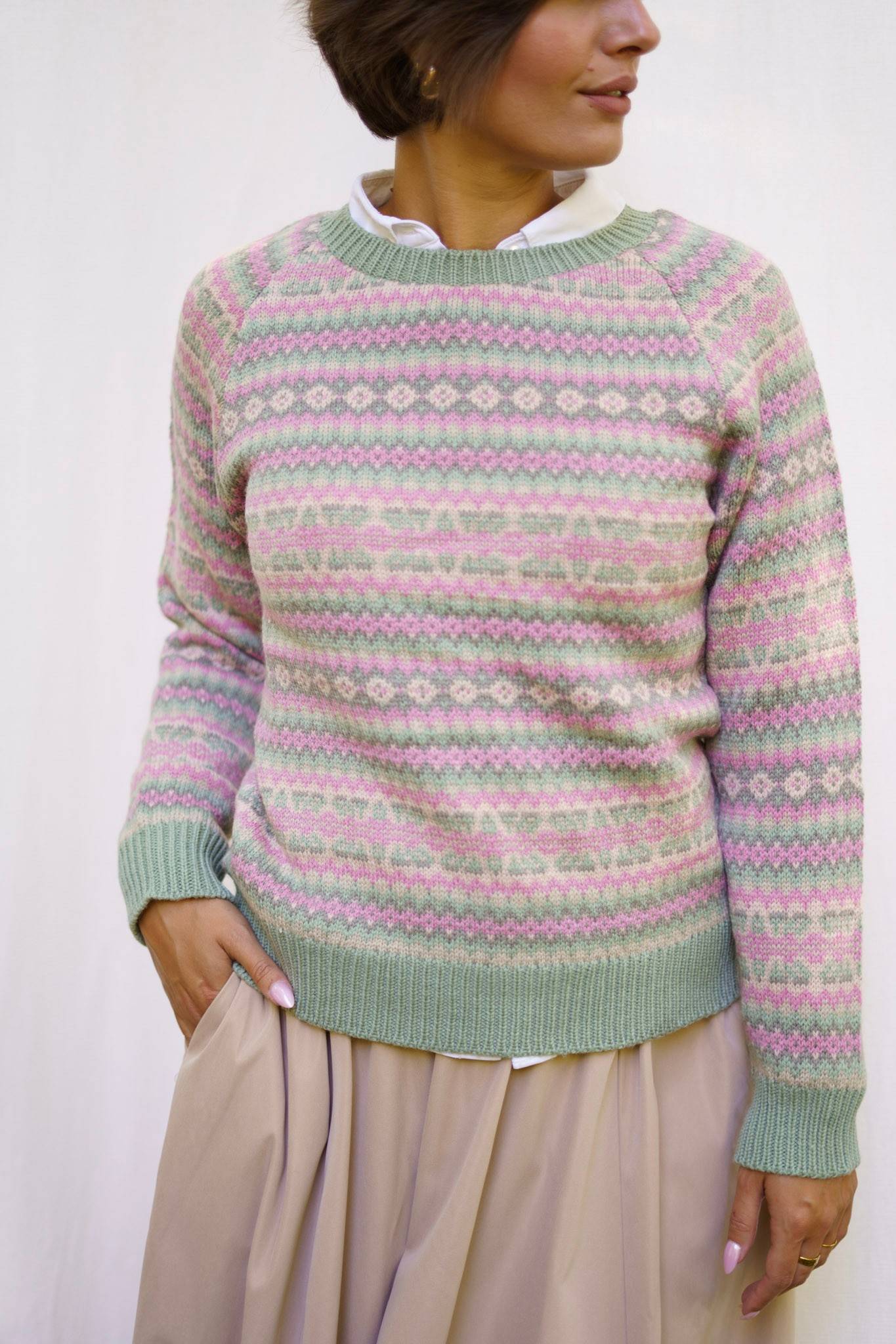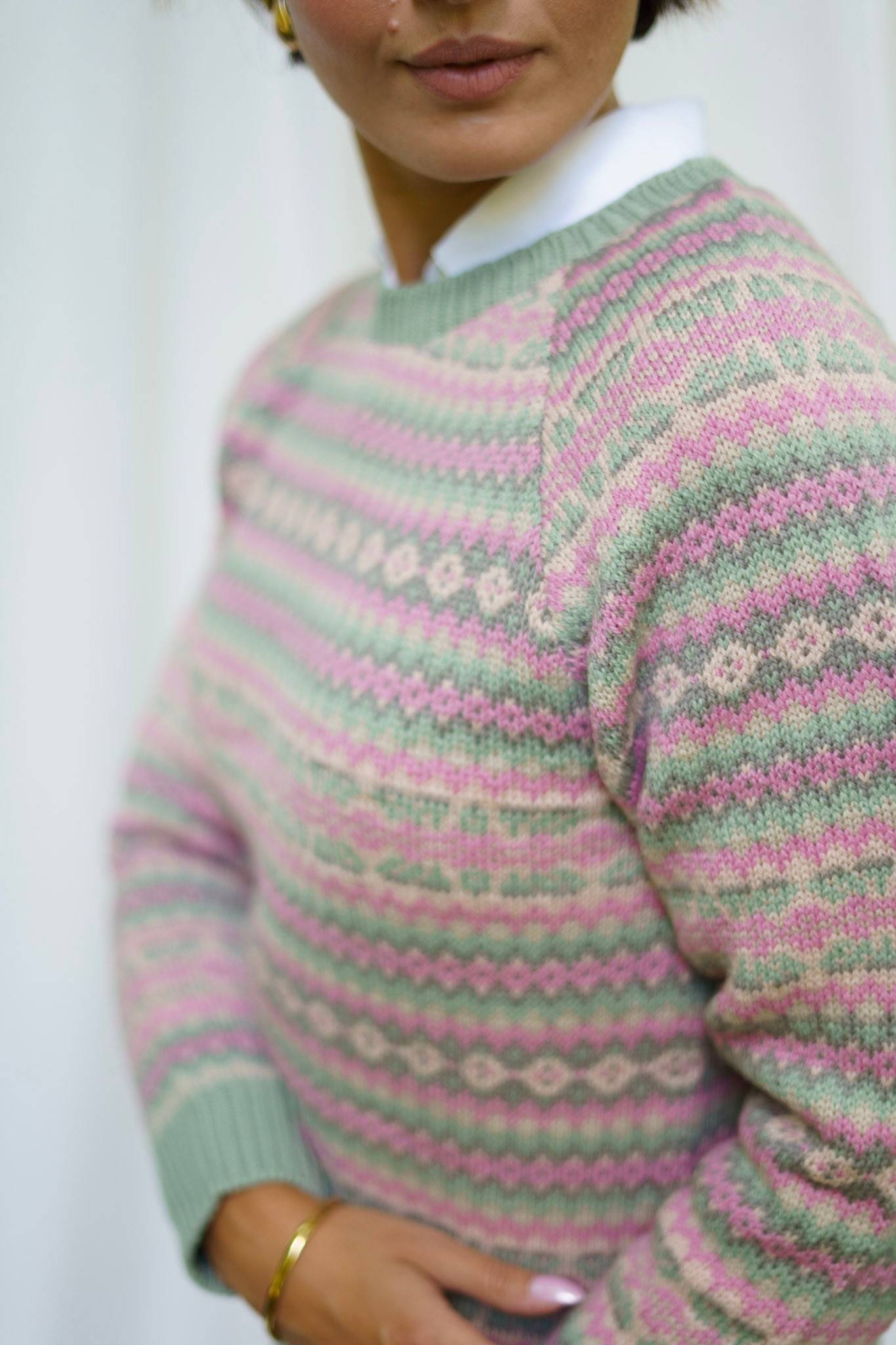 Hand-spun from 100% Himalayan lamb wool and crafted by artisans in Nepal, this sustainable Sweater is as timeless as it is cosy. The subtle sage green base is beautifully accented with an elegant Fair Isle pattern and a delicate pop of pink, adding warmth and charm to your fall-winter wardrobe.