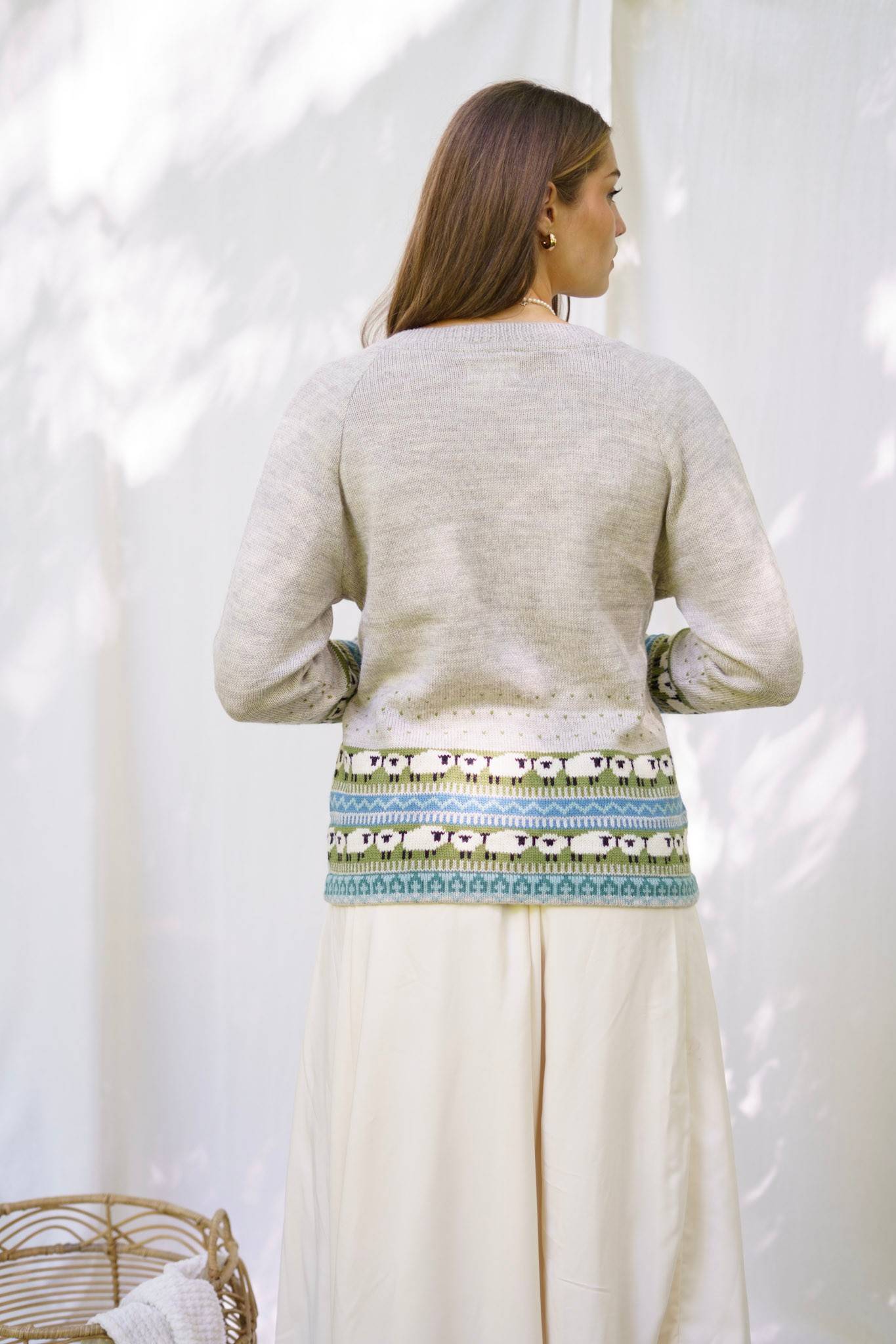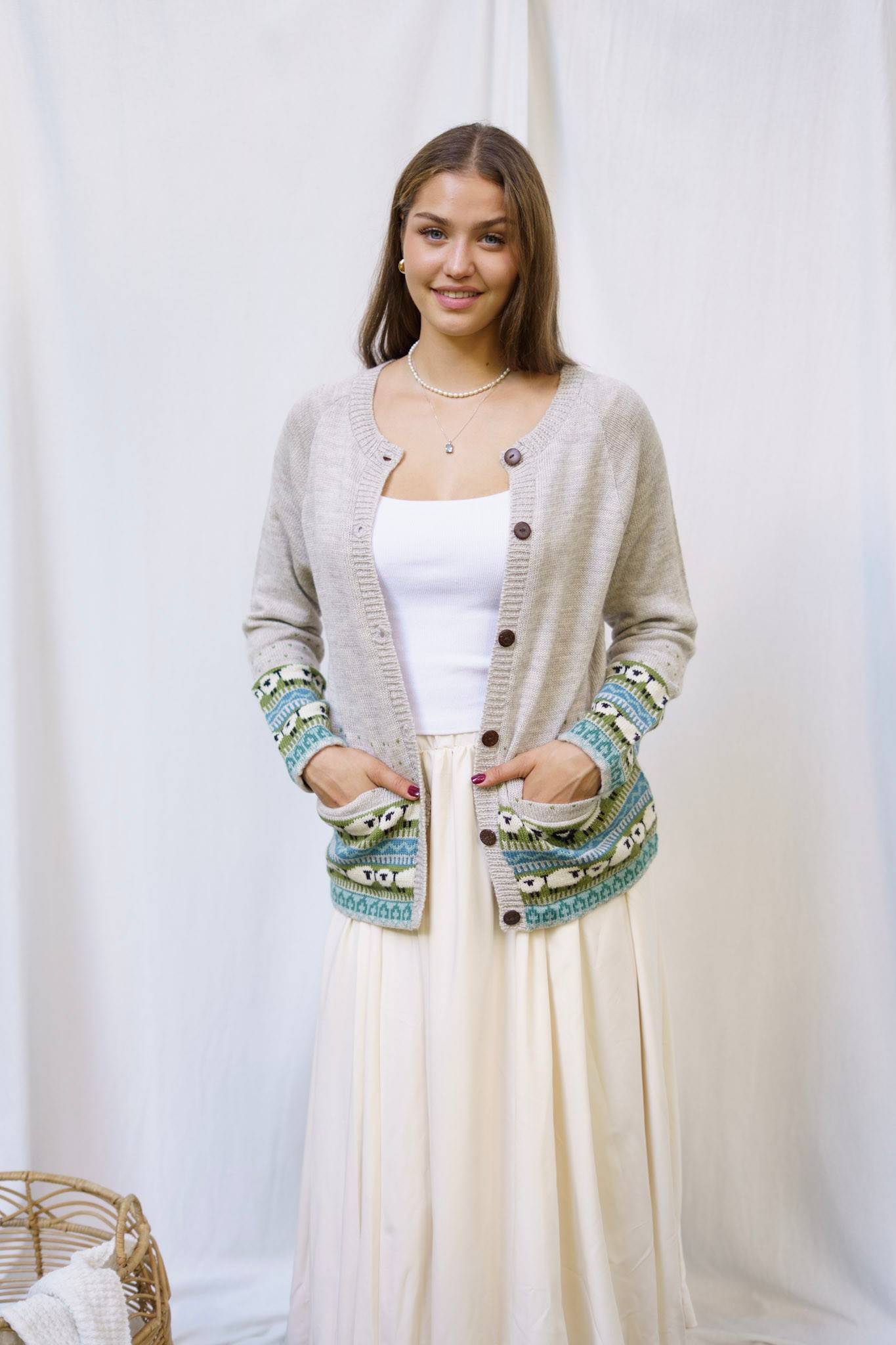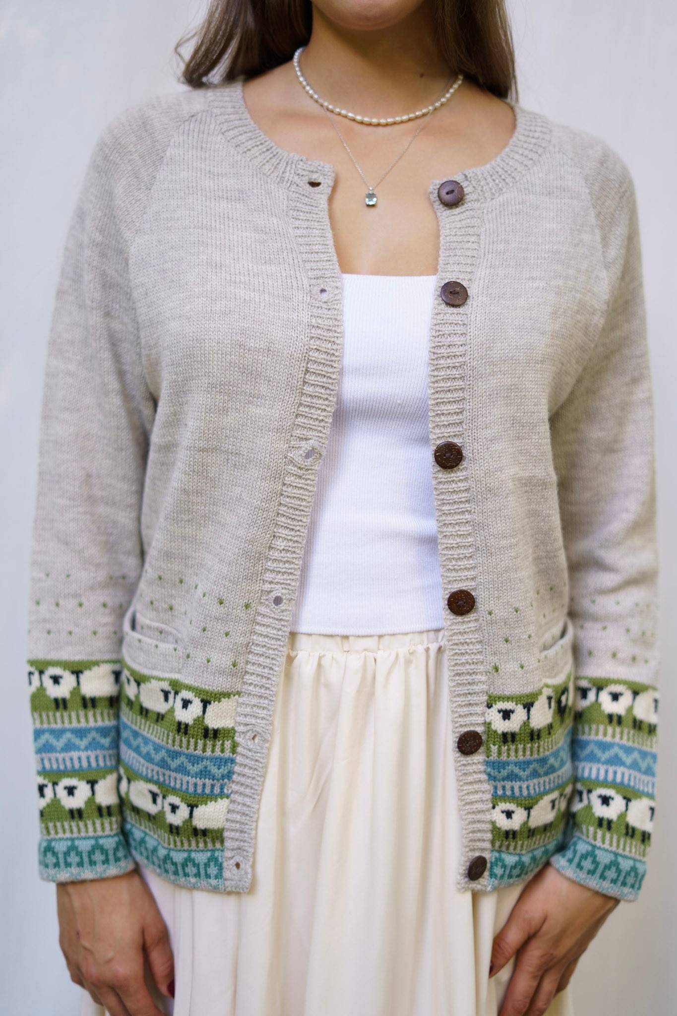 Say hello to our 100% pure Himalayan lamb wool, hand-spun sweater Cardigan . What makes it truly special is the charming sheep design along the hem, adding a touch of playfulness.