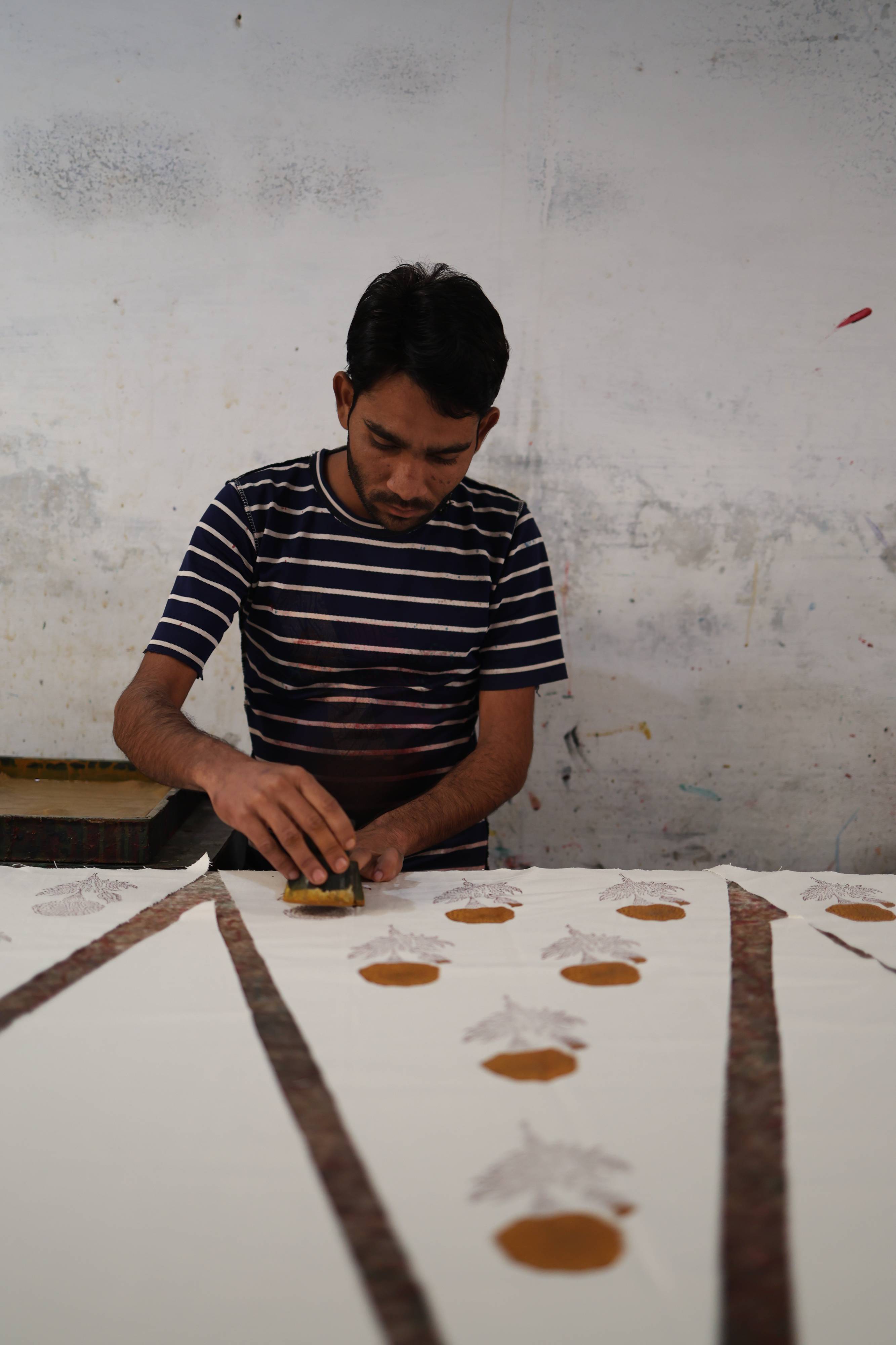 Wir arbeiten mit kleinen Manufakturen und Kunsthandwerkern zusammen, die sich der Erhaltung der jahrhundertealten Kunst des Handblockdrucks verschrieben haben.