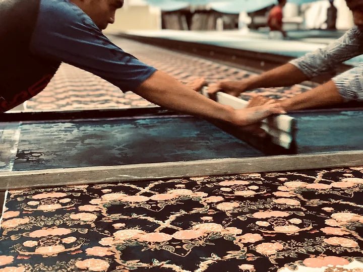 Screen Printing ist ein handintensives Handwerk, bei dem jede Designschicht sorgfältig von erfahrenen Kunsthandwerkern mit handgeschnittenen Sieben und Rakeln aufgetragen wird.