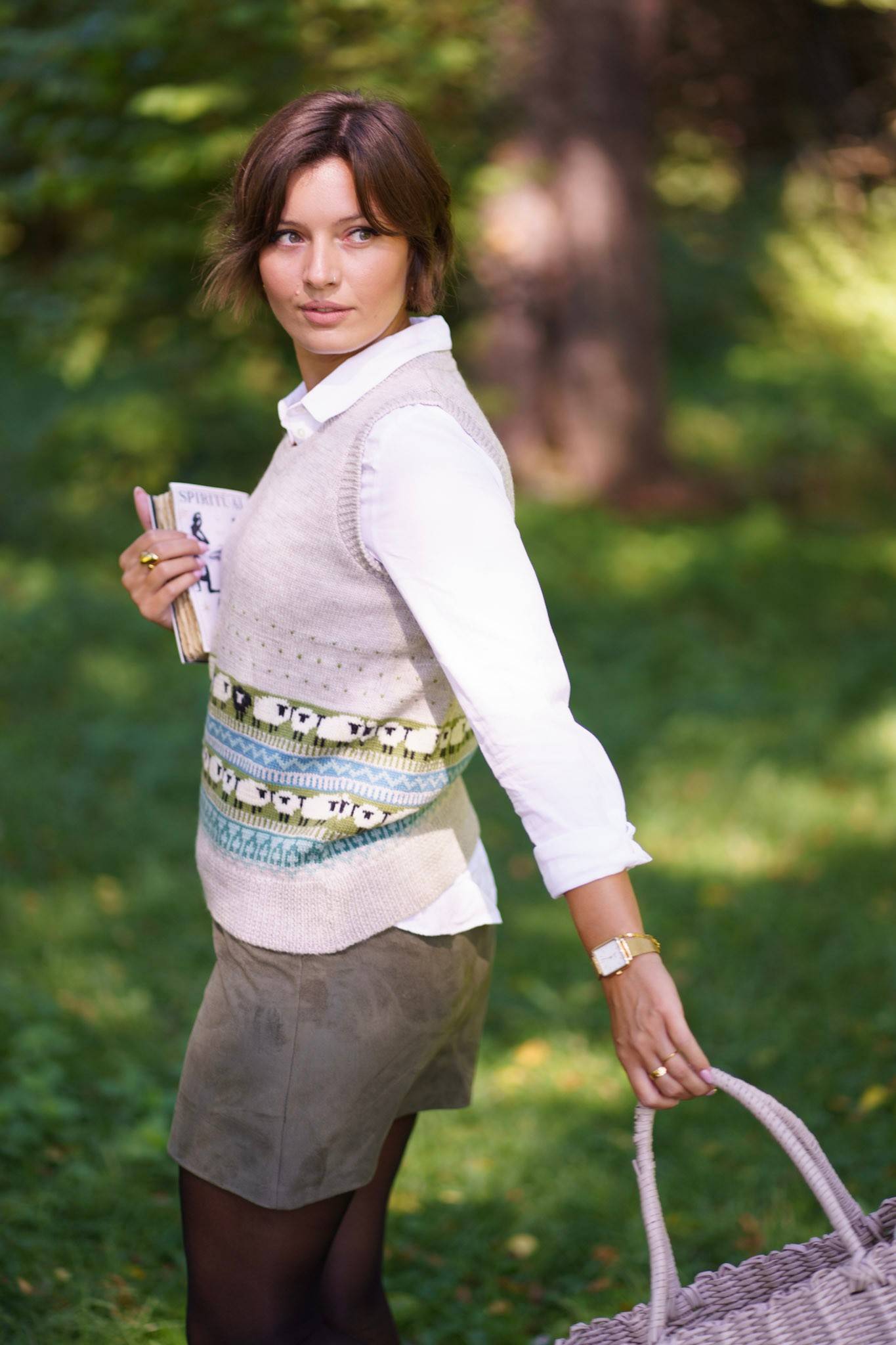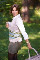 Begrüßen Sie unsere handgesponnene Pullunderweste aus 100 % reiner Himalaya-Lammwolle. Das Besondere daran ist das charmante Schafmuster am Saum, das für einen Hauch Verspieltheit sorgt.