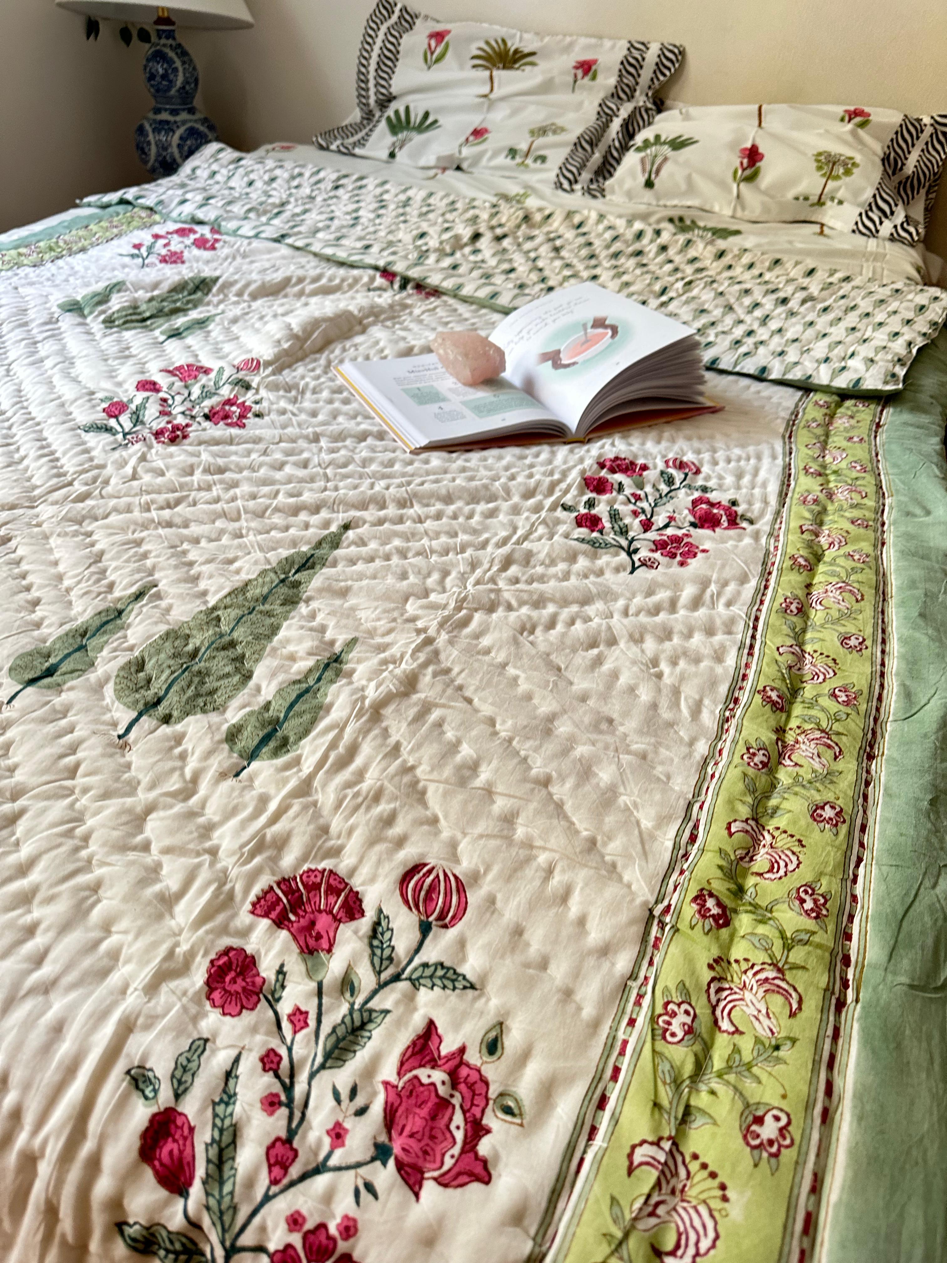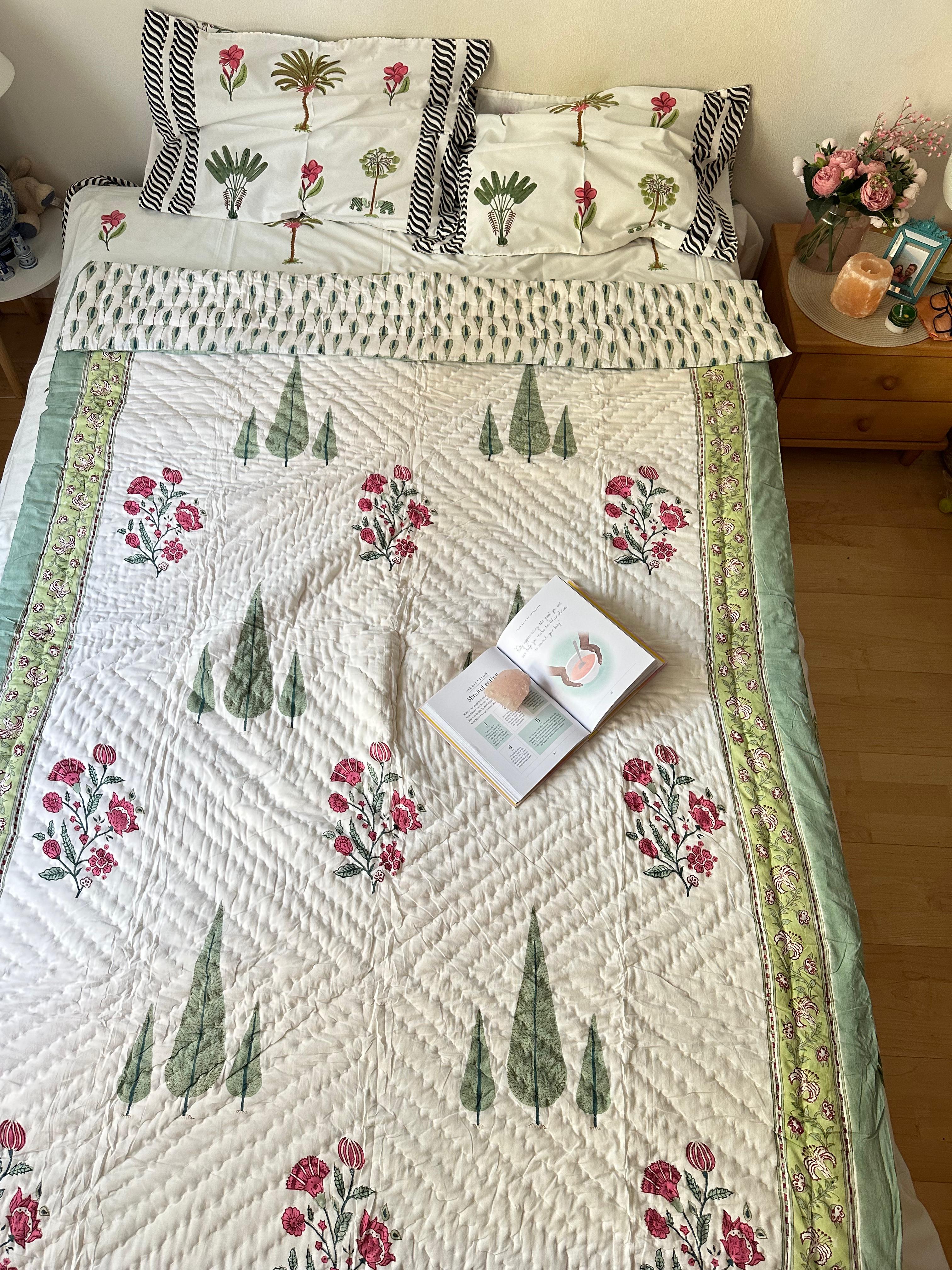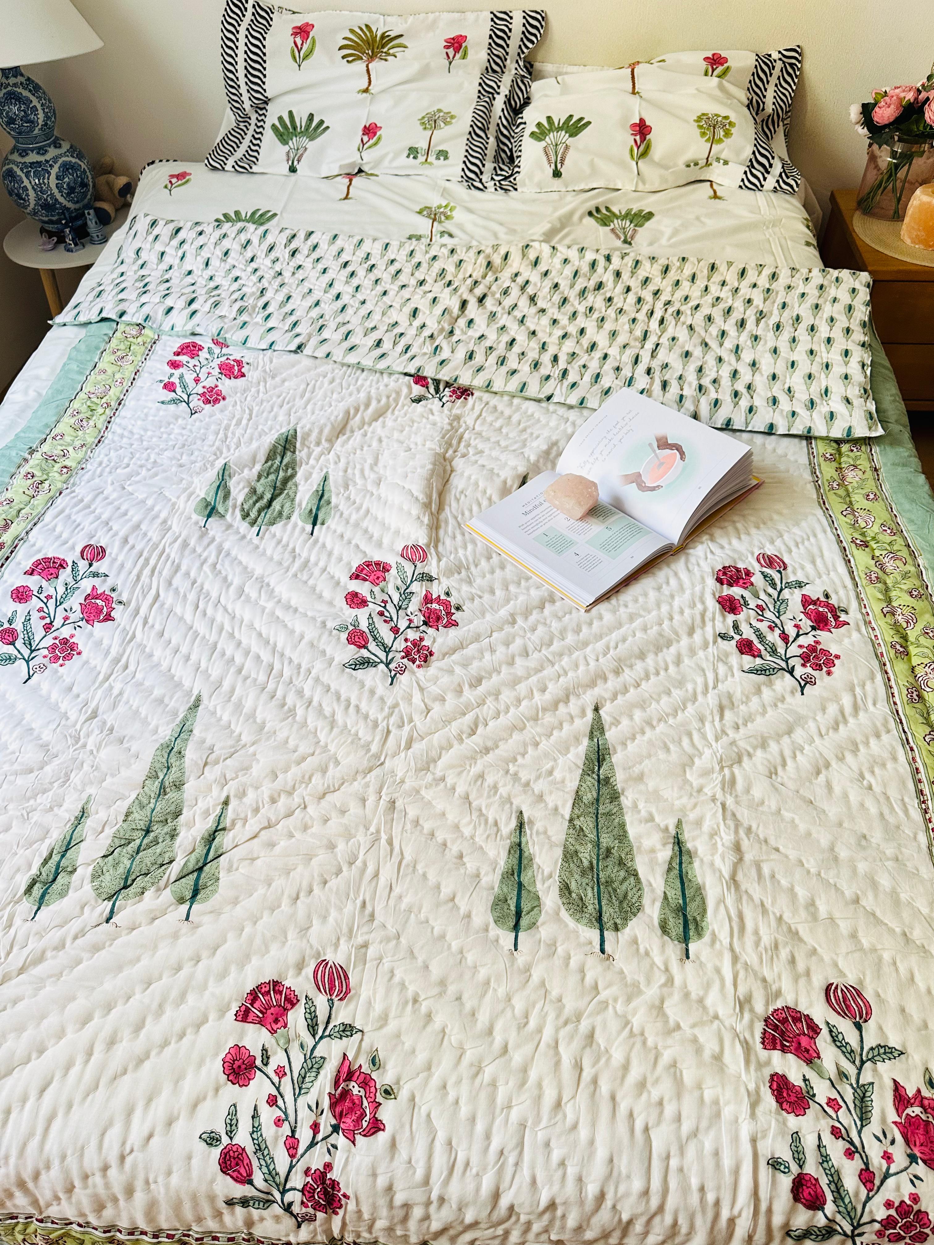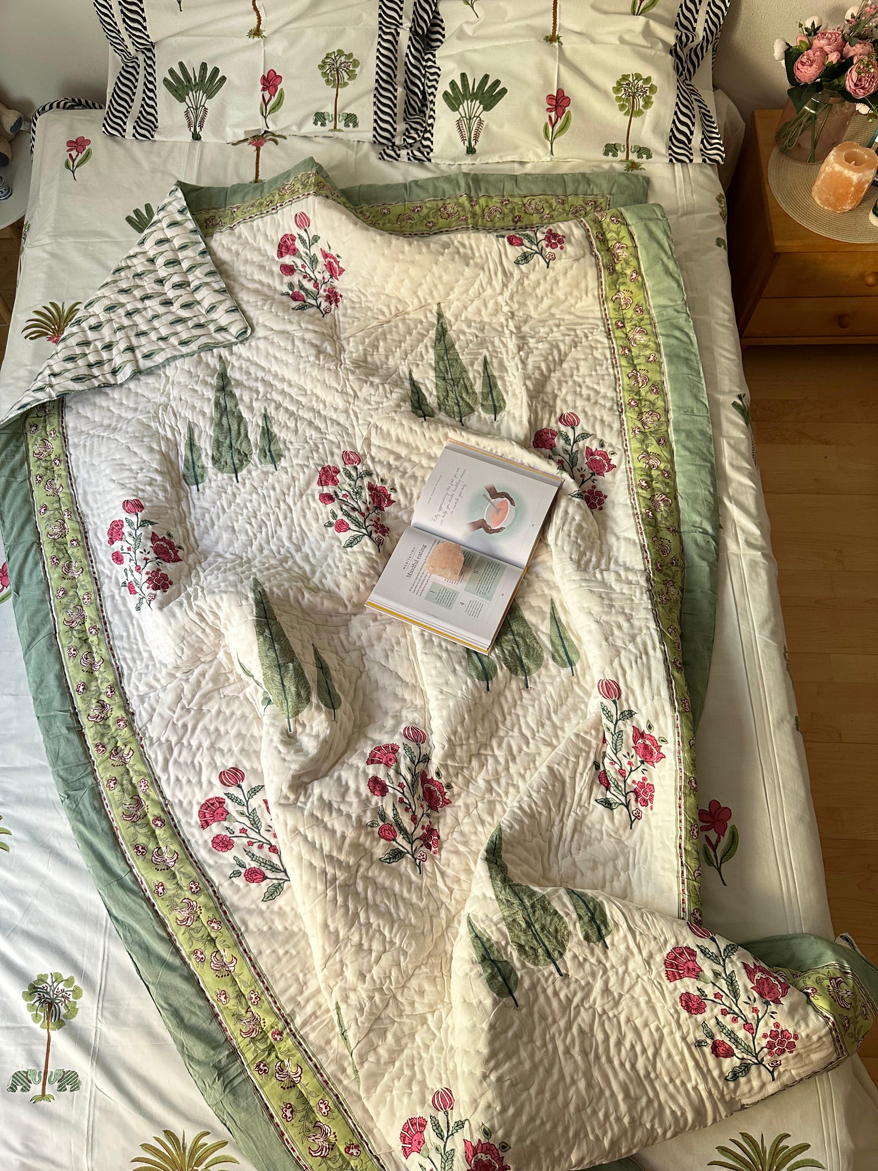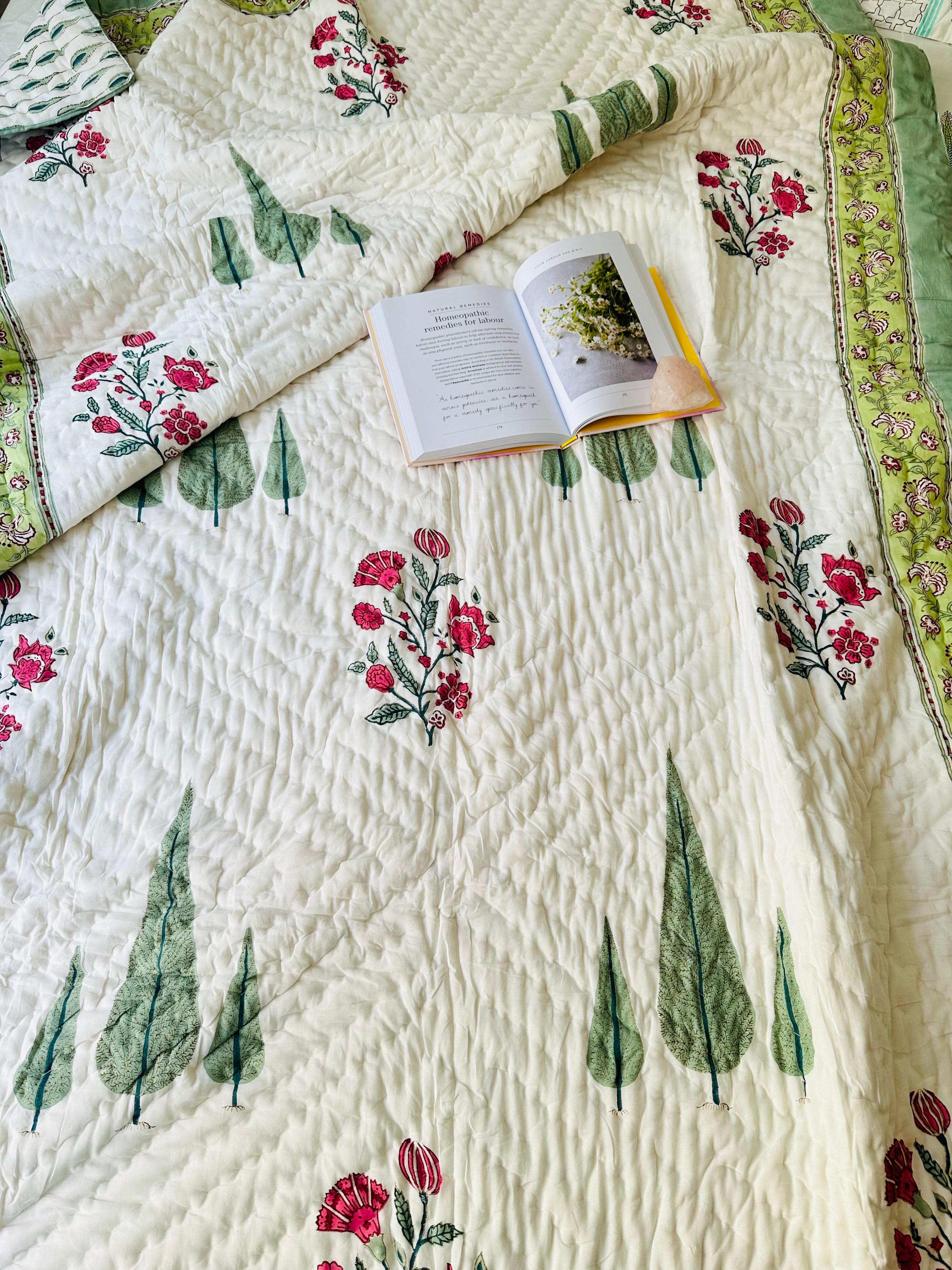 Entdecken Sie den bezaubernden Reiz unserer Ganzjahresdecke, die mit eleganten Zypressen und rosa Blumen geschmückt ist, die sorgfältig im Handblockverfahren bedruckt wurden. Diese Decke aus leichter Premium-Baumwolle ist weich, leicht und perfekt für ganzjährigen Komfort.