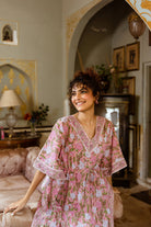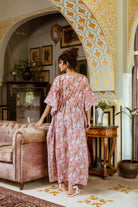 Crafted with meticulous attention to detail, our kaftan is adorned with a breathtaking pink and green floral hand block print, inspired by the vibrant beauty of a blooming flowerbed.