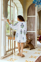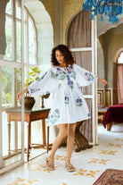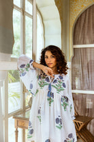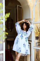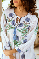 Introducing our stunning Indian Cotton Short Dress, adorned with a delicate Himalayan Blue Poppy hand block print. The intricate detailing captures the essence of these rare flowers, their petals unfurling in a dance of grace and beauty.