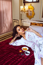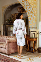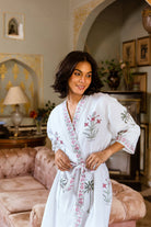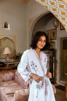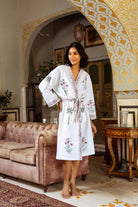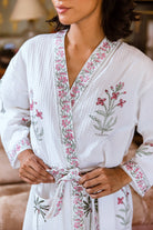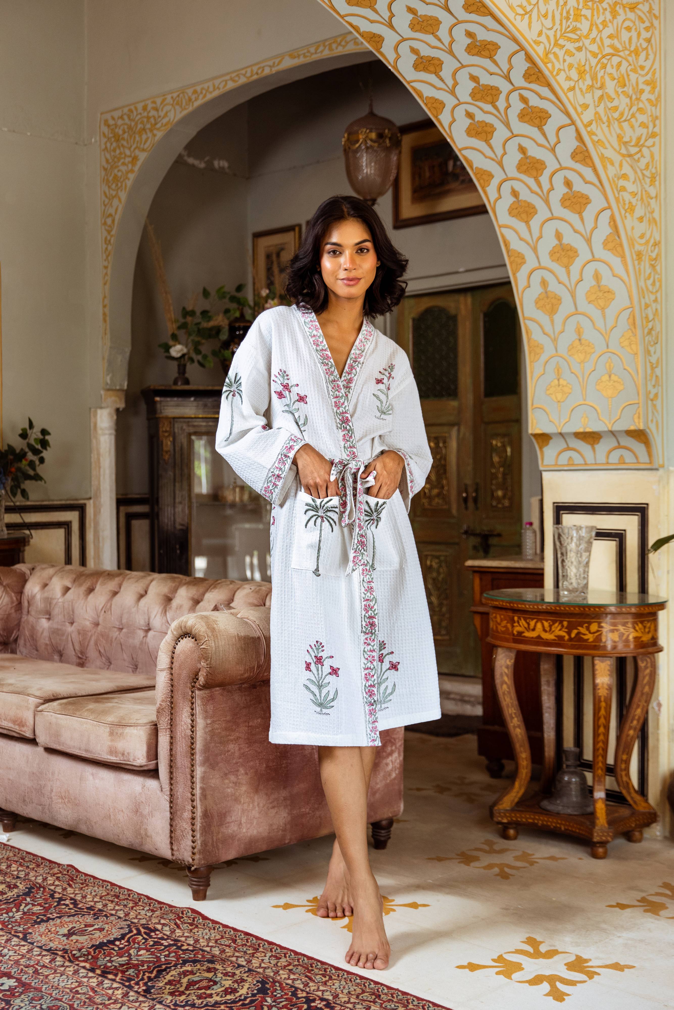 Inspired by the serene beauty of palm trees and exotic flowers, our hand blocked "Palm Oasis" bathrobe transports you to a tropical paradise with its vibrant hues. Whether you're unwinding after a refreshing shower or pampering yourself with a spa day at home, or simply lounging on lazy summer afternoon, this bathrobe is the epitome of comfort and sophistication.